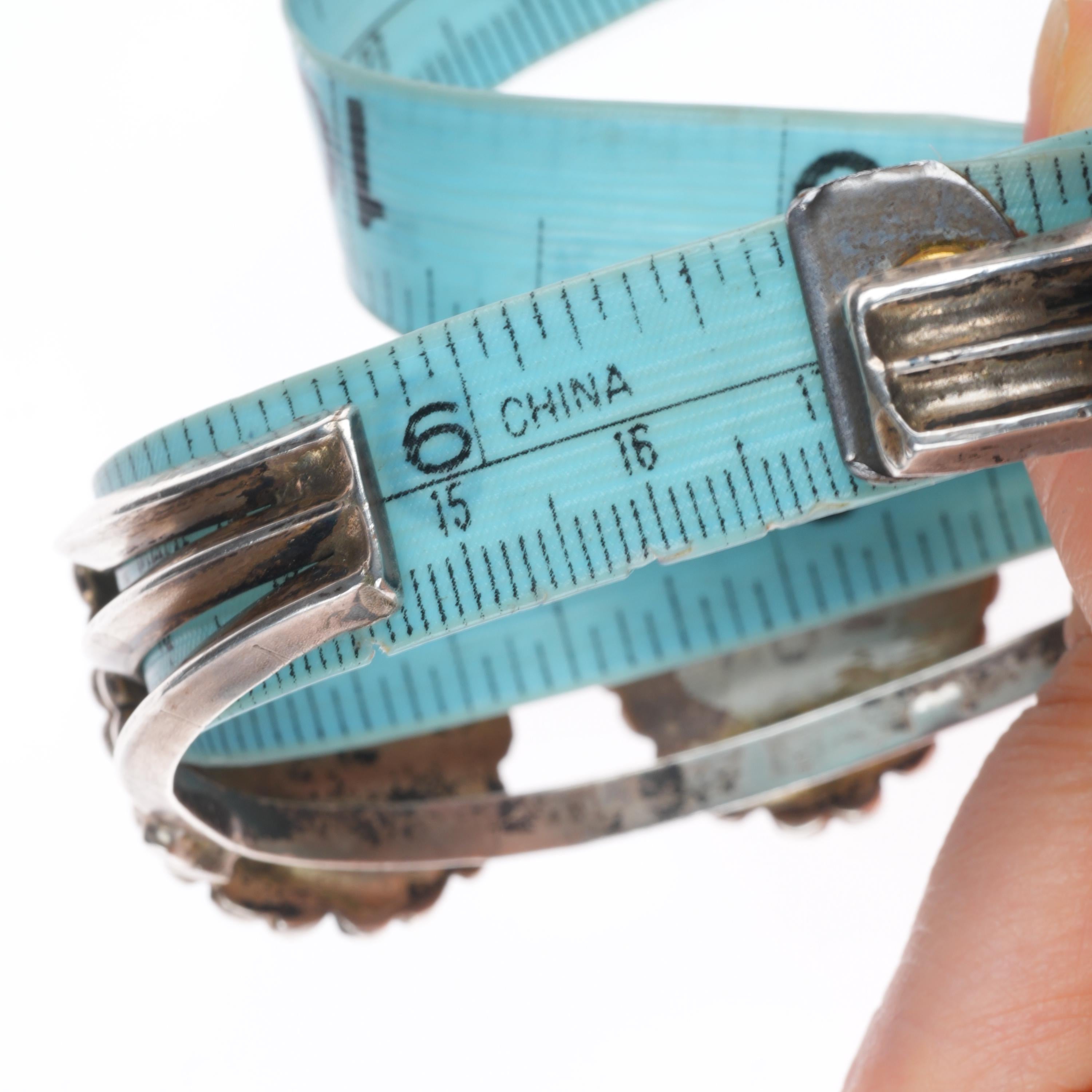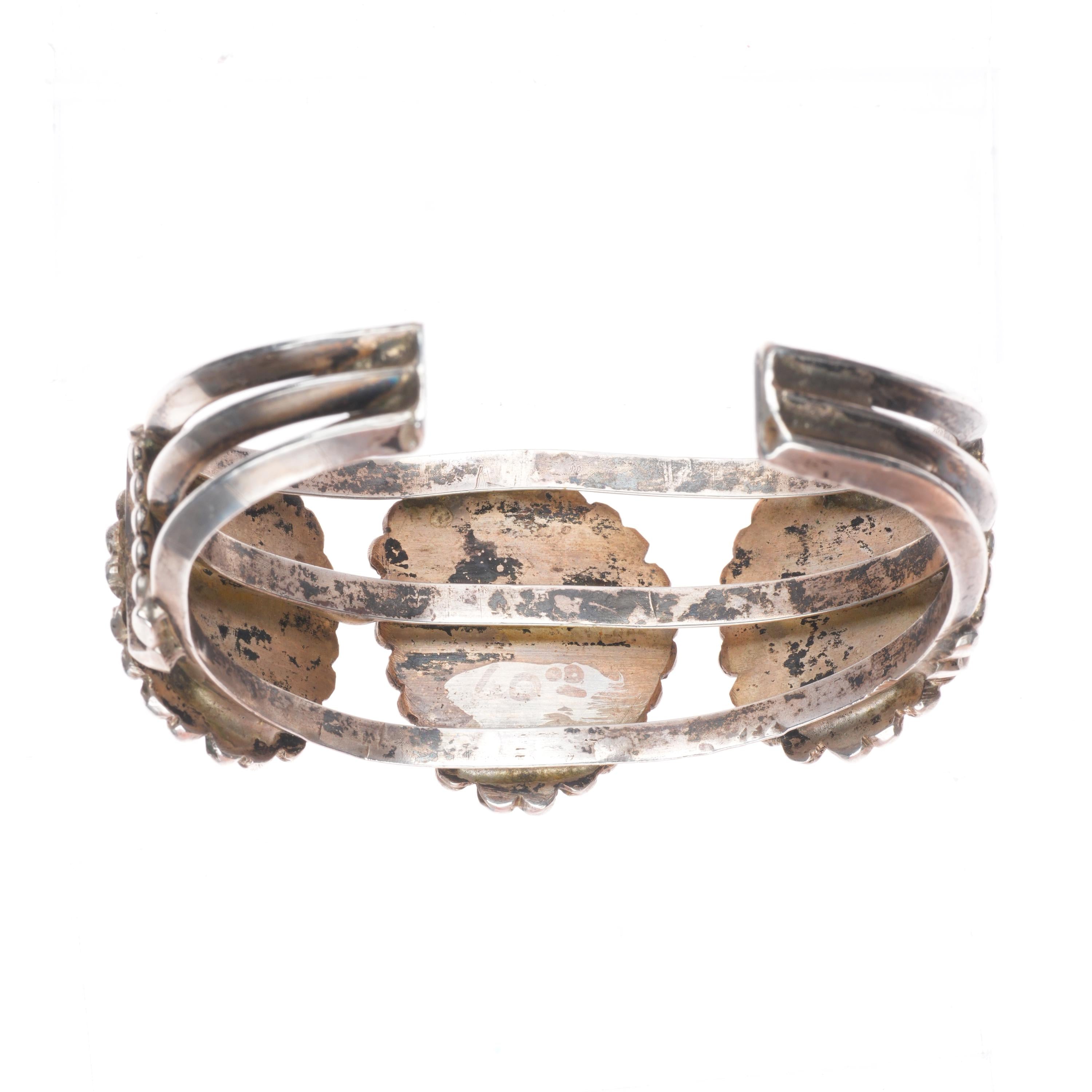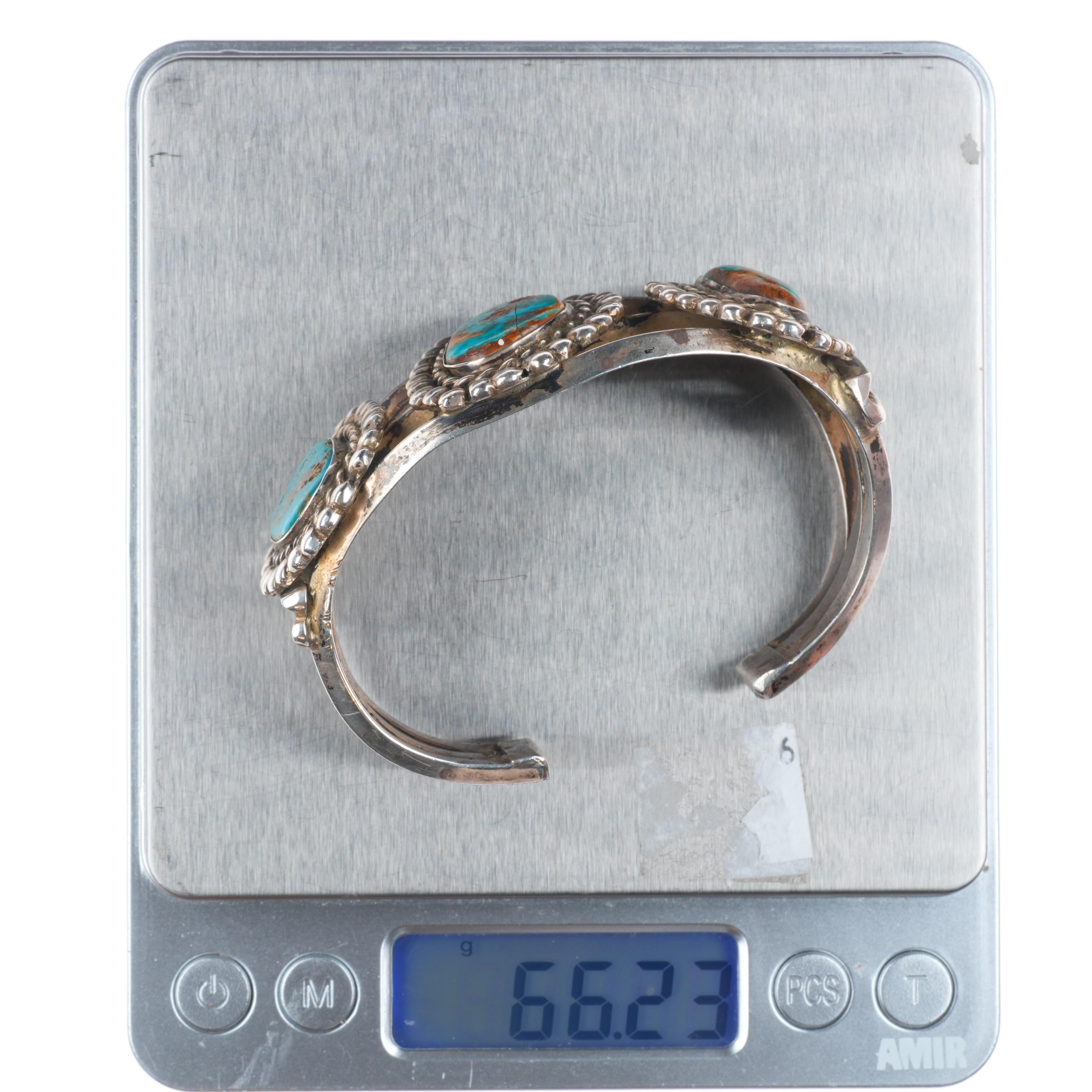 6.7" Vintage Navajo Sterling silver high grade turquoise cuff bracelet. Beautiful natural turquoise likely from a Nevada mine. Tested and guaranteed solid sterling silver with weight and measurements in pictures. Overall expected wear with apparent circa mid 20th century. Center stone with old fracture, all stones secure.