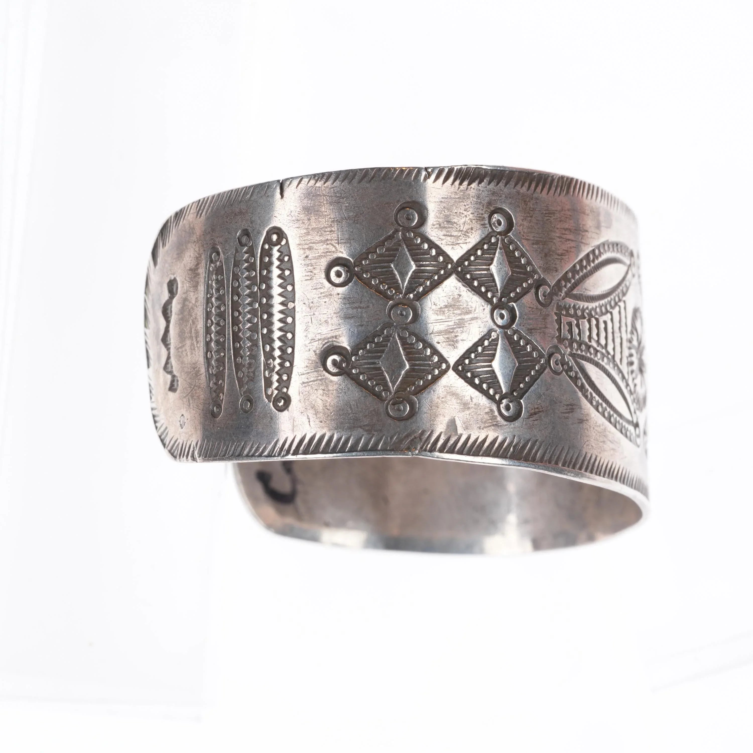 6.75" Antique Navajo Ingot silver heavily stamped wide band cuff bracelet. Tested and guaranteed solid ingot/sterling silver (90%) with weight and measurements in pictures. Good condition, circa first quarter of the 20th century.