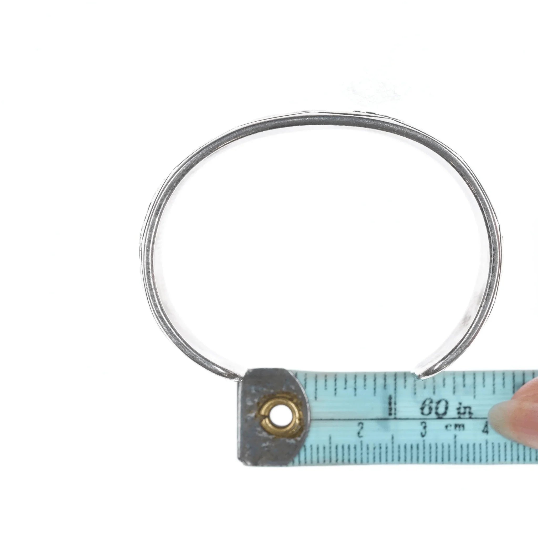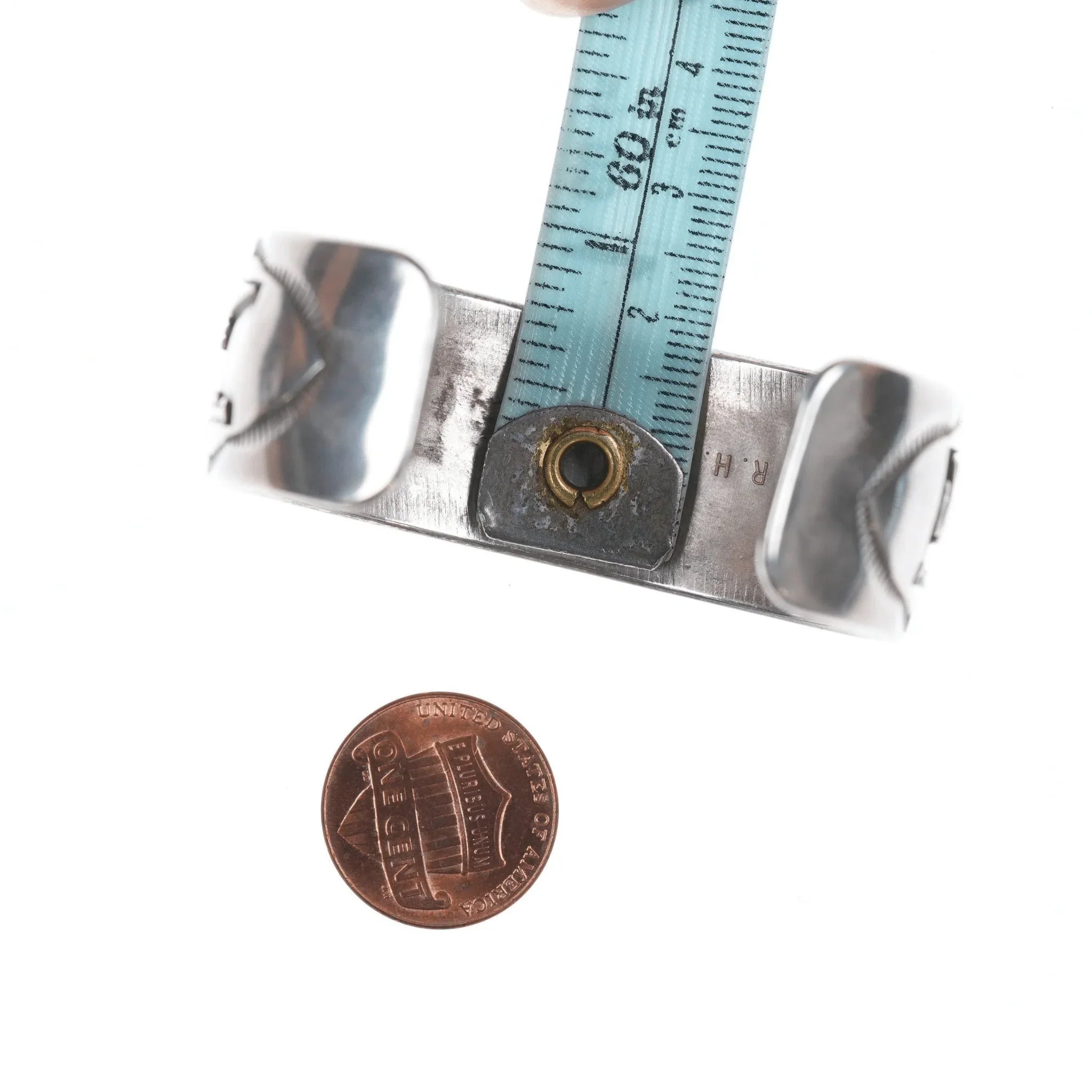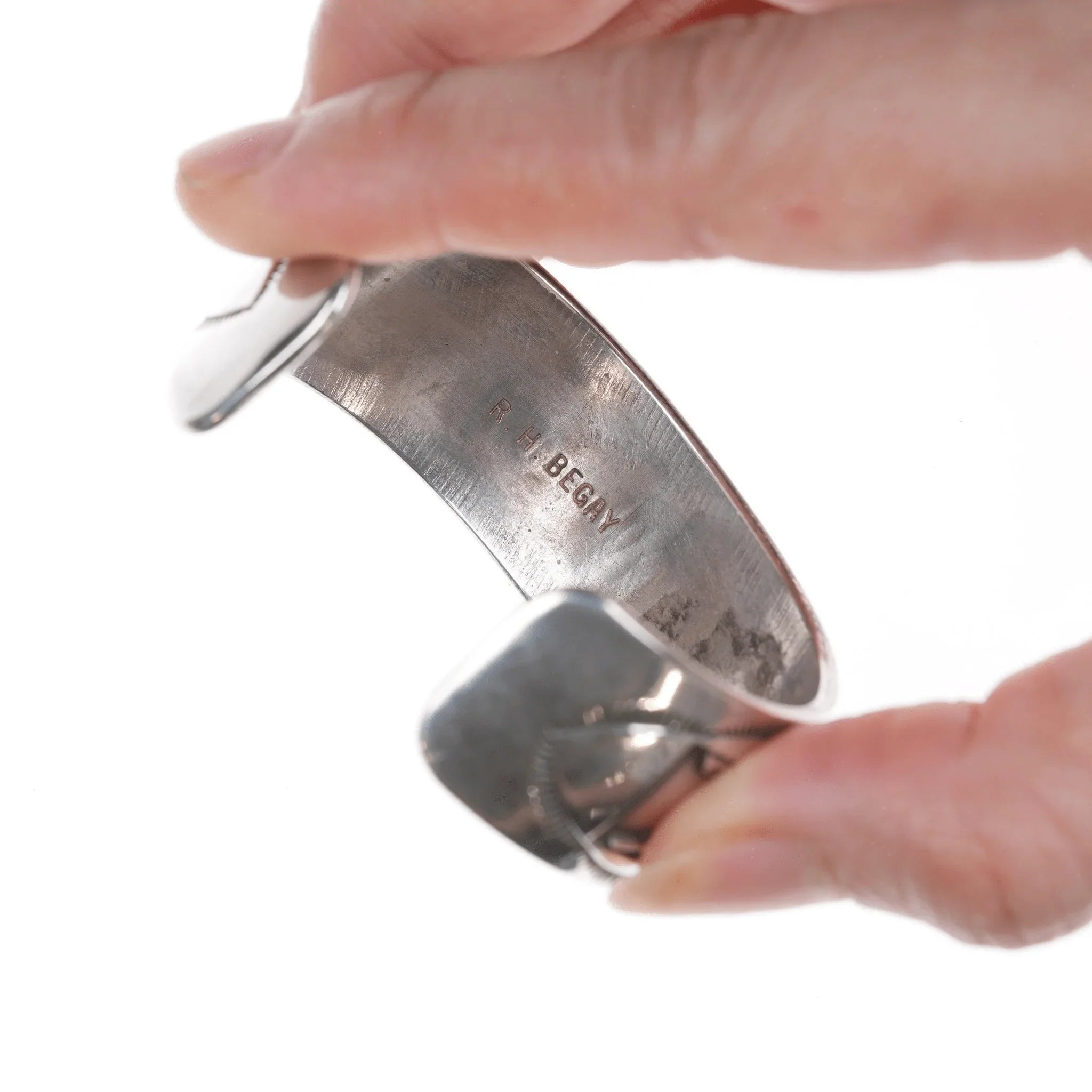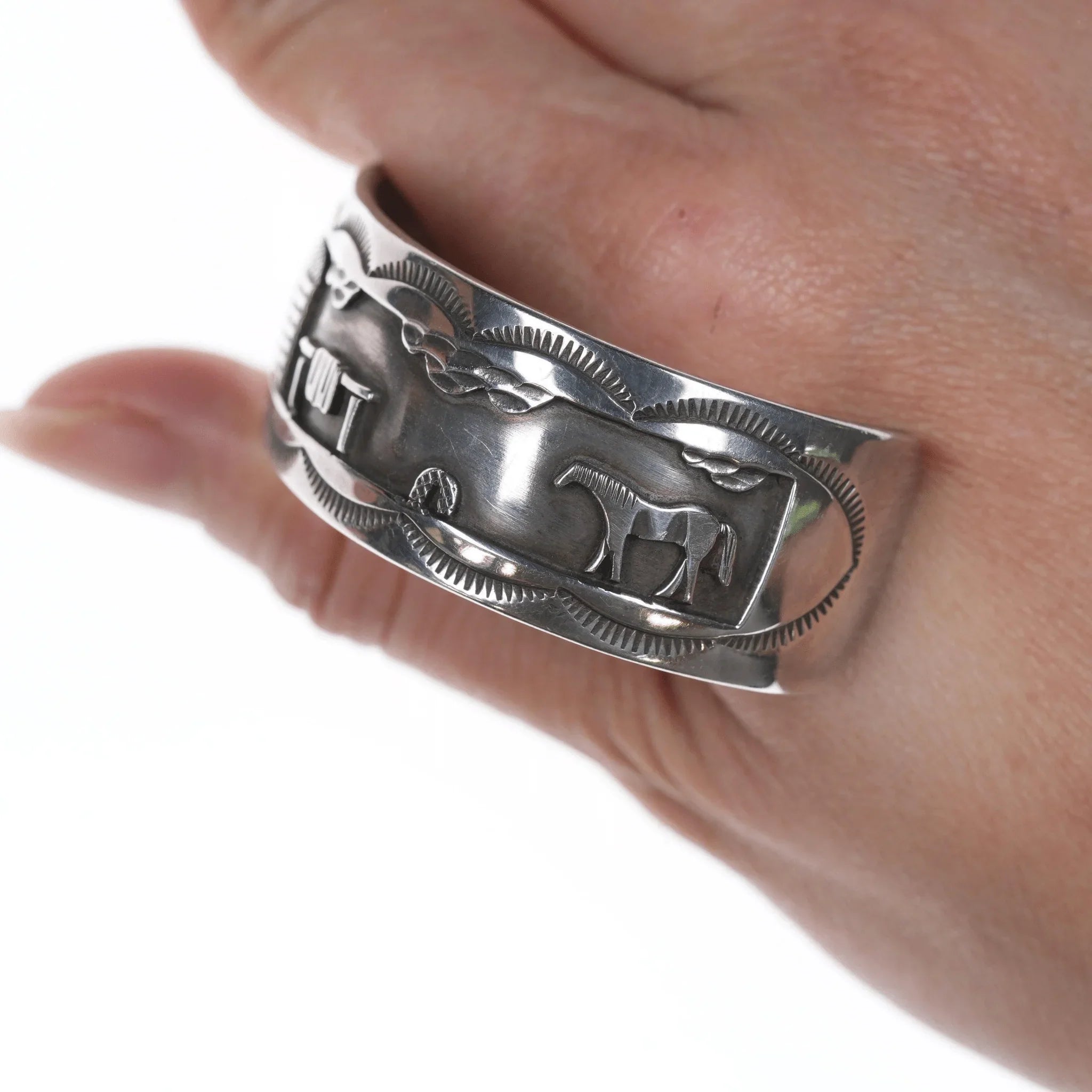 6.75" Roland Begay Sterling Storyteller Overlay cuff bracelet.<br><br>Roland Hogan Begay was born southwest of Gallup, New Mexico on the Navajo reservation. He learned silversmithing from his father. Roland creates scenes from Navajo life using an overlay technique in which he cuts out hogans (traditional eight-sided Navajo homes), people, horses, corrals and other items in a traditional Navajo setting, and solders them to a background of sterling silver or 14k gold. Roland also creates beautiful jewelry with the Navajo wedding/ceremonial basket design using copper and sterling silver. <br><br>Roland’s work has won several awards at the Gallup Intertribal Ceremonial and at the Heard Museum's annual show in Phoenix. His work is traditional and precise, and we are proud to carry his jewelry!<br><br>Marked or unmarked as shown in pics, weight and other measurements in pics. Sorry but my jewelry is stored in a secure location and cannot be accessed for more pictures,<br>videos, or measurements until sold. If you look at pictures/description your<br>question should be answered. Thank you so much for your time and consideration!<br><br>All precious metals are tested and guaranteed. A Native American jewelry piece referred to as "silver" or "ingot" is guaranteed to be at least 90% silver. Bracelets are photographed on a 6" women's wrist.