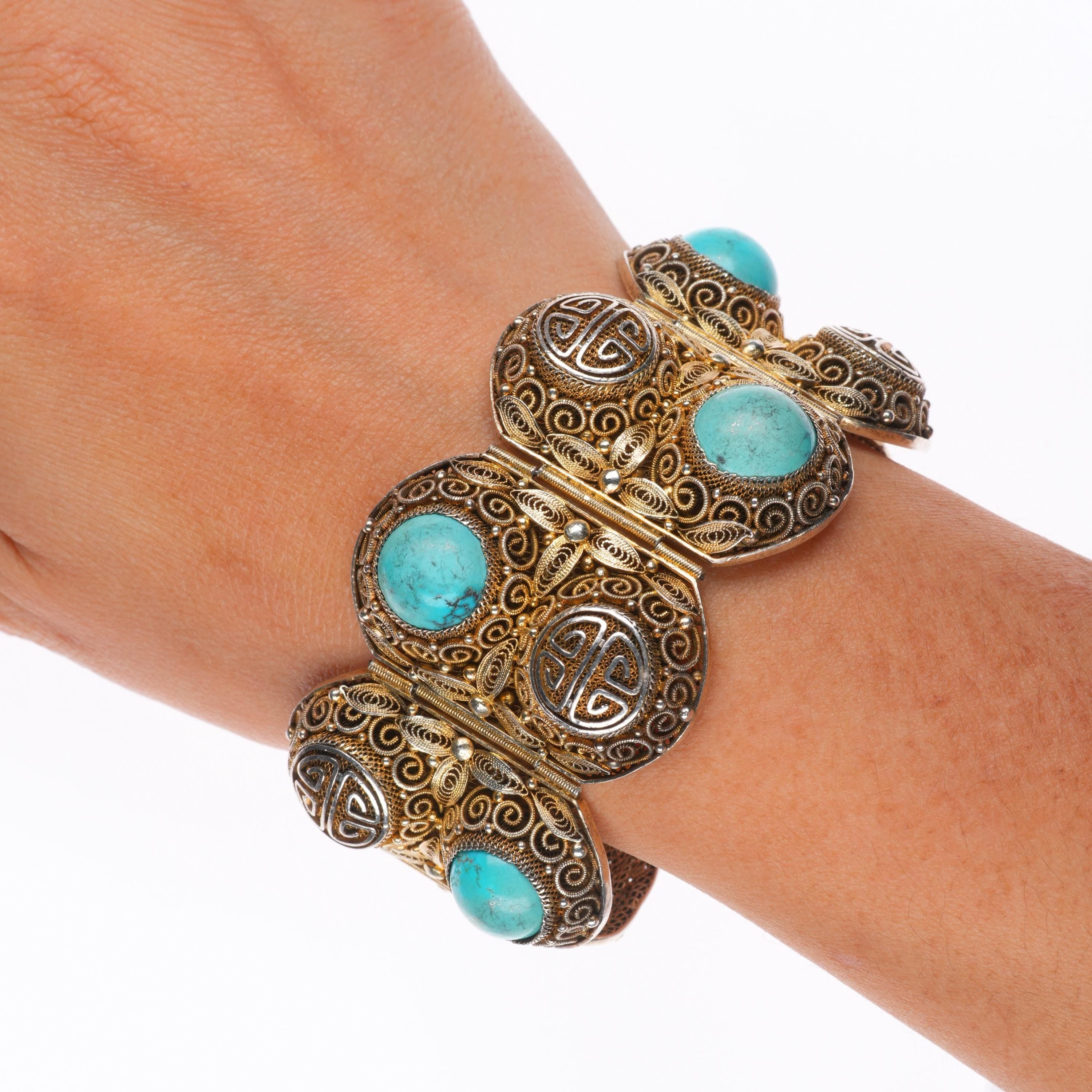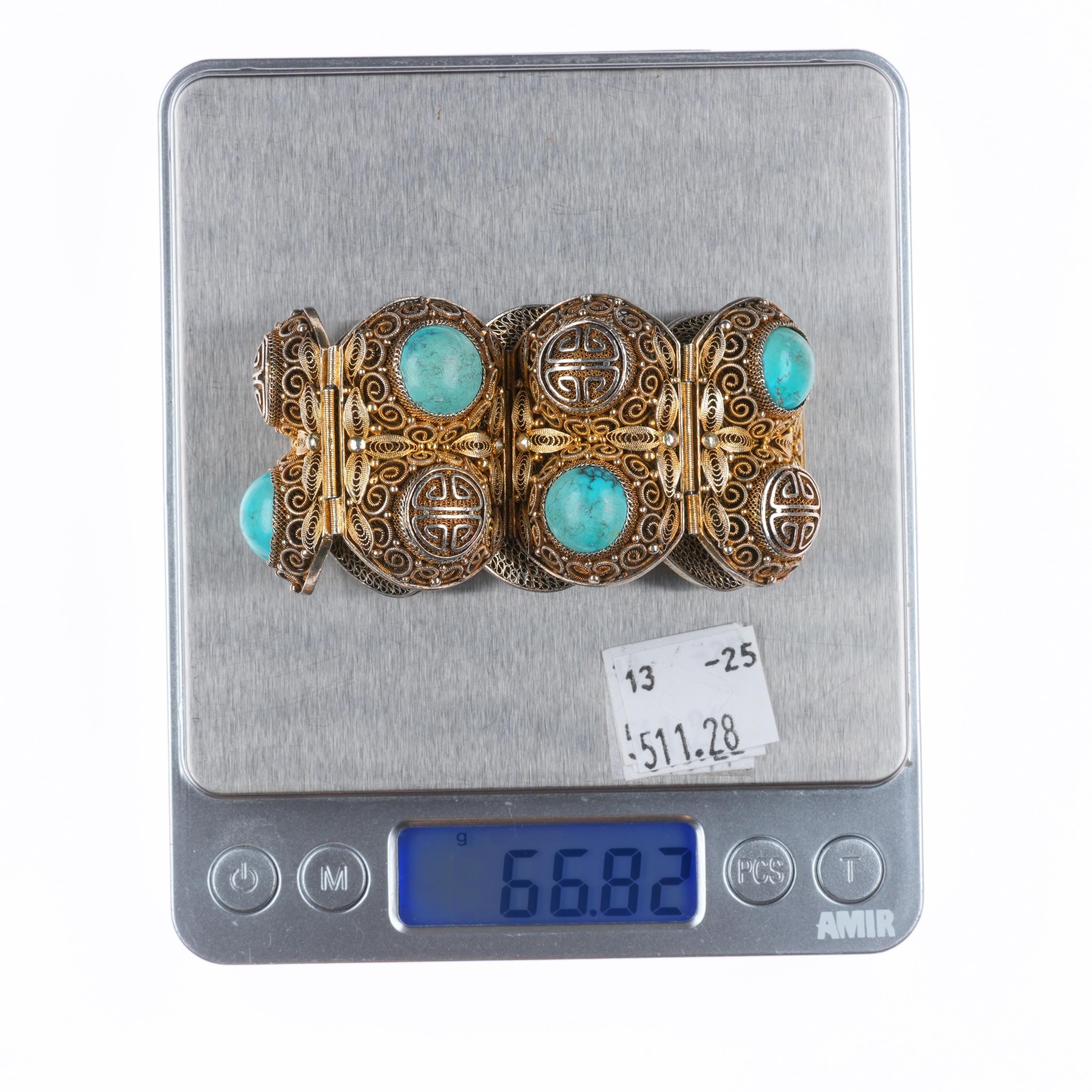 6.75" Vintage Chinese silver filigree wide turquoise mesh link bracelet. Weight and measurements in pictures, solid high content silver, gold gilt. Marked as shown with no damage.