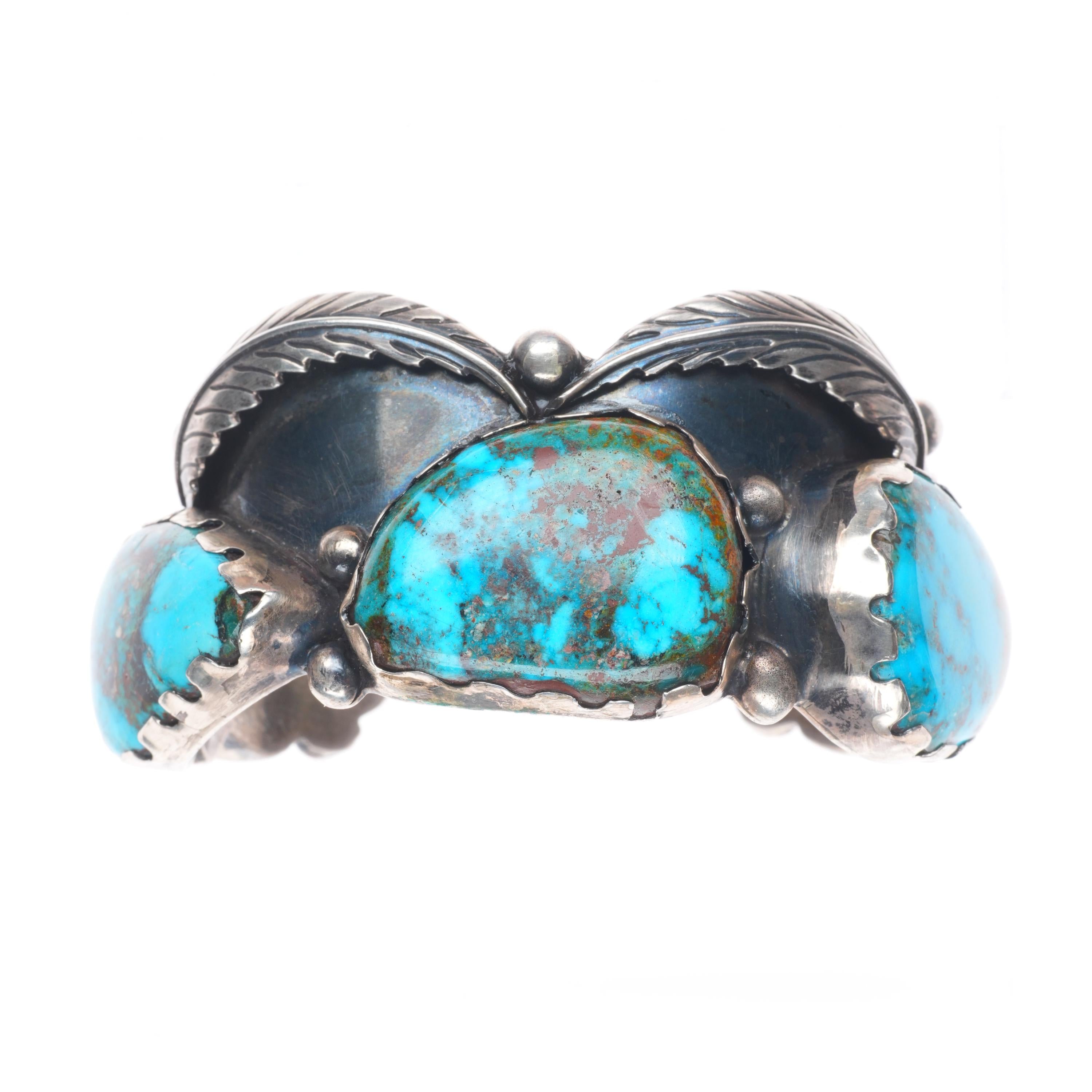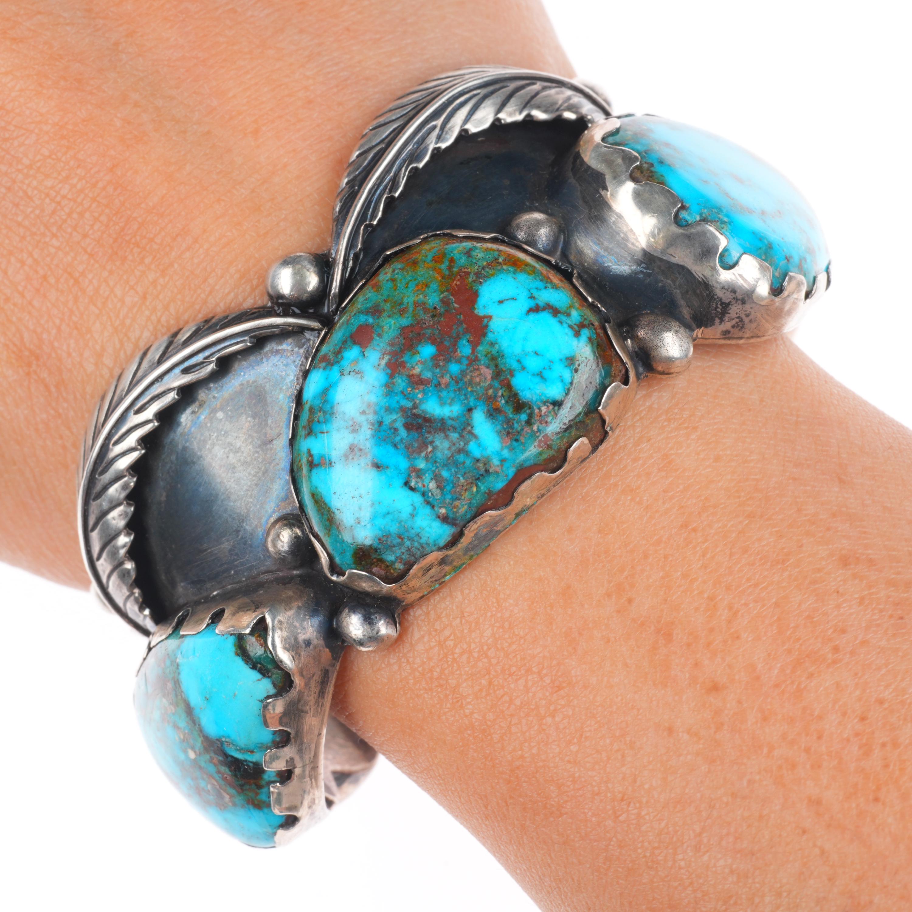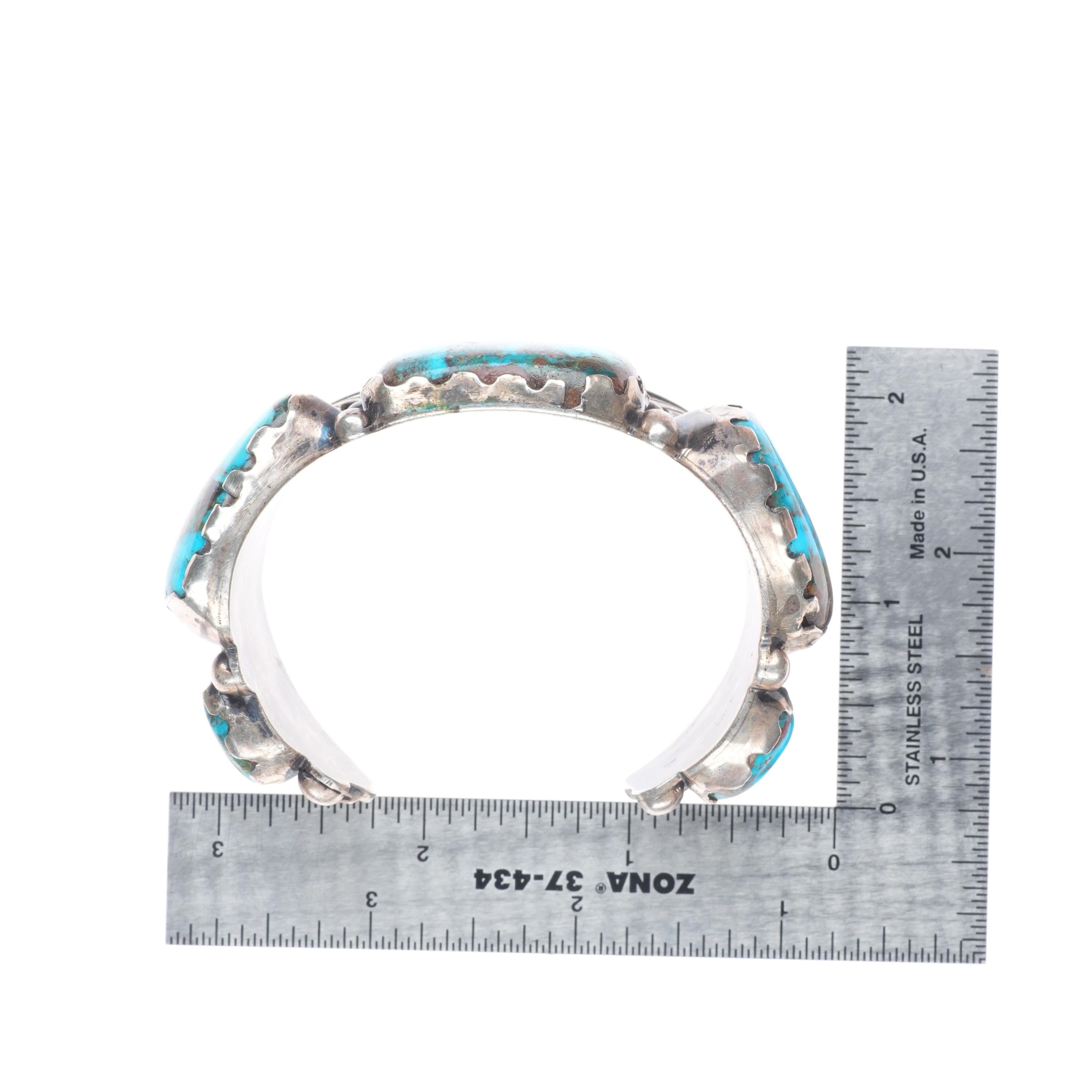 6.75" Vintage Navajo High Grade turquoise sterling silver cuff bracelet. Beautiful natural turquoise. Tested and guaranteed solid sterling silver with weight and measurements in pictures. Overall expected wear with apparent circa last quarter of the 20th century.