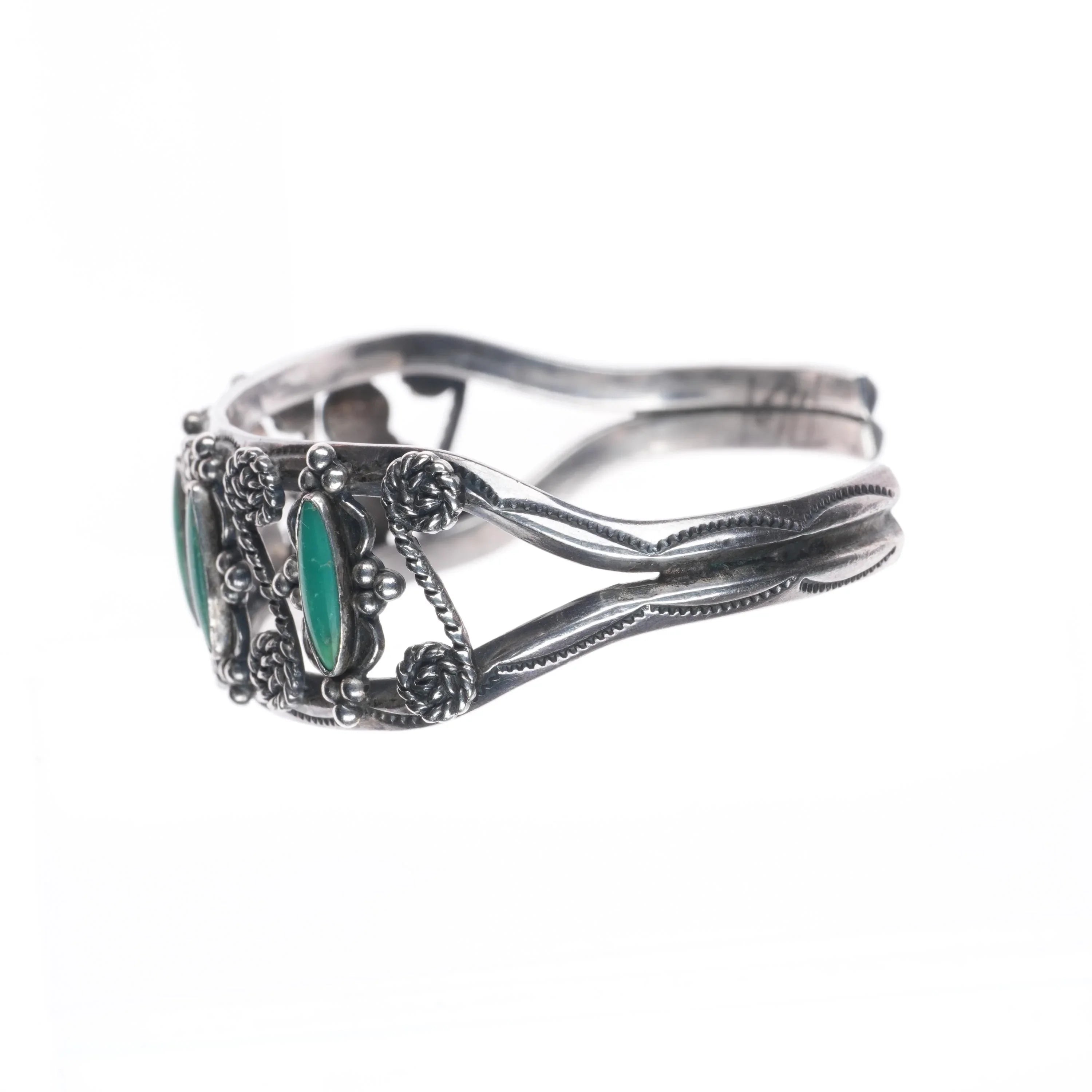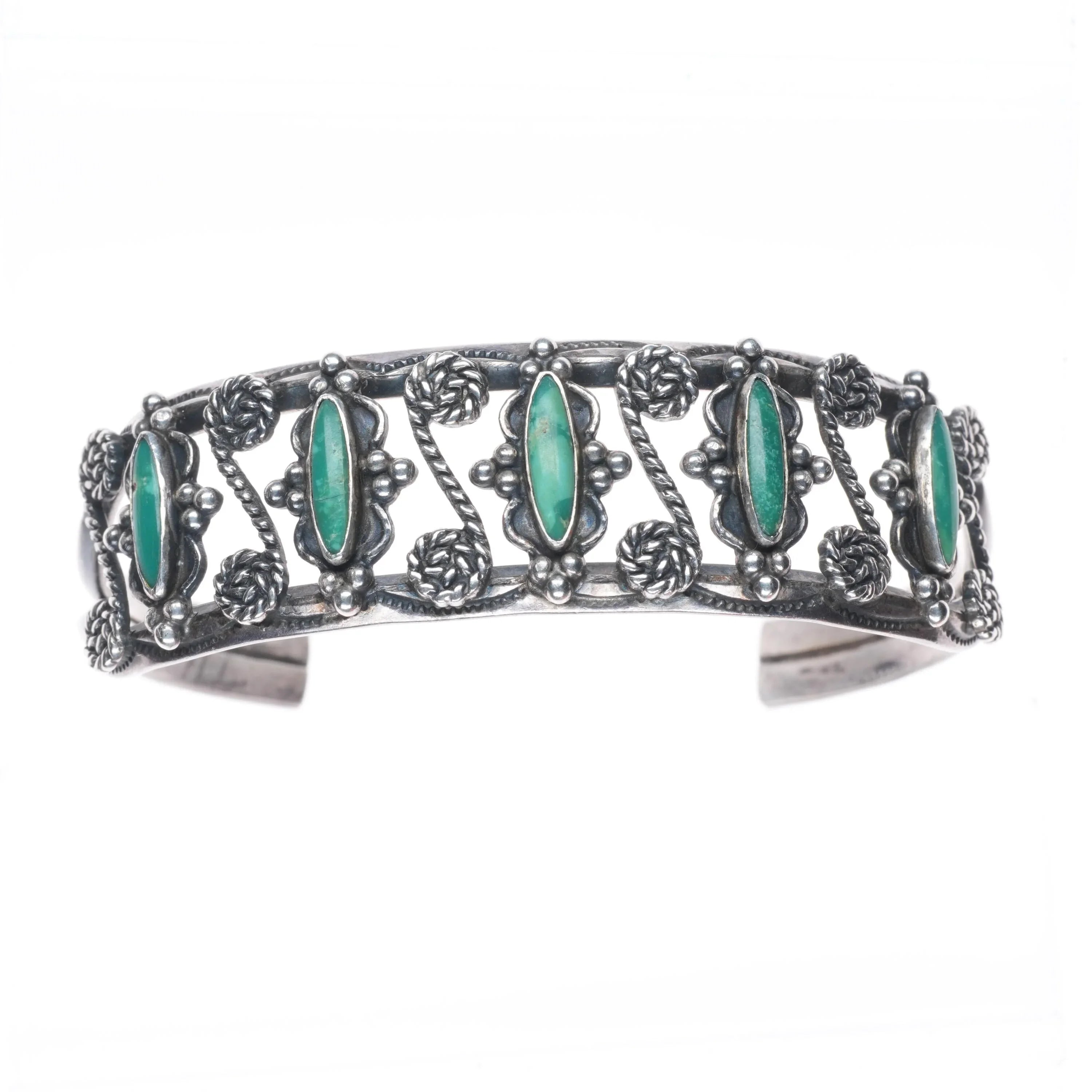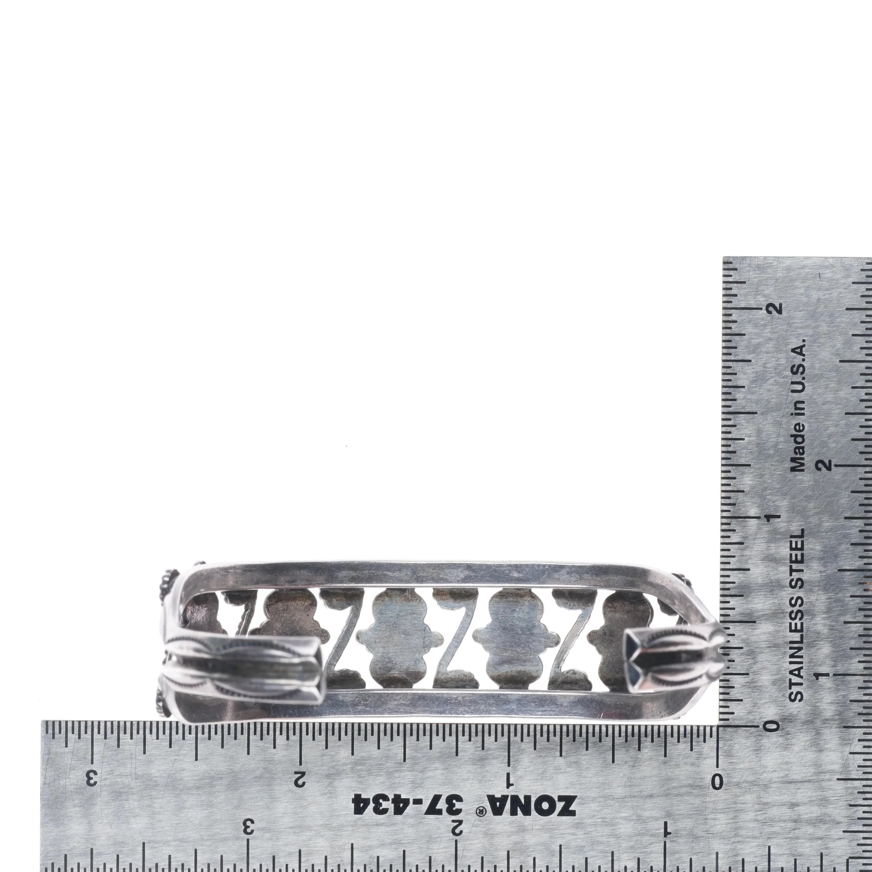 6.75" Vintage Navajo sterling silver fancy twisted wire carinated cuff bracelet. Tested and guaranteed solid sterling silver with weight and measurements in pictures. Good condition, circa second quarter of the century. One stone with clean fracture, all stones secure in bezels.