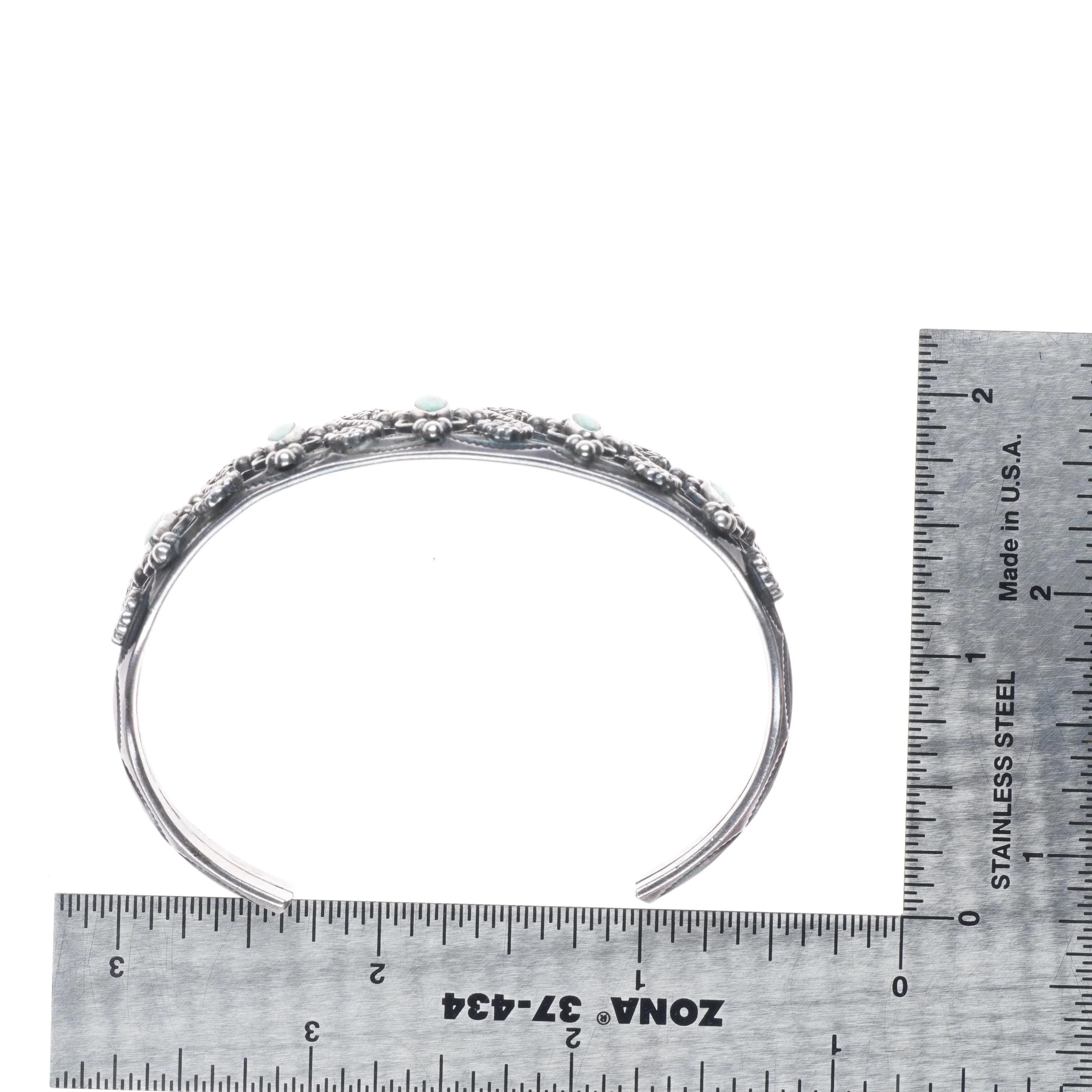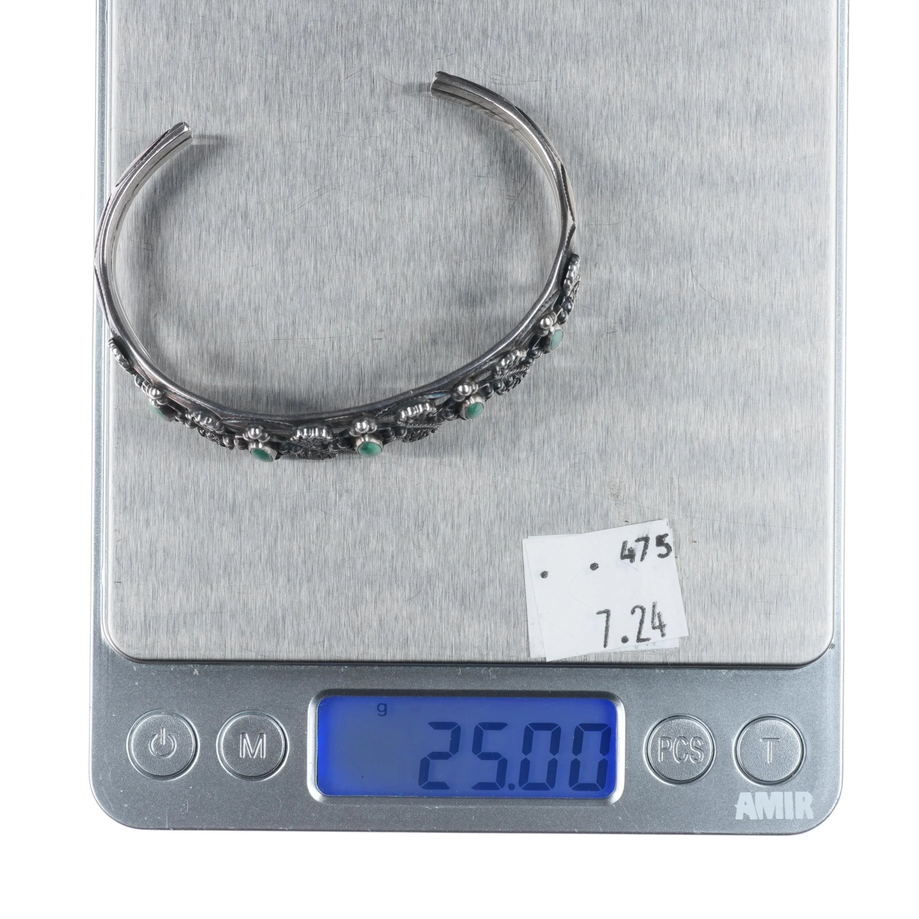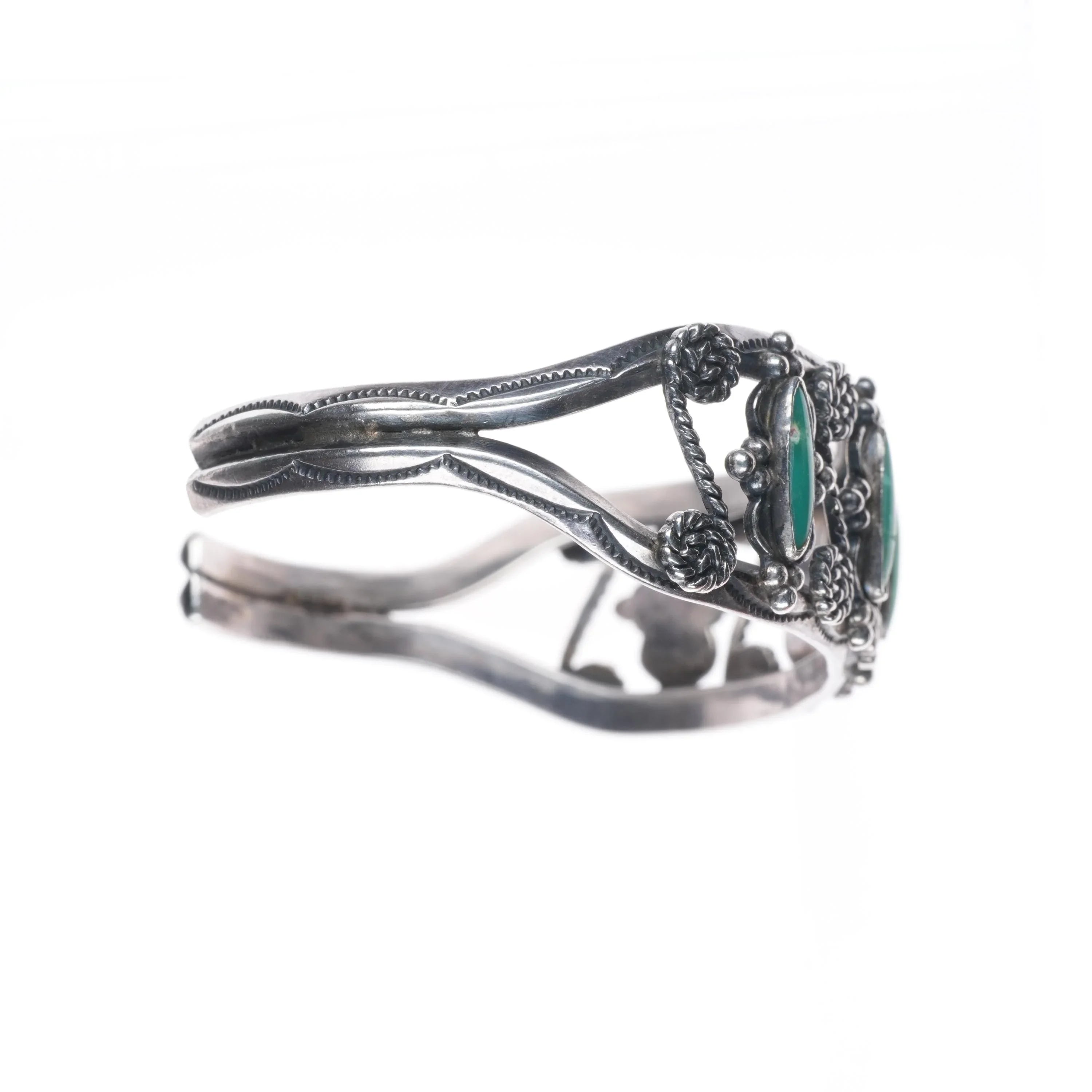 6.75" Vintage Navajo sterling silver fancy twisted wire carinated cuff bracelet. Tested and guaranteed solid sterling silver with weight and measurements in pictures. Good condition, circa second quarter of the century. One stone with clean fracture, all stones secure in bezels.