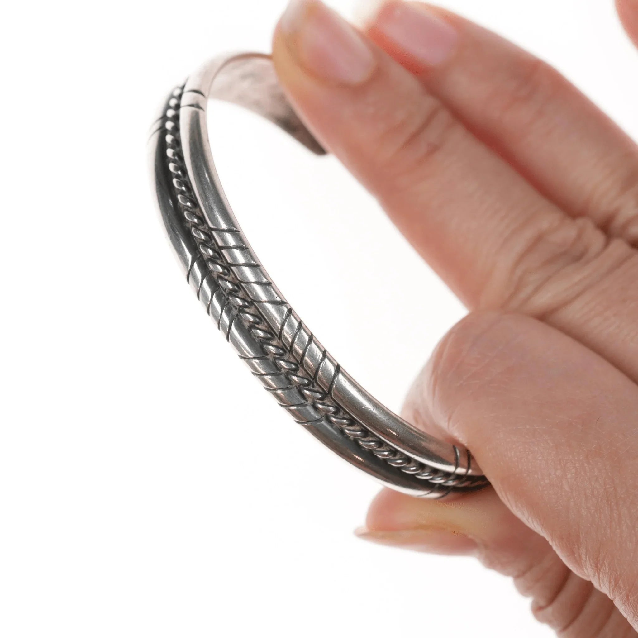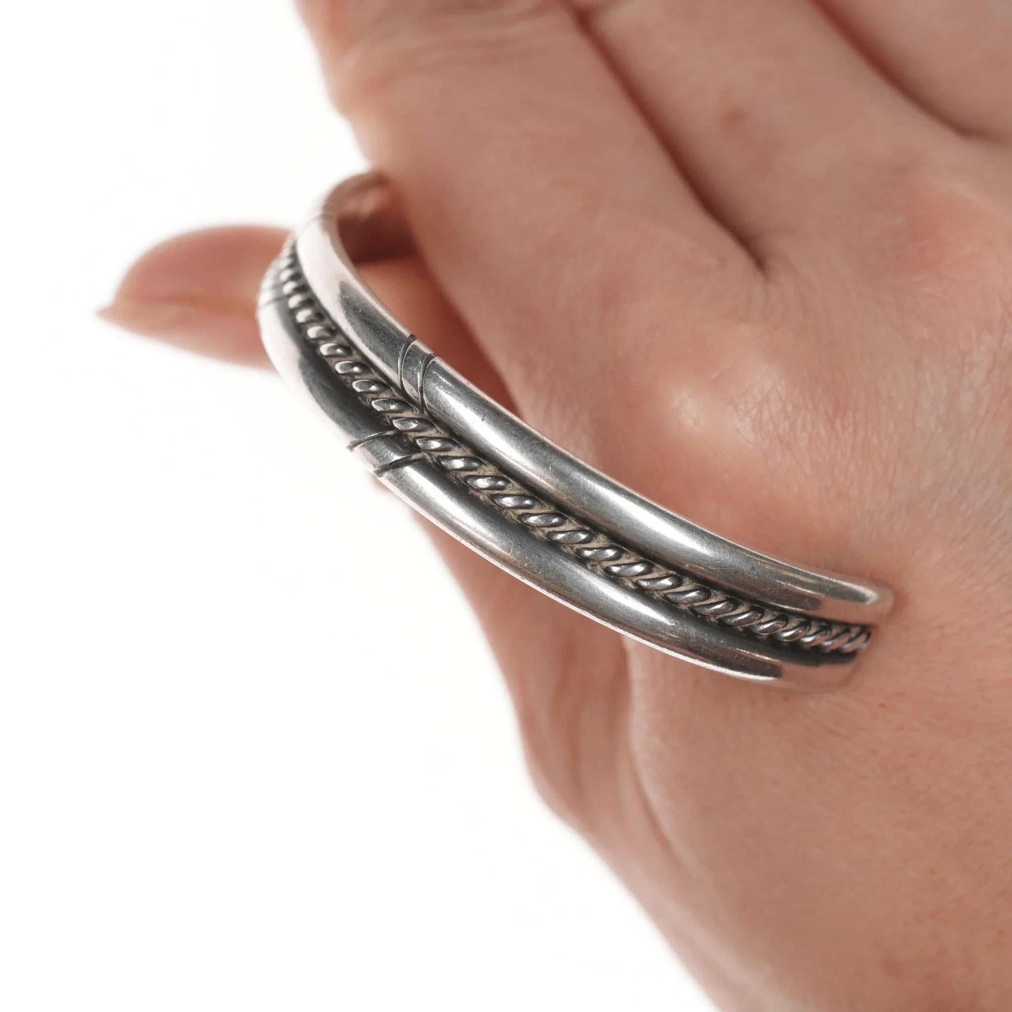 6.75" Vintage Southwestern sterling twisted wire cuff bracelet<br><br> Marked or unmarked as shown in pics, weight and other measurements in pics. Sorry but my jewelry is stored in a secure location and cannot be accessed for more pictures,<br>videos, or measurements until sold. If you look at pictures/description your<br>question should be answered. Thank you so much for your time and consideration!<br><br>All precious metals are tested and guaranteed. A Native American jewelry piece referred to as "silver" or "ingot" is guaranteed to be at least 90% silver. Bracelets are photographed on a 6" women's wrist.