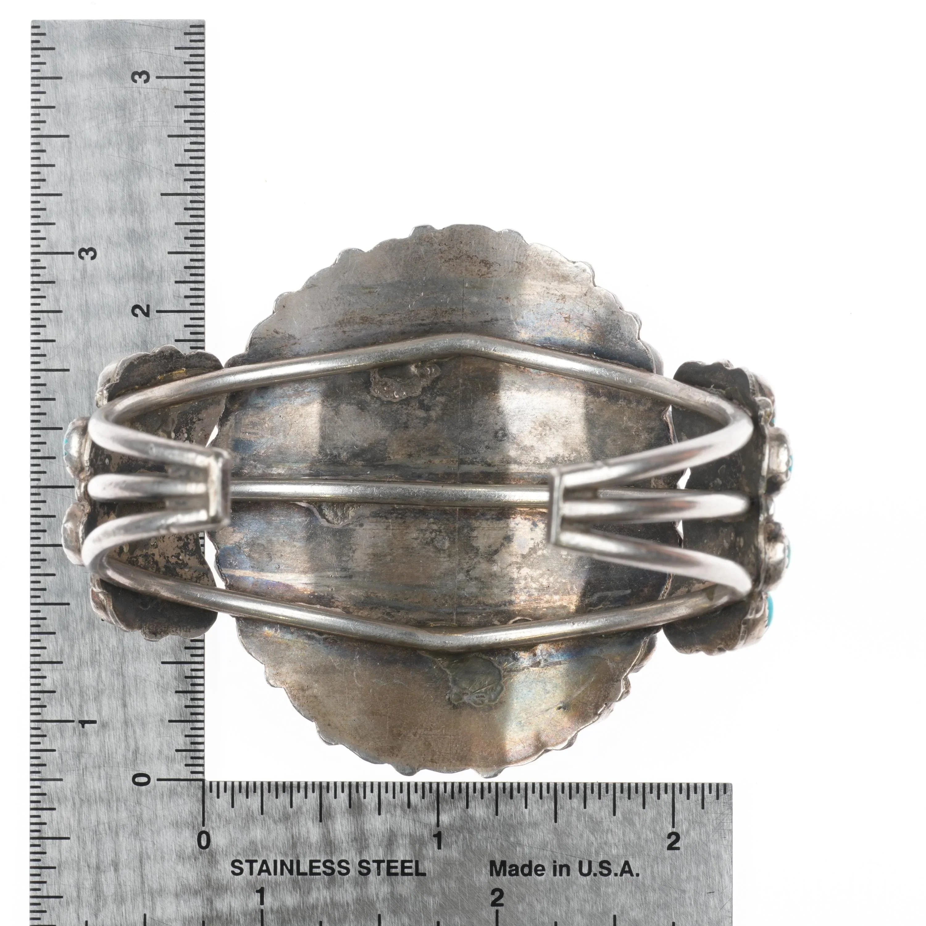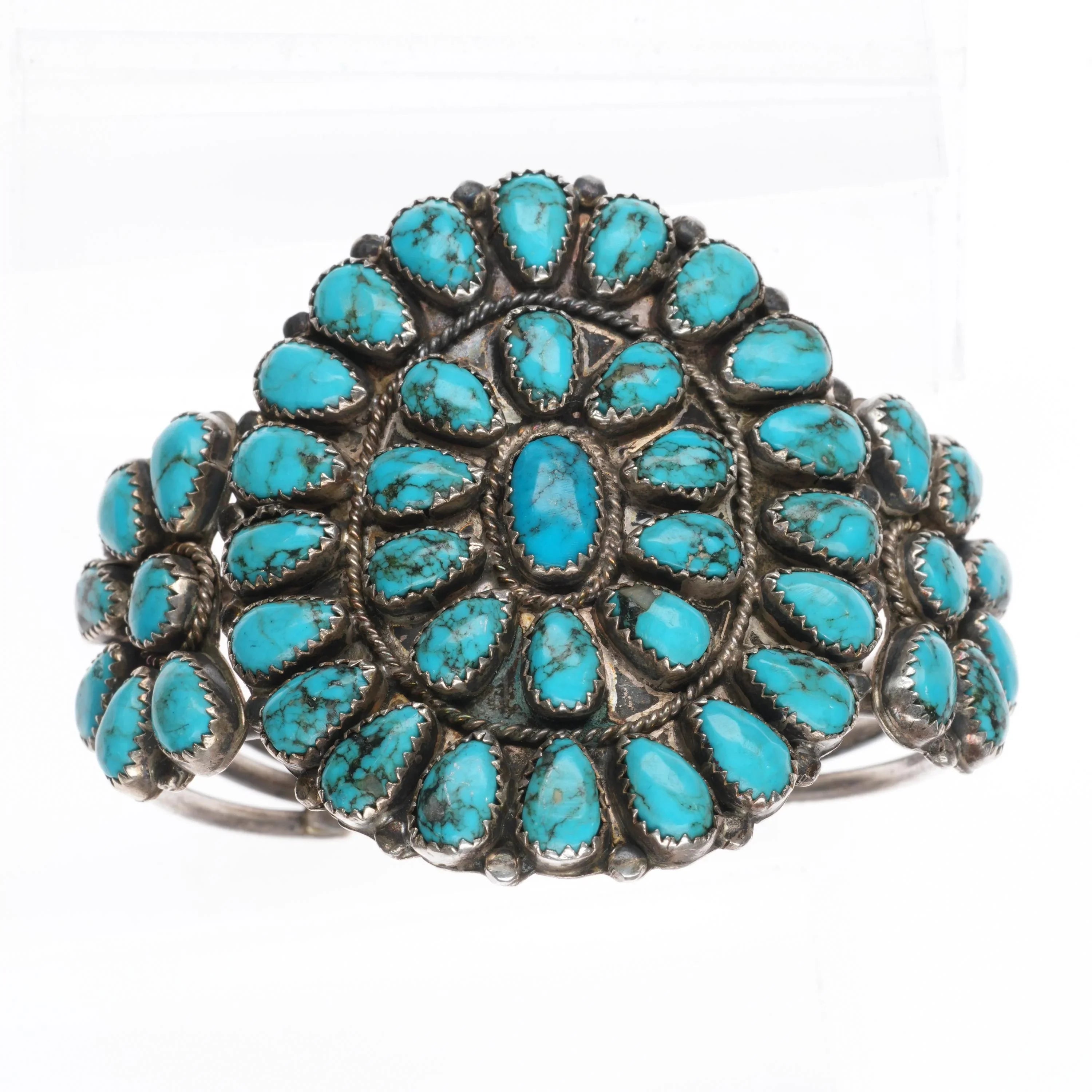 6.75" Vintage Zuni Heavy sterling silver turquoise cluster cuff bracelet. Tested and guaranteed solid sterling silver. Weight and measurements in pictures. Some expected wear with no damage. No apparent markings which is very common for authentic Native American made jewelry of this era. Circa third quarter of the 20th century. Much sturdier than later examples.