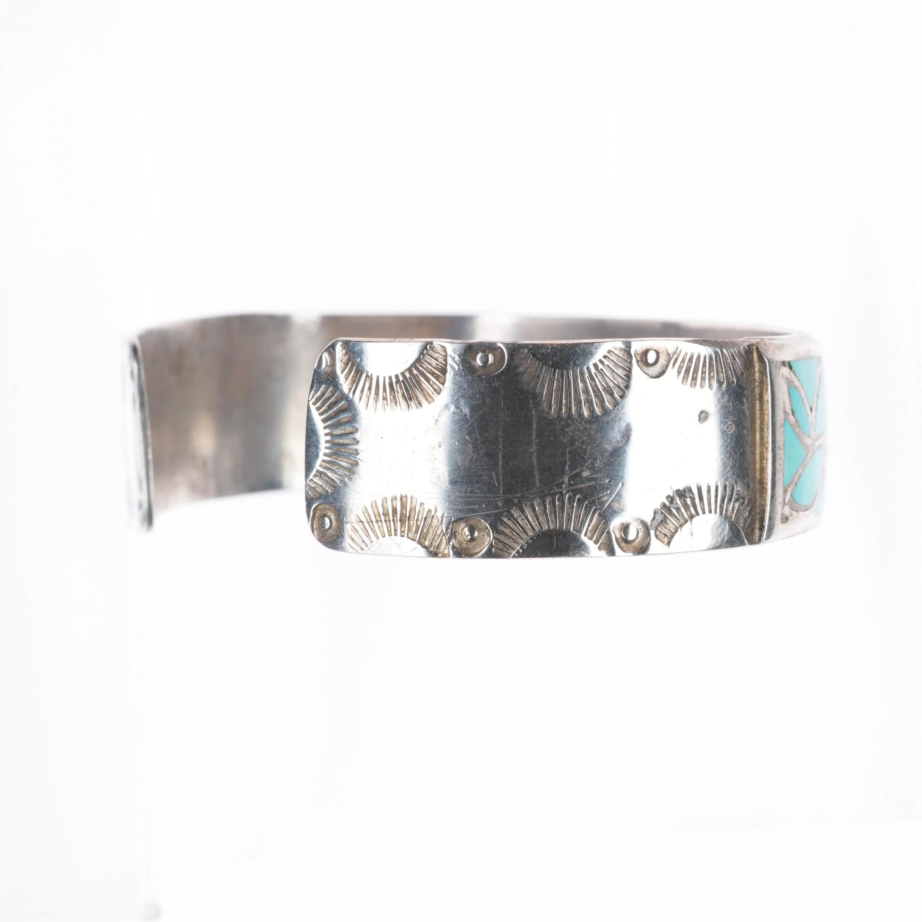 6.8" Vintage Hechilay Zuni sterling silver fishs-cale turquoise cuff bracelet. Tested and guaranteed solid sterling silver with weight and measurements in pictures. Circa last quarter of the 20th century,