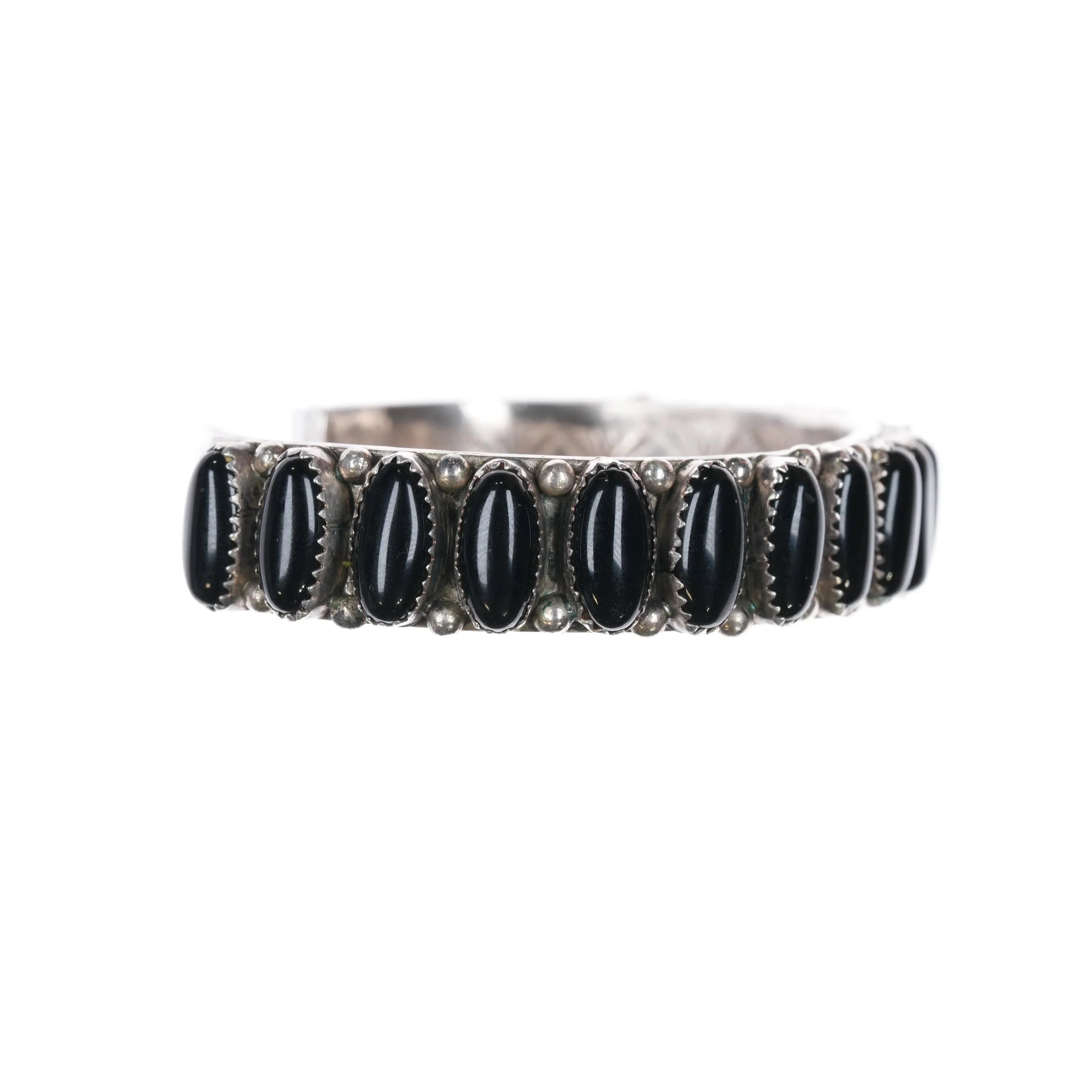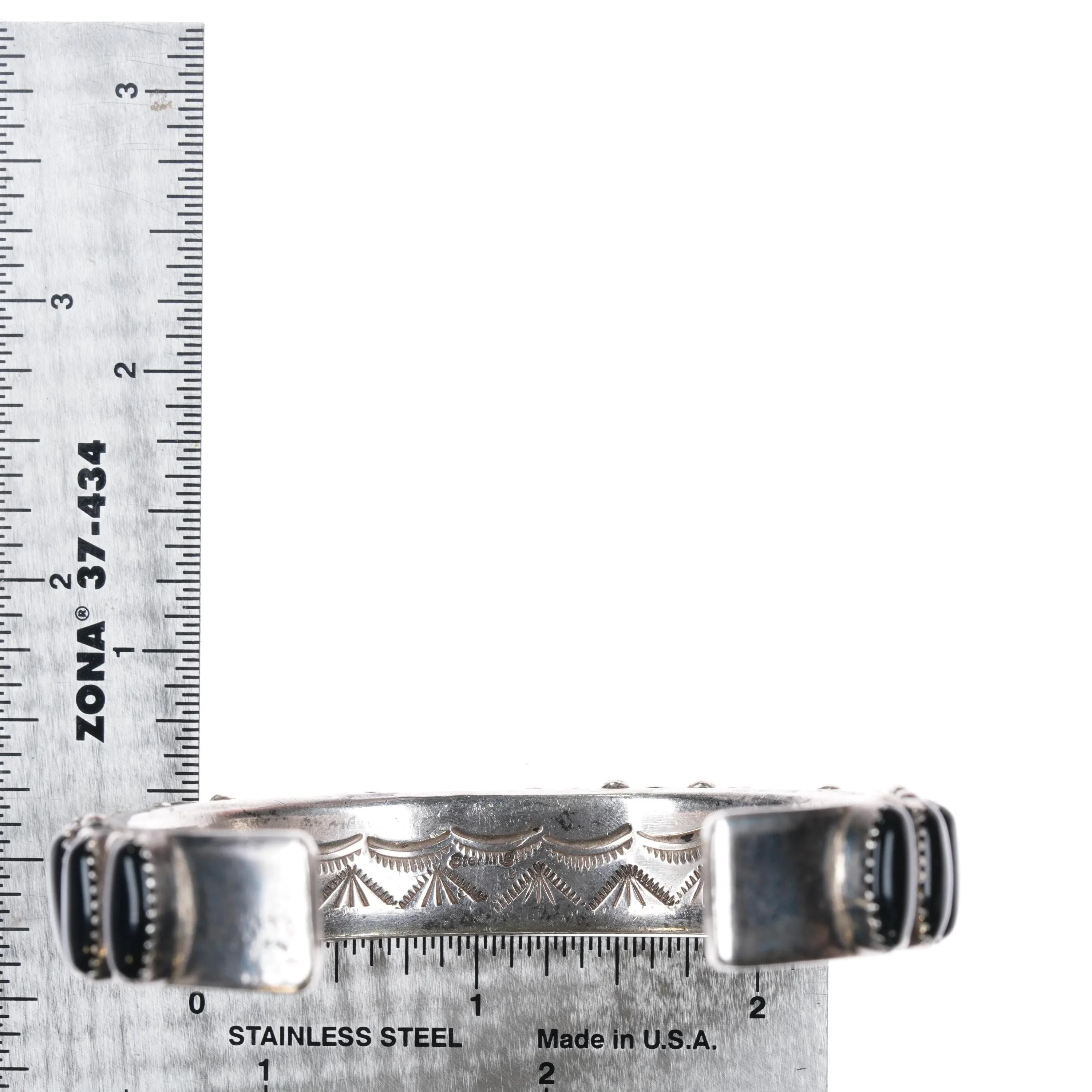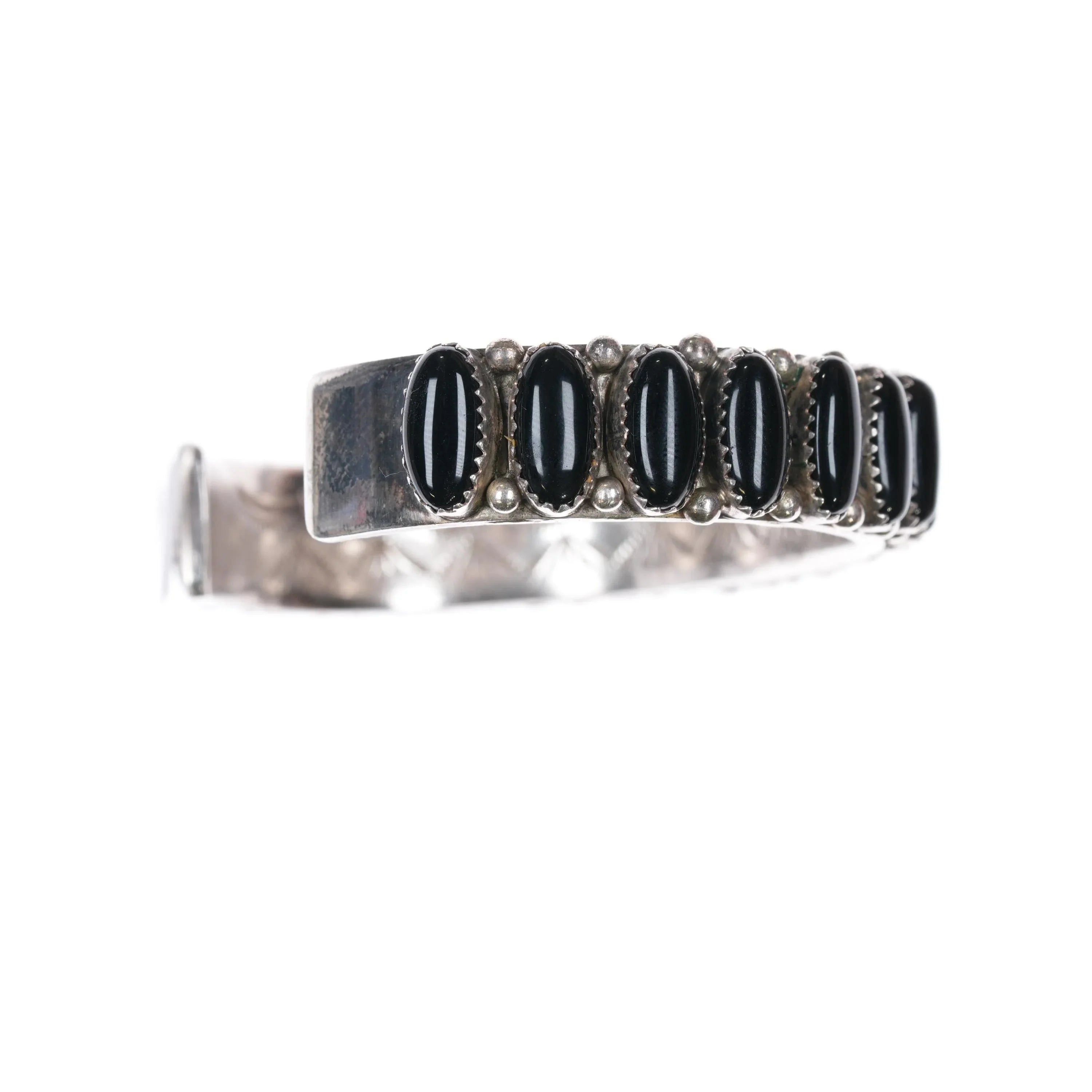 6.85" Vintage Navajo sterling silver onyx row cuff bracelet Interior stamping