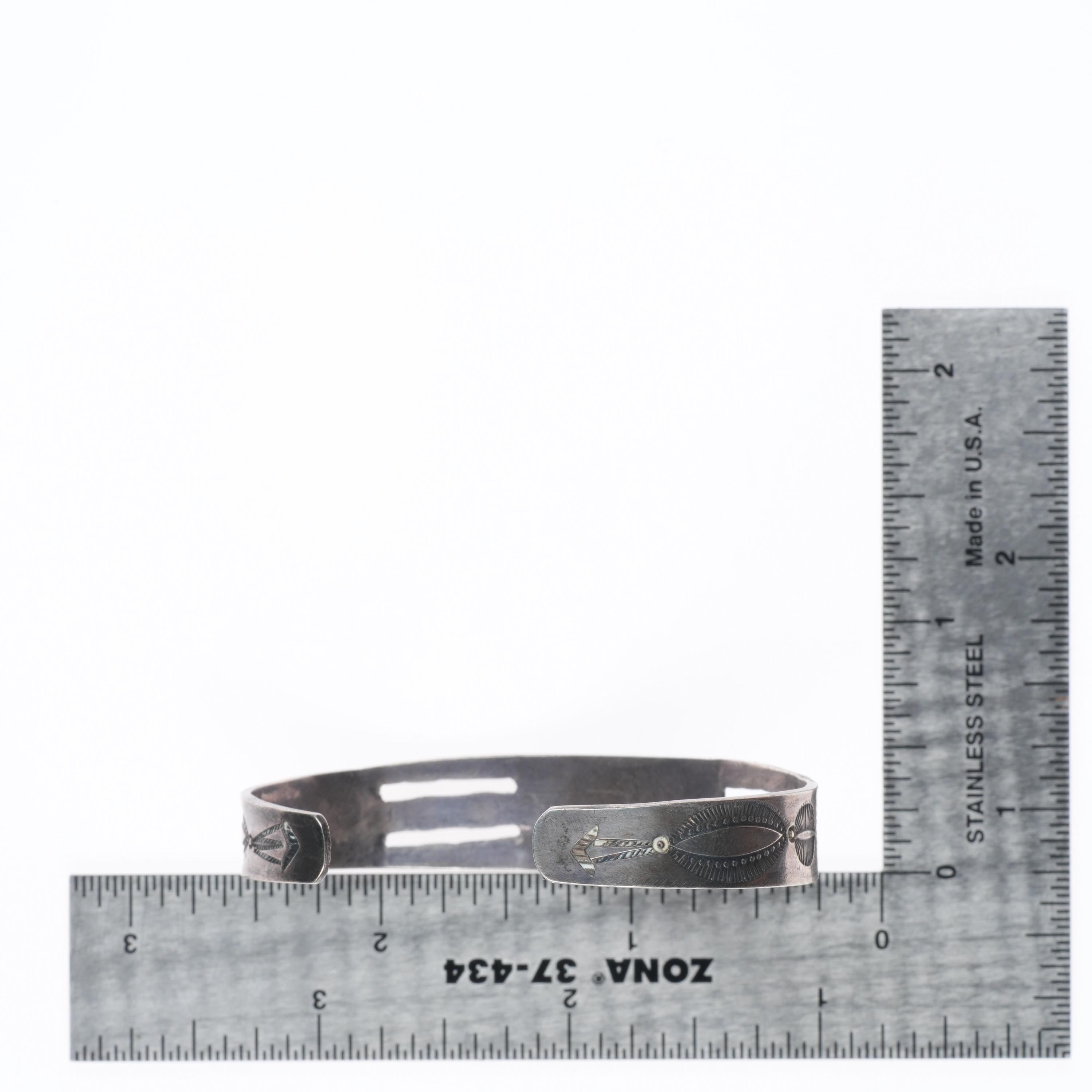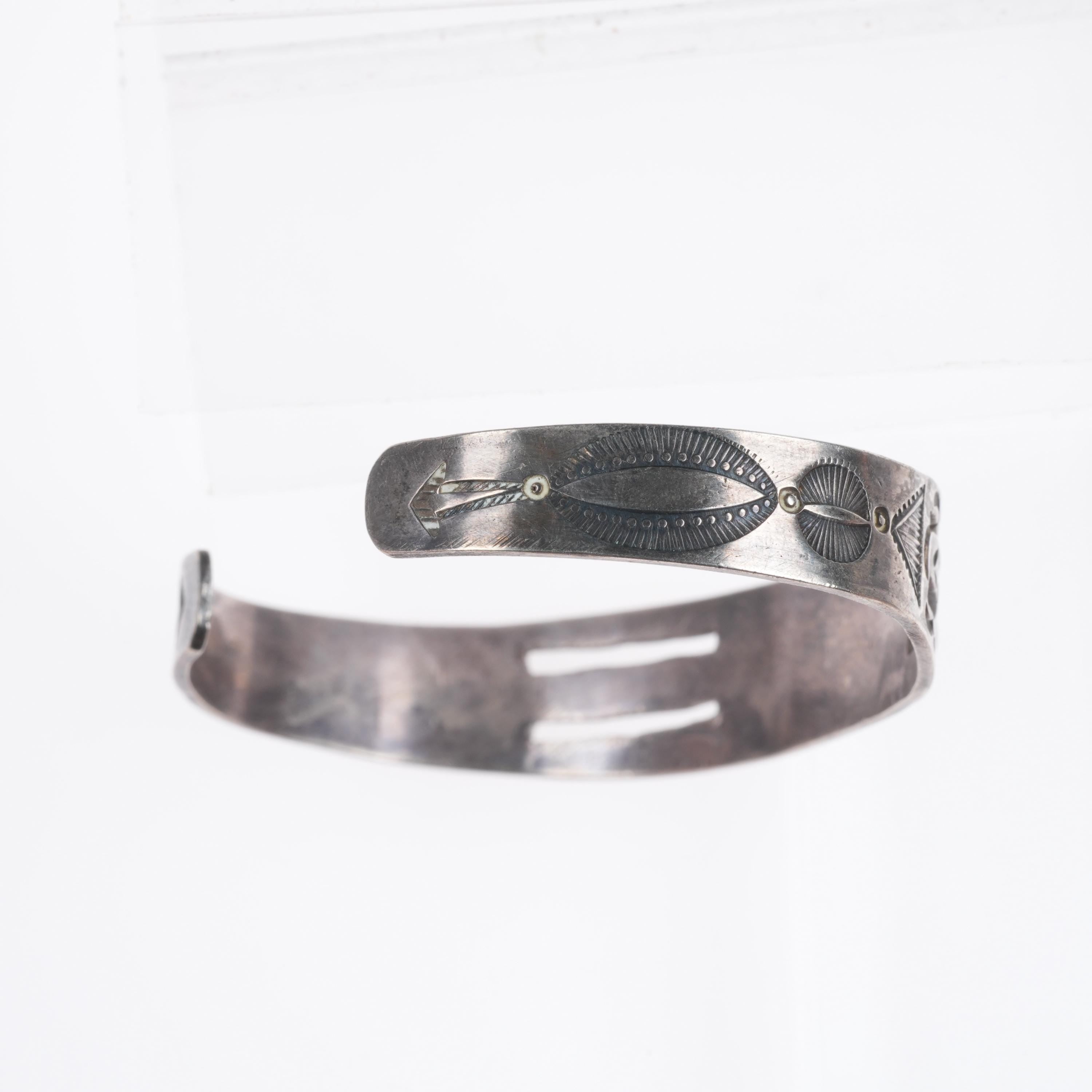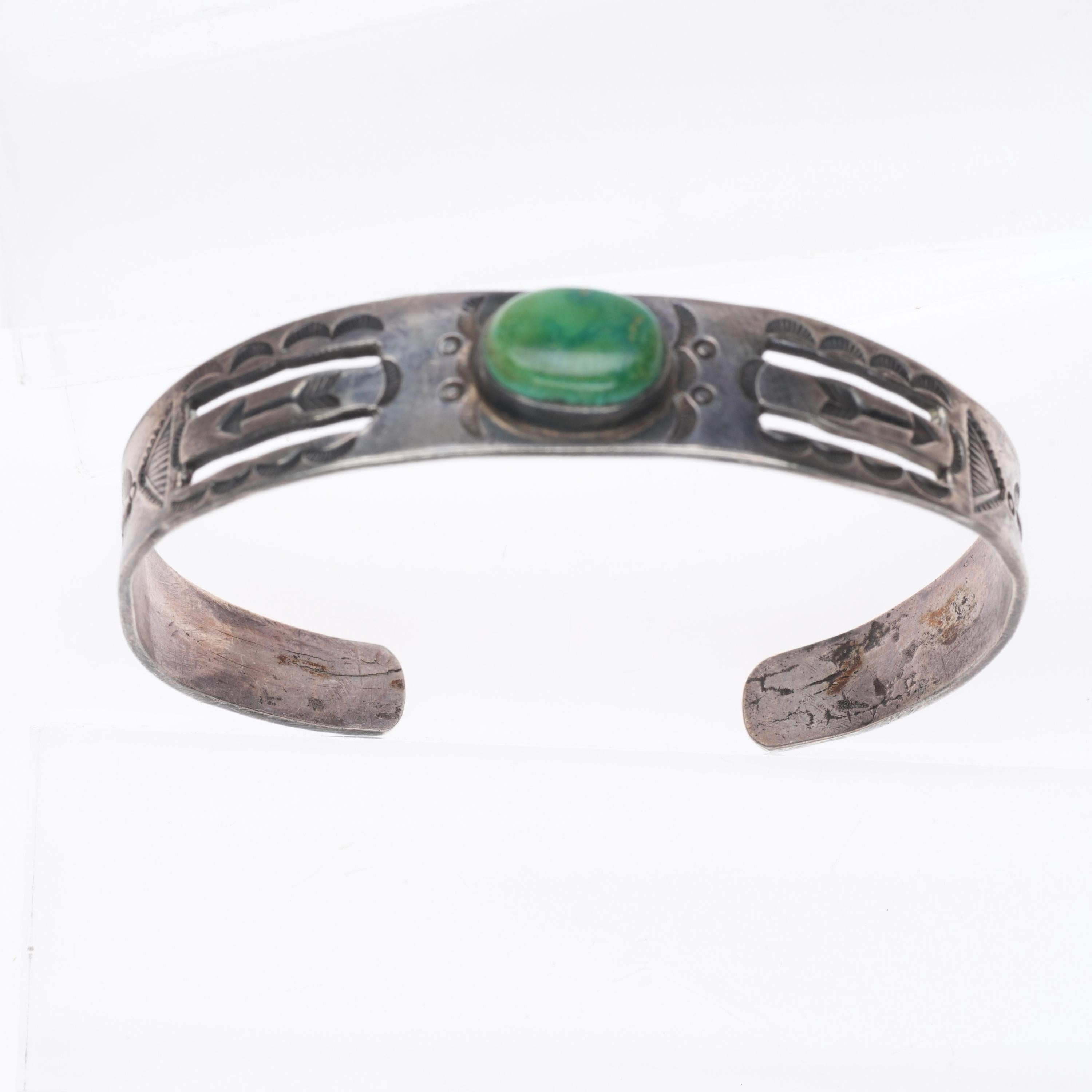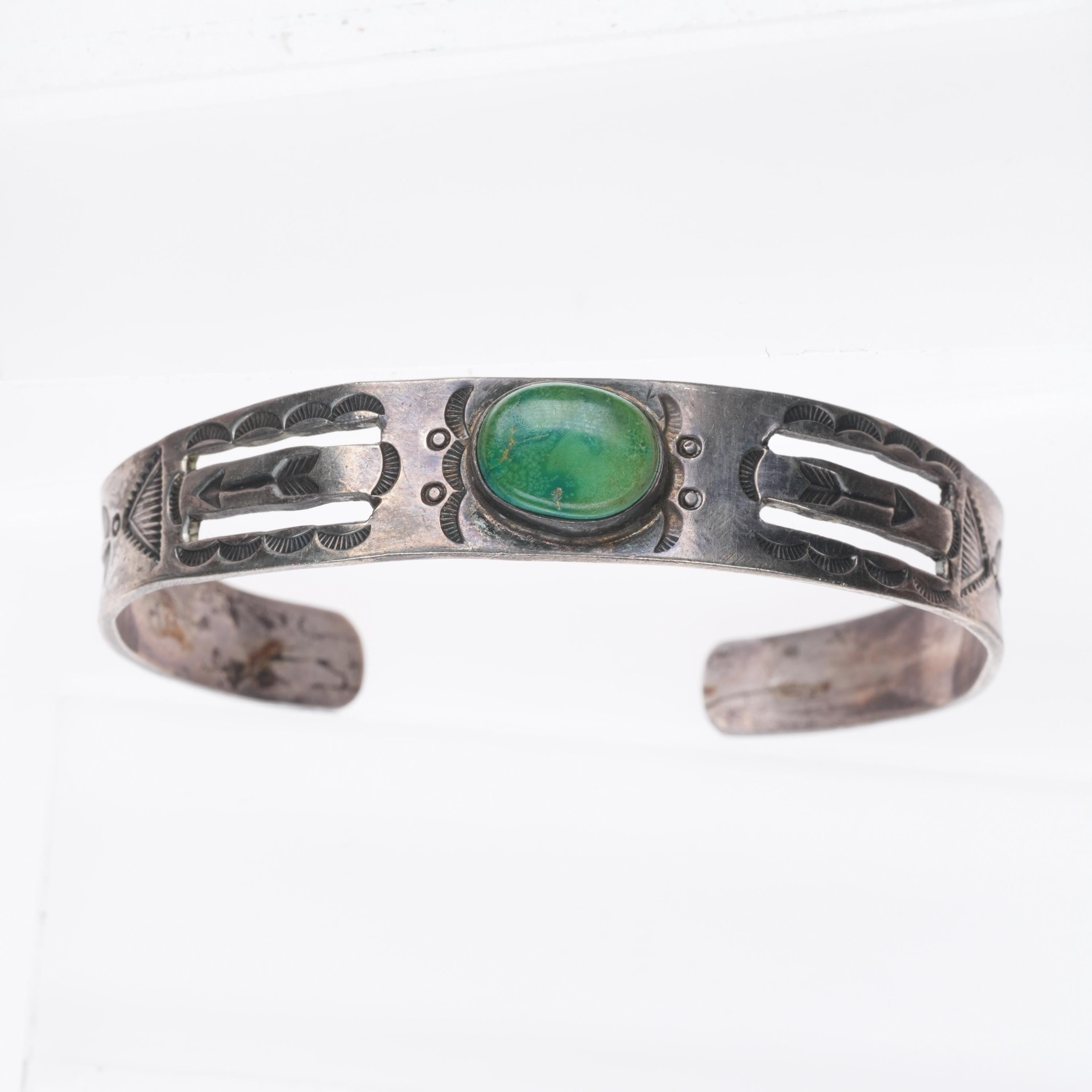 6" c1930 Navajo Ingot silver arrow stamped green turquoise cuff bracelet. Tested and guaranteed solid sterling silver with weight and measurements in pictures. Circa second quarter of the 20th century with age appropriate wear..