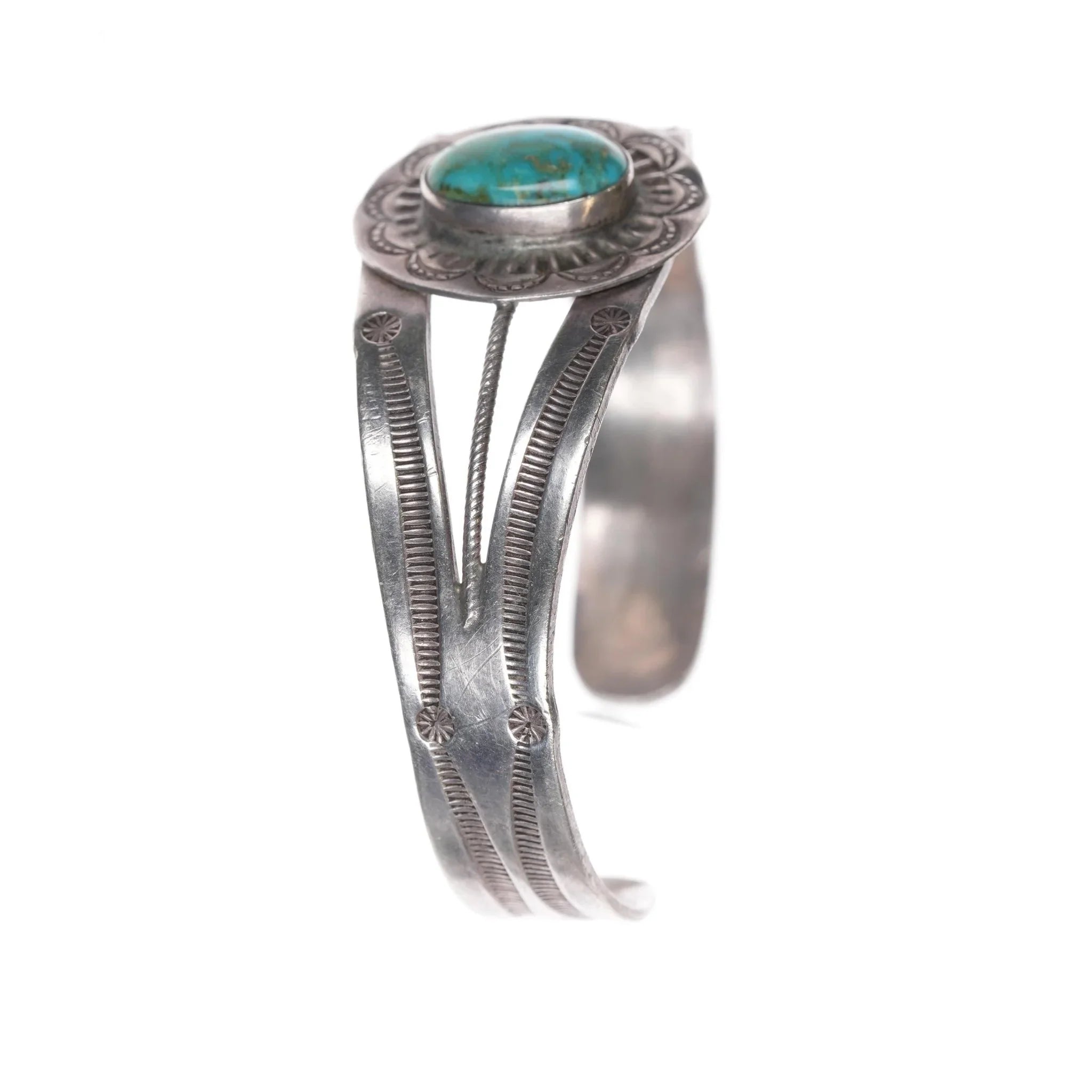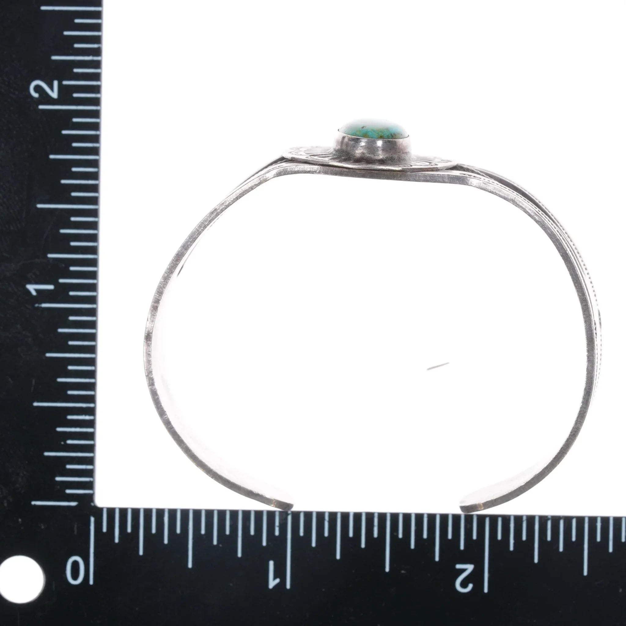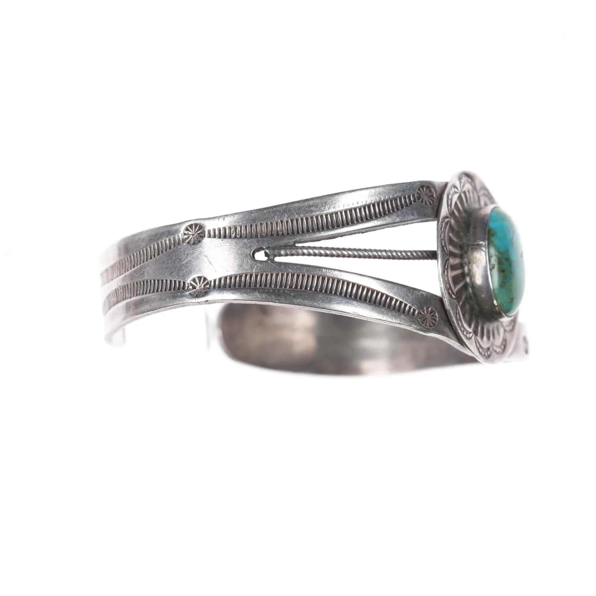6" c1940‘s Navajo hand stamped silver cuff bracelet with turquoise. Apparently unmarked with no issues, solid sterling, weight and measurements in pics.