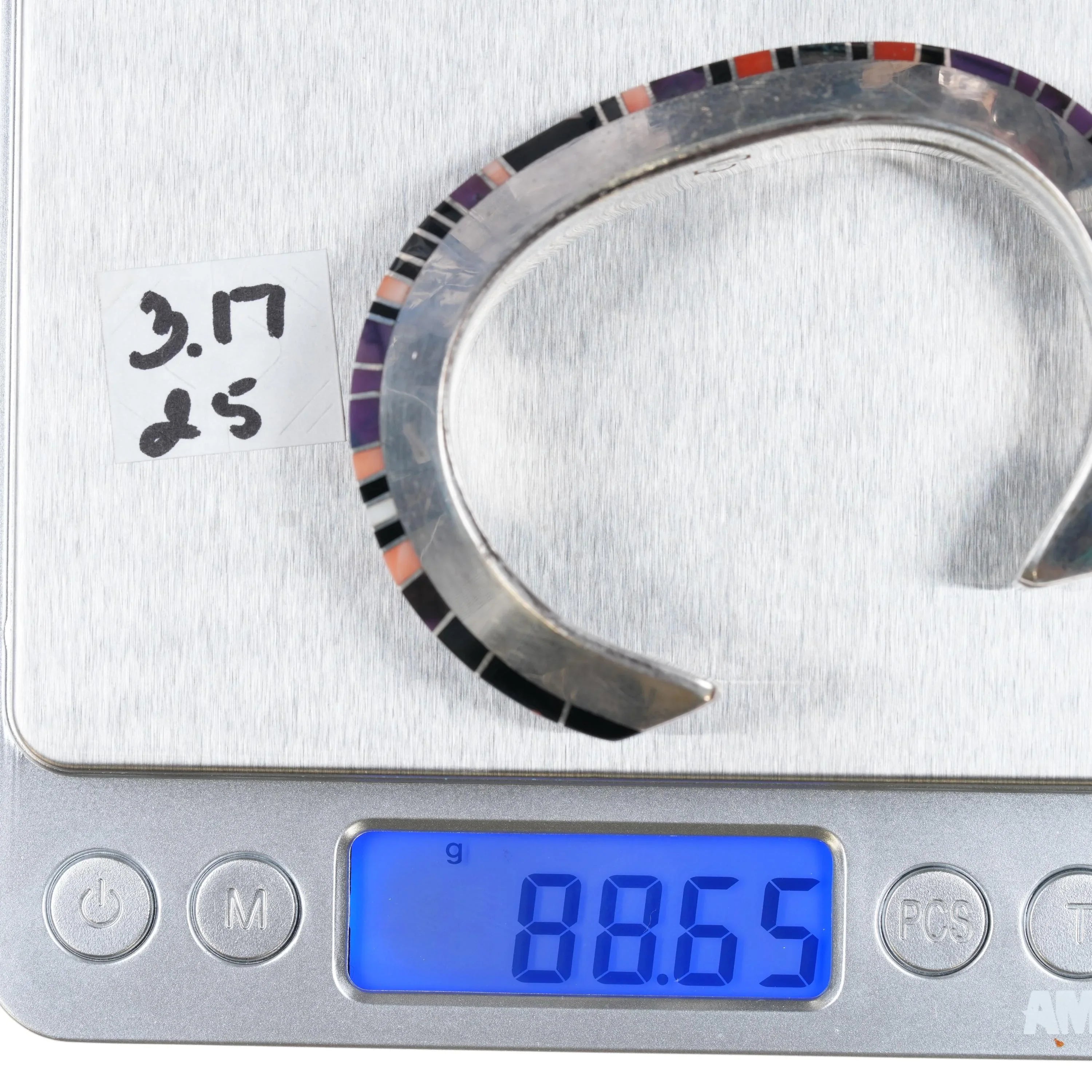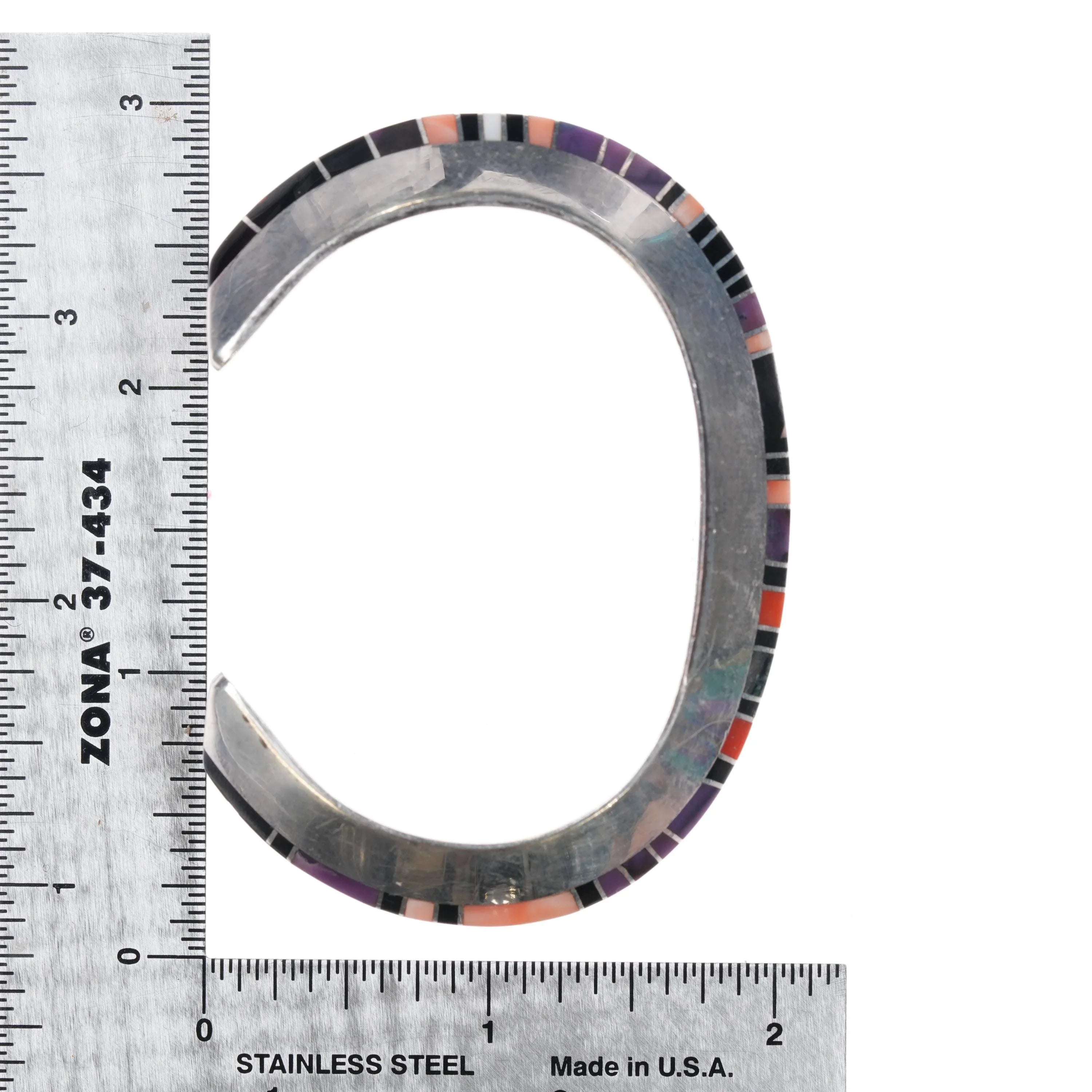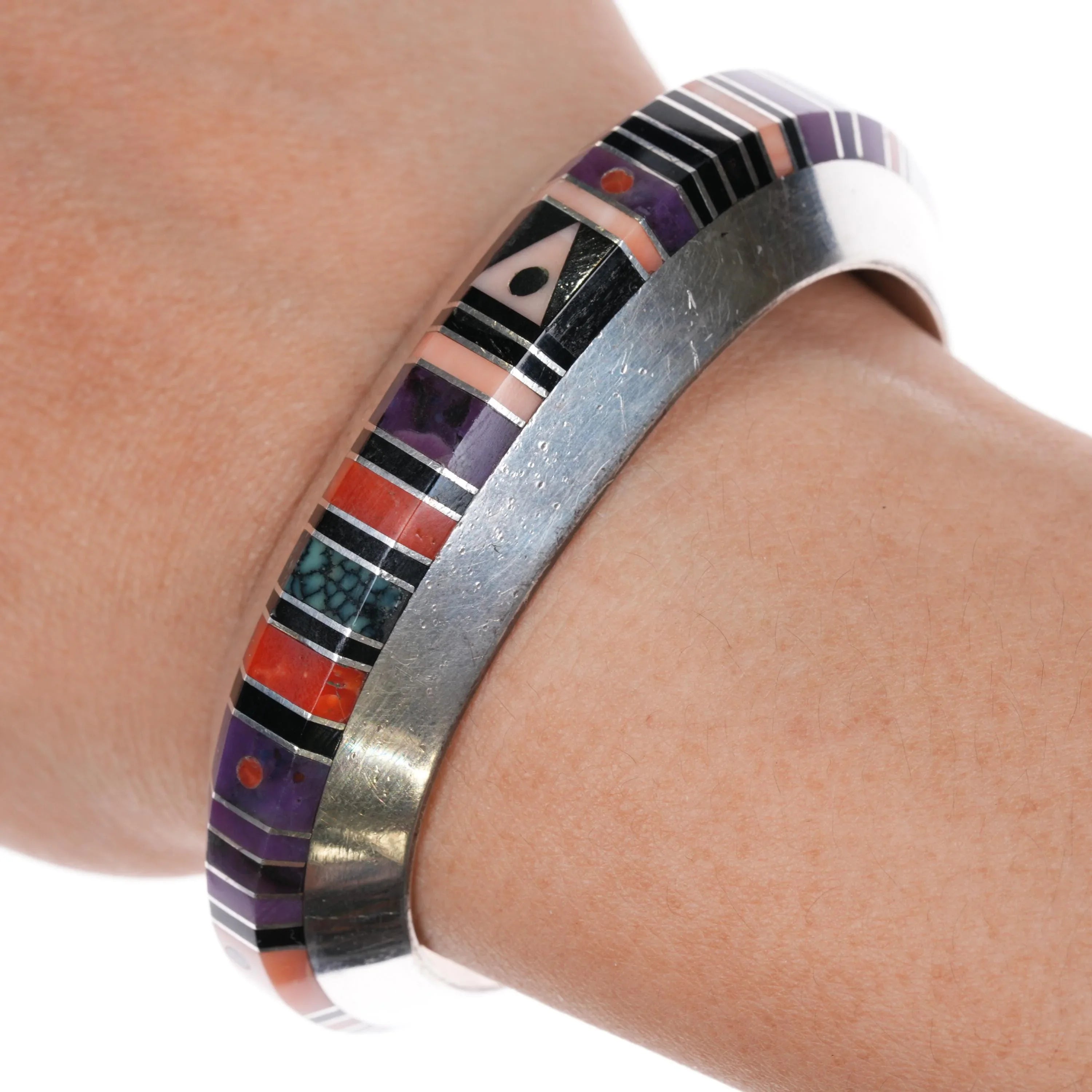 6" Gibson Nez Navajo/Apache sterling - Sugilite, coral, variscite cuff bracelet. Fantastic, extremely well made bracelet from the last quarter of the 20th century in good condition.