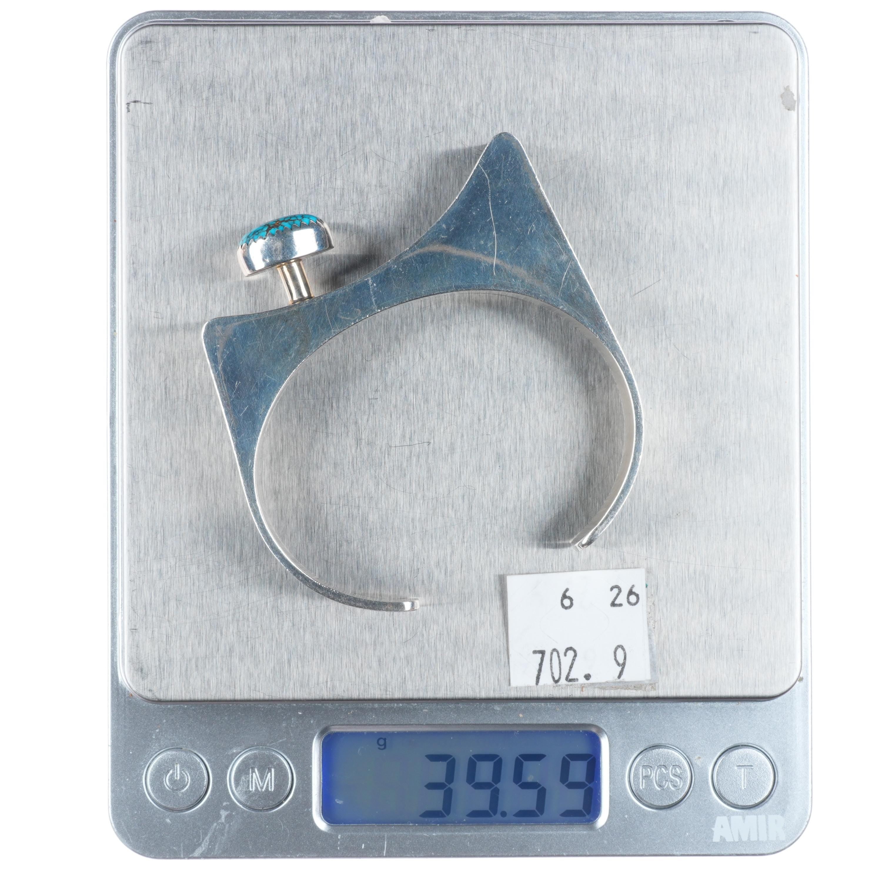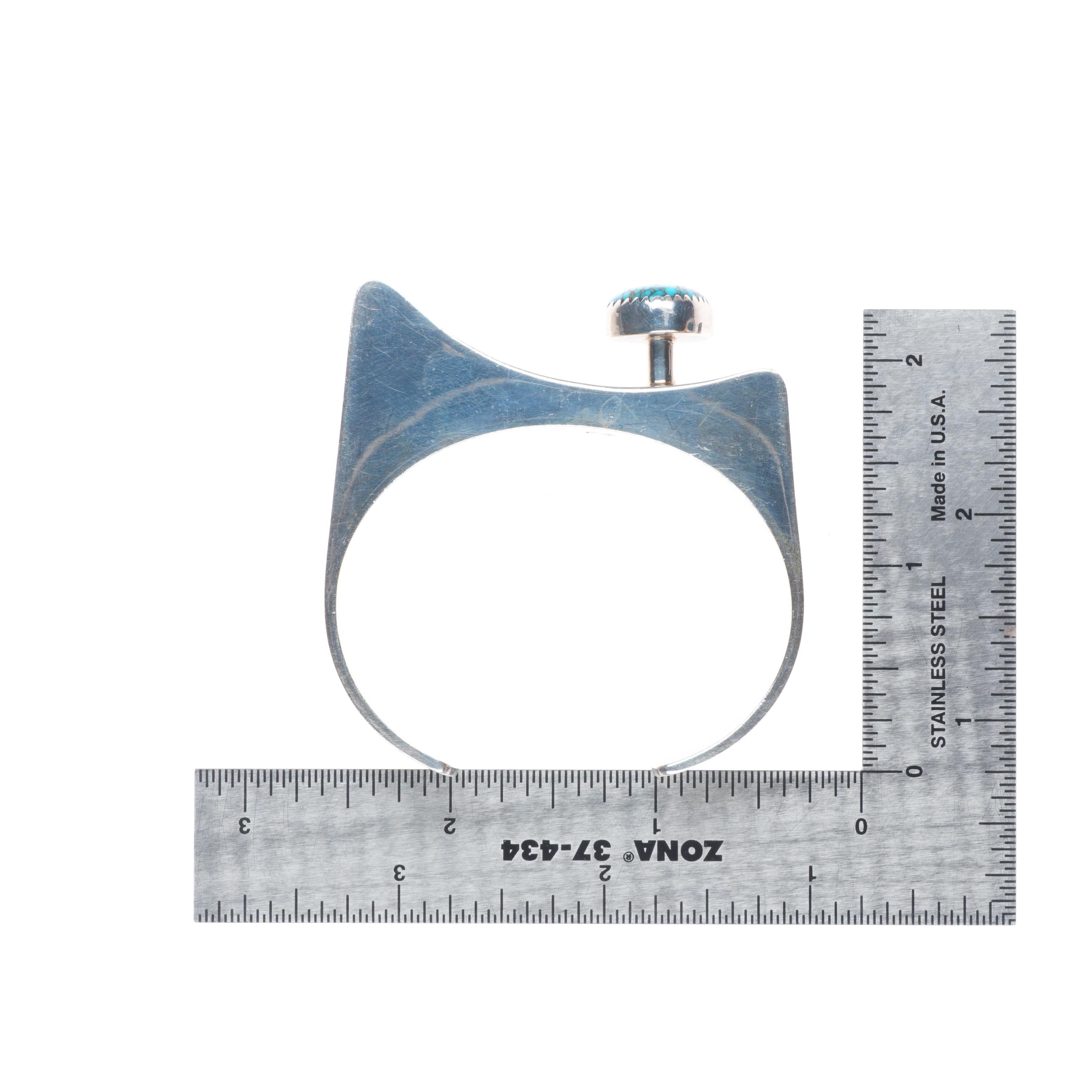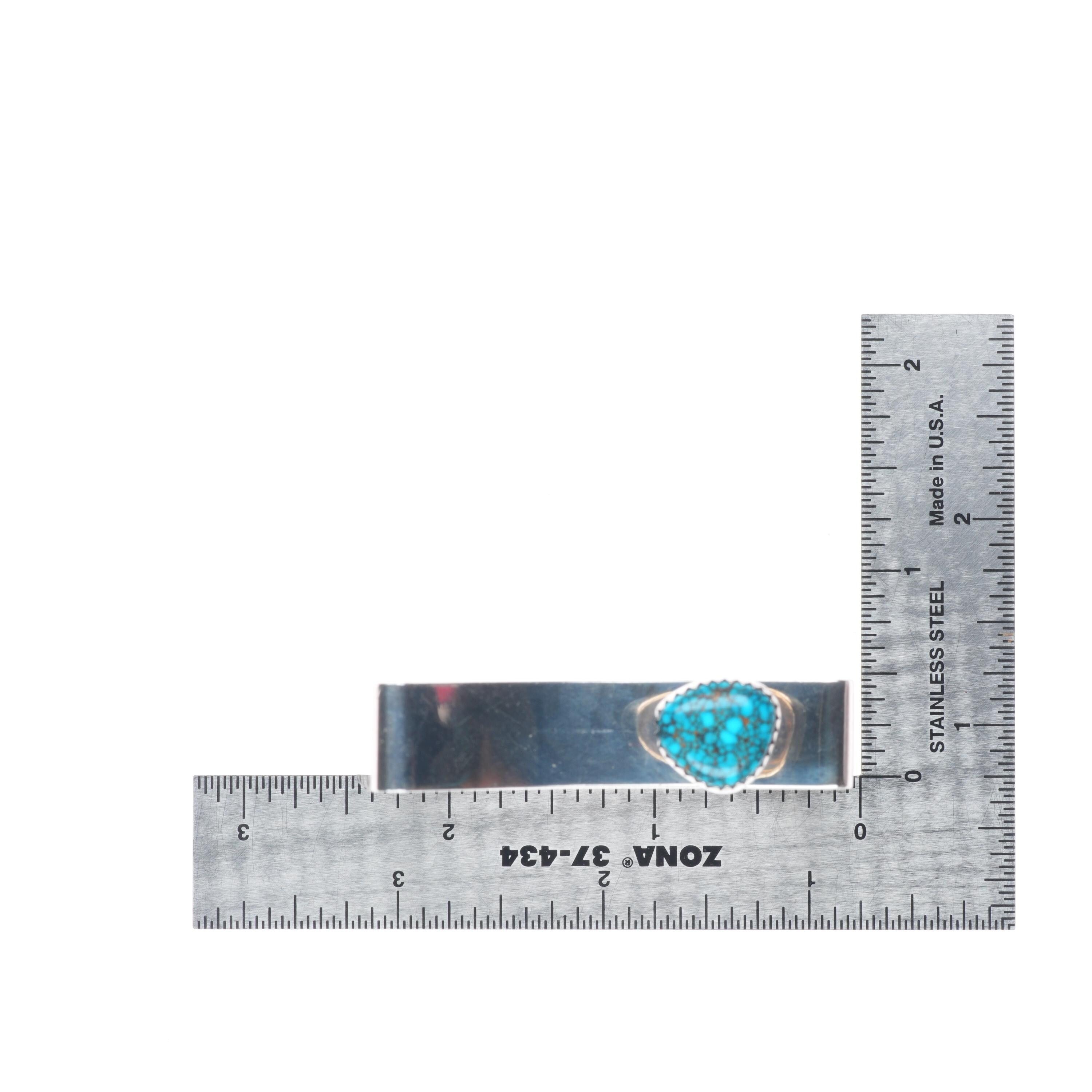 6" Harry Chavarria Santa Clara modernist sterling silver turquoise cuff bracelet. Tested and guaranteed solid sterling silver with weight and measurements in pictures. Overall expected wear circa last quarter of the 20th century. From a high end collection of Navajo and Zuni jewelry. Very high grade spiderweb turquoise that looks to be from one of the Nevada Mines.