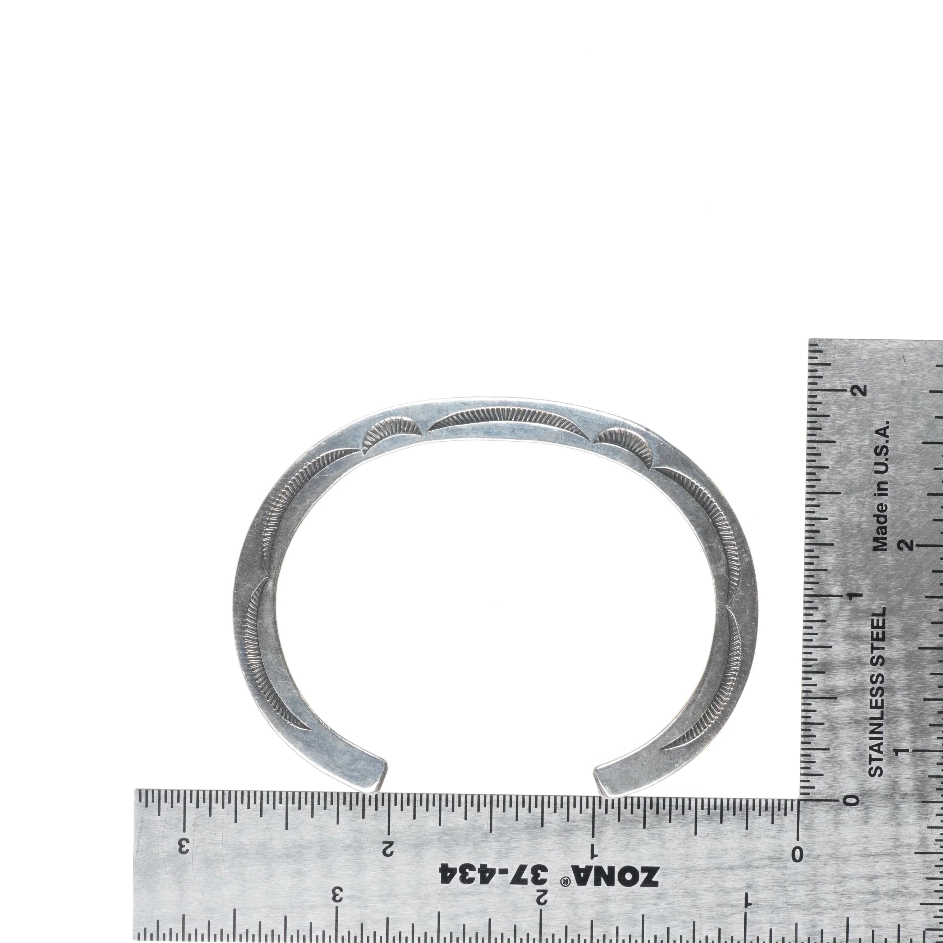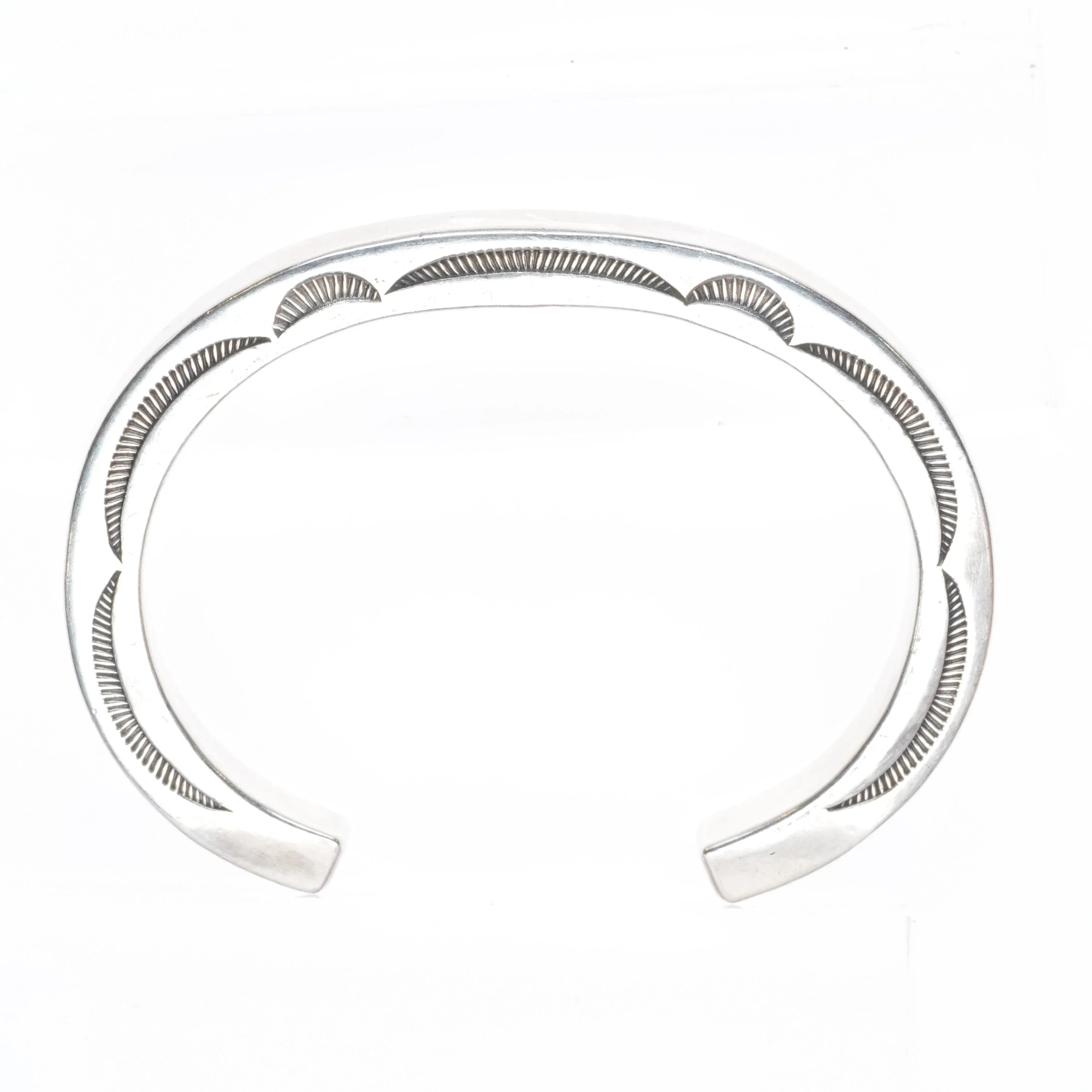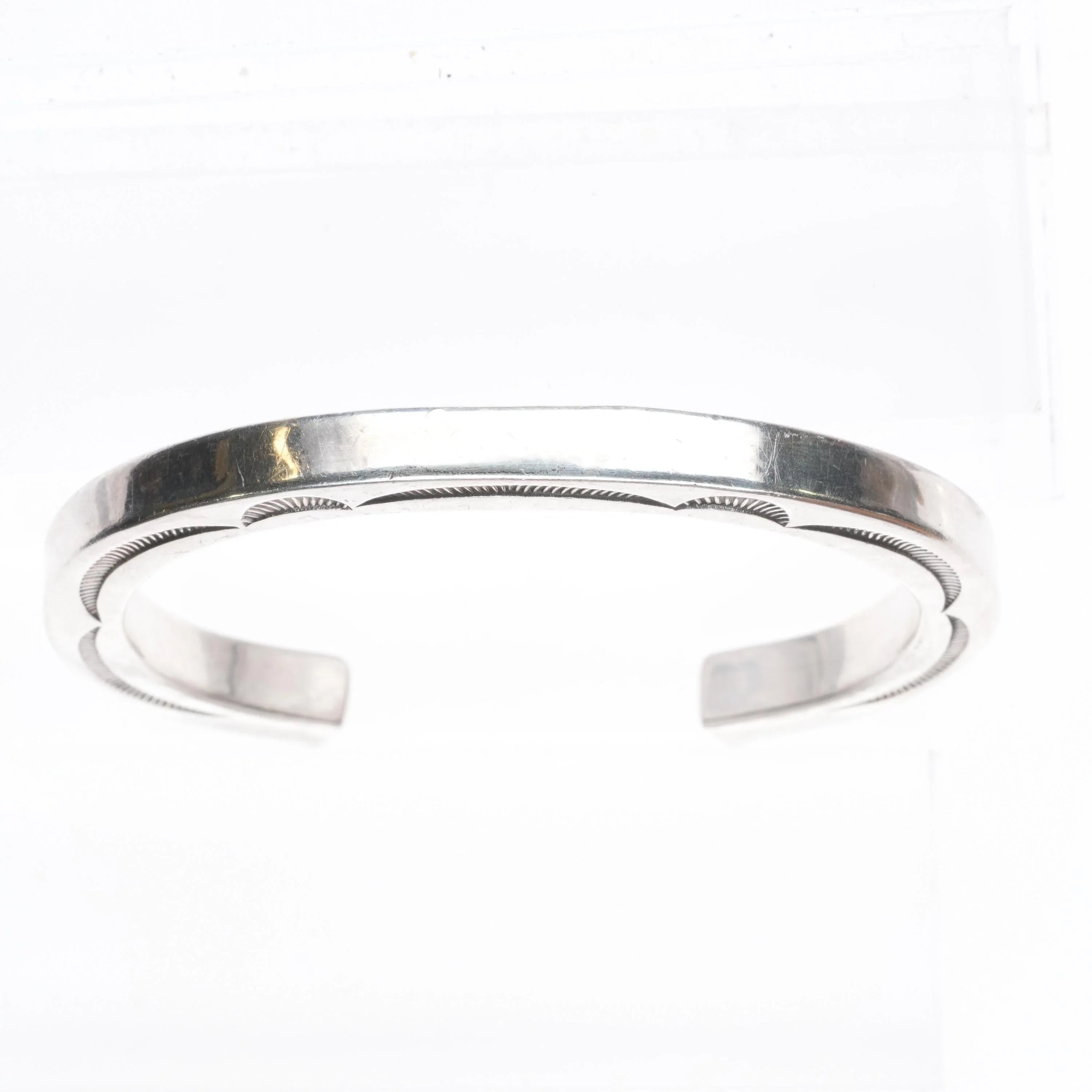 6" Orville Tsinnie Navajo hand stamped sterling silver stacker cuff bracelet. Tested and guaranteed solid sterling silver with weight and measurements in pictures. Good condition, circa last quarter of the 20th century. This and most of the items from this collection were collected but worn very little if any.