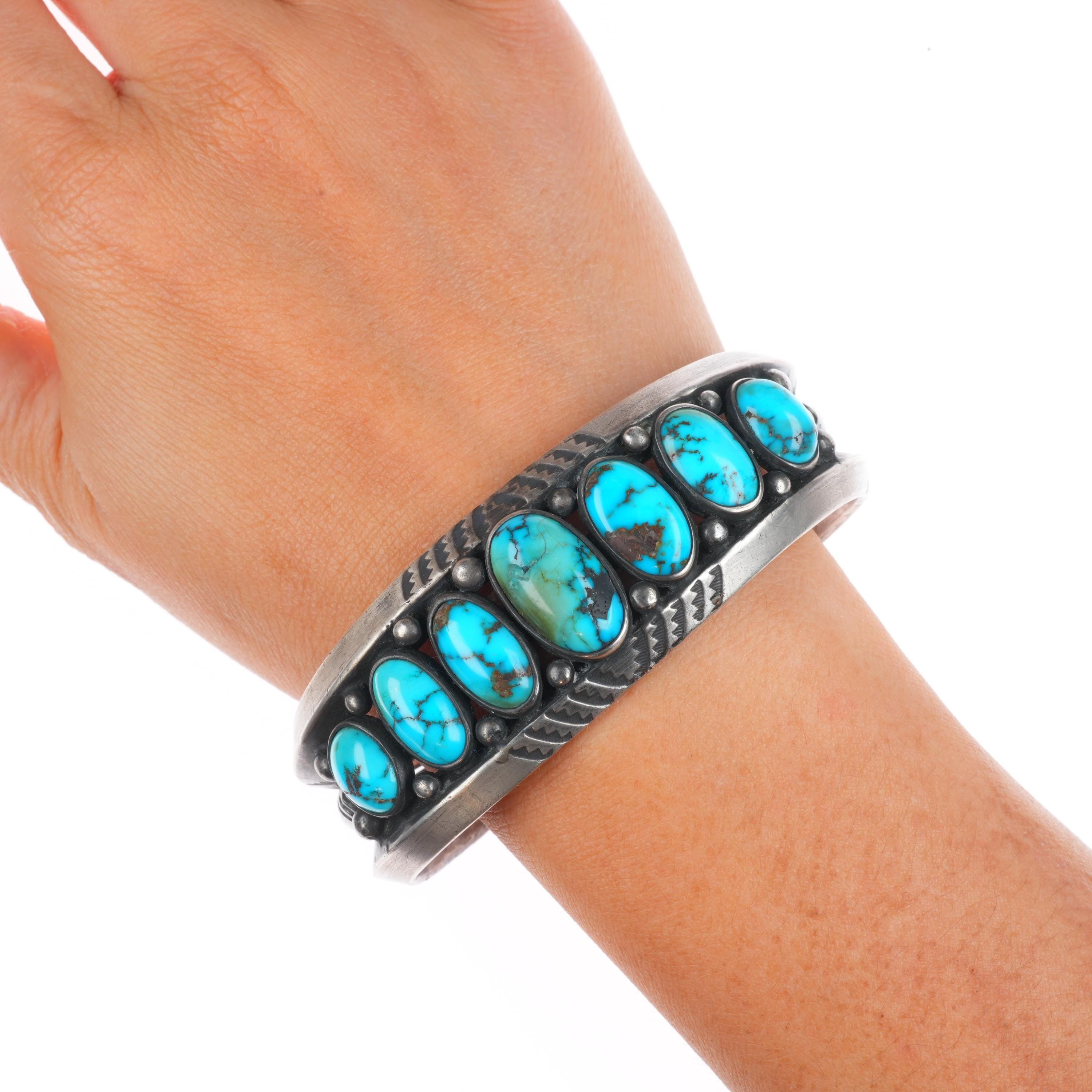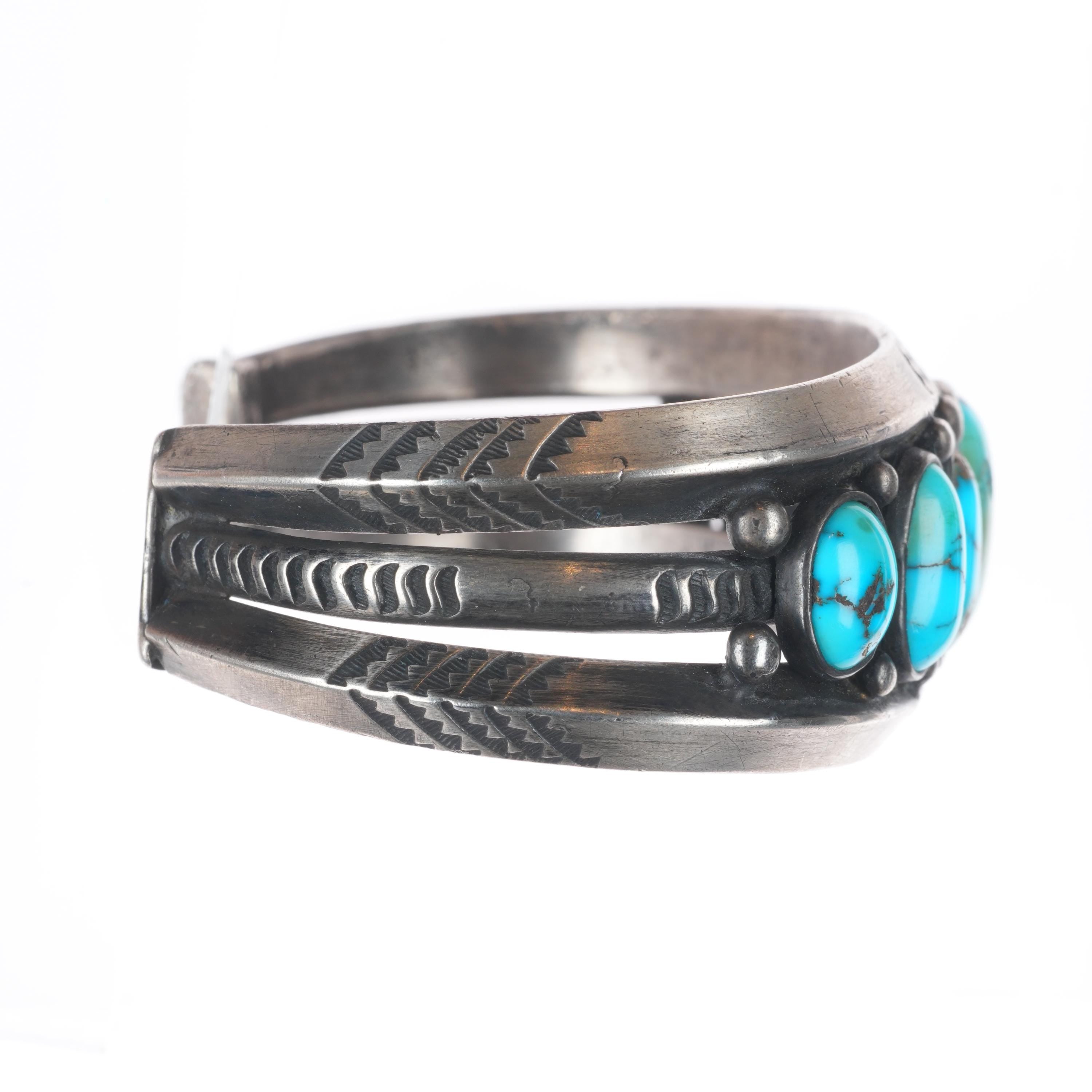 7.1" c1950 Heavy vintage high grade turquoise row cuff bracelet sterling silver. Tested and guaranteed solid sterling silver with weight and measurements in pictures. Circa mid 20th century with some expected age appropriate wear.