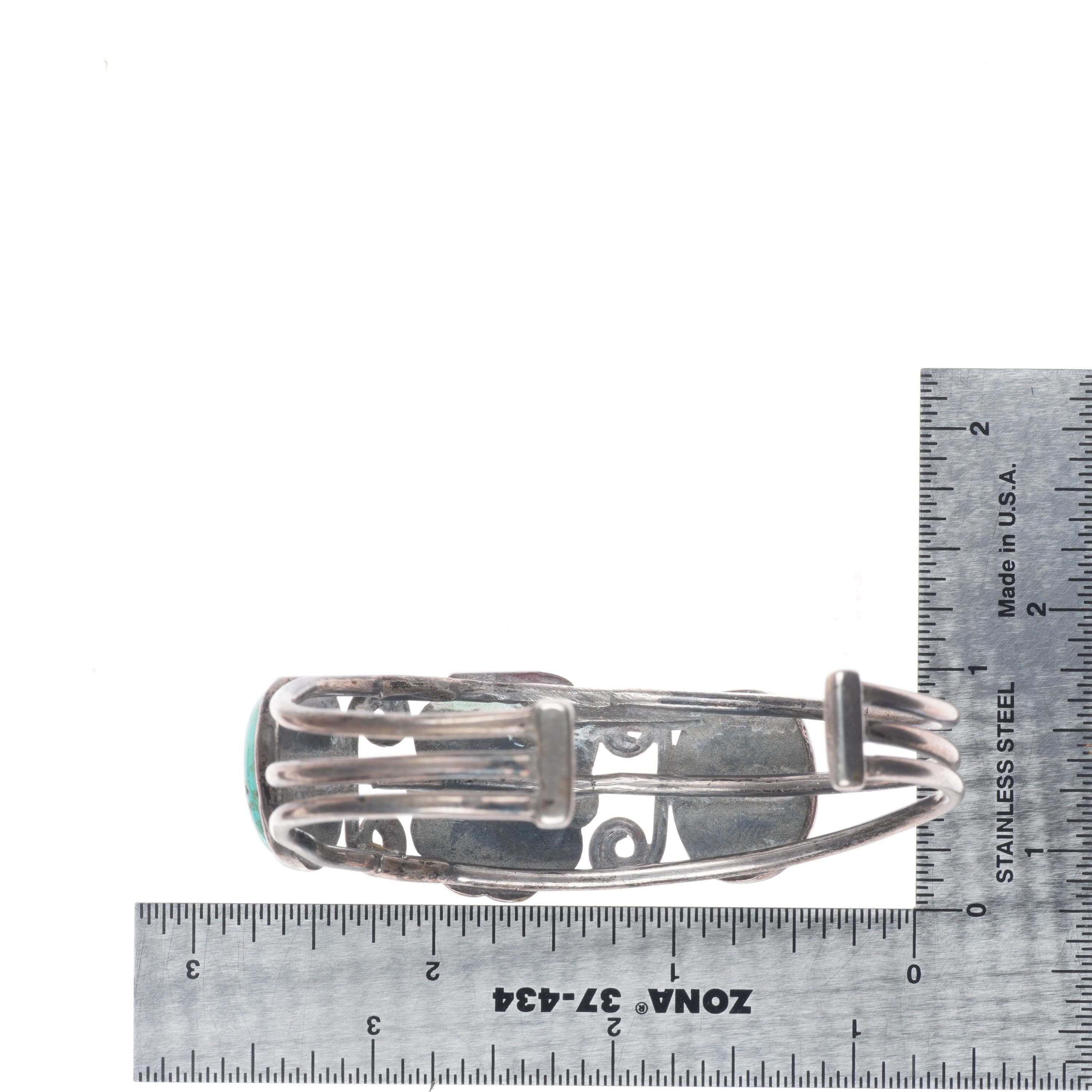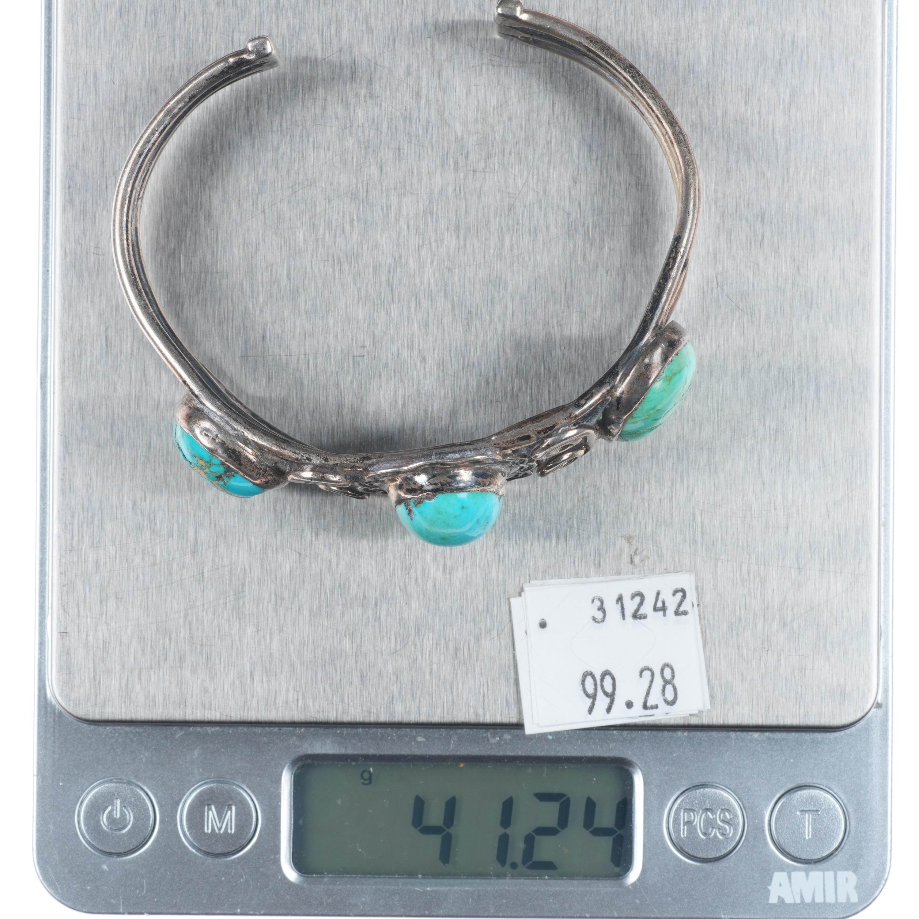 7" 1930‘s Navajo sterling silver 3 stone cuff bracelet with stamped bezel. Tested and guaranteed solid sterling silver with weight and measurements in pictures. Circa second quarter of the 20th century. Fits up to a 7" wrist without adjustment, though .25" or more of careful adjustment is typically very simple. Any adjustment will change the gap size of course which is shown in the pictures.