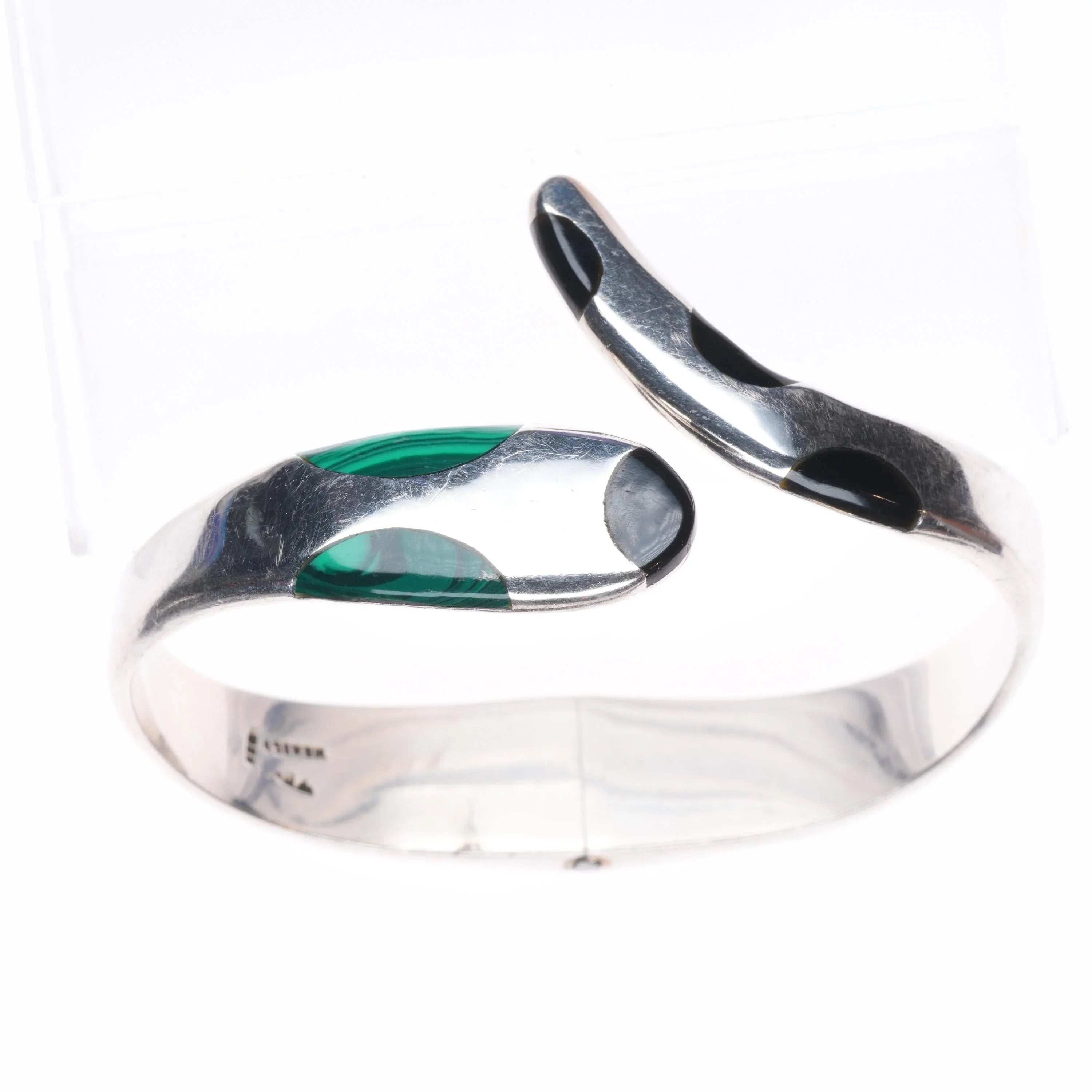 7.25" Retro Mexican sterling silver snake clamper bangle bracelet malachite/onyx