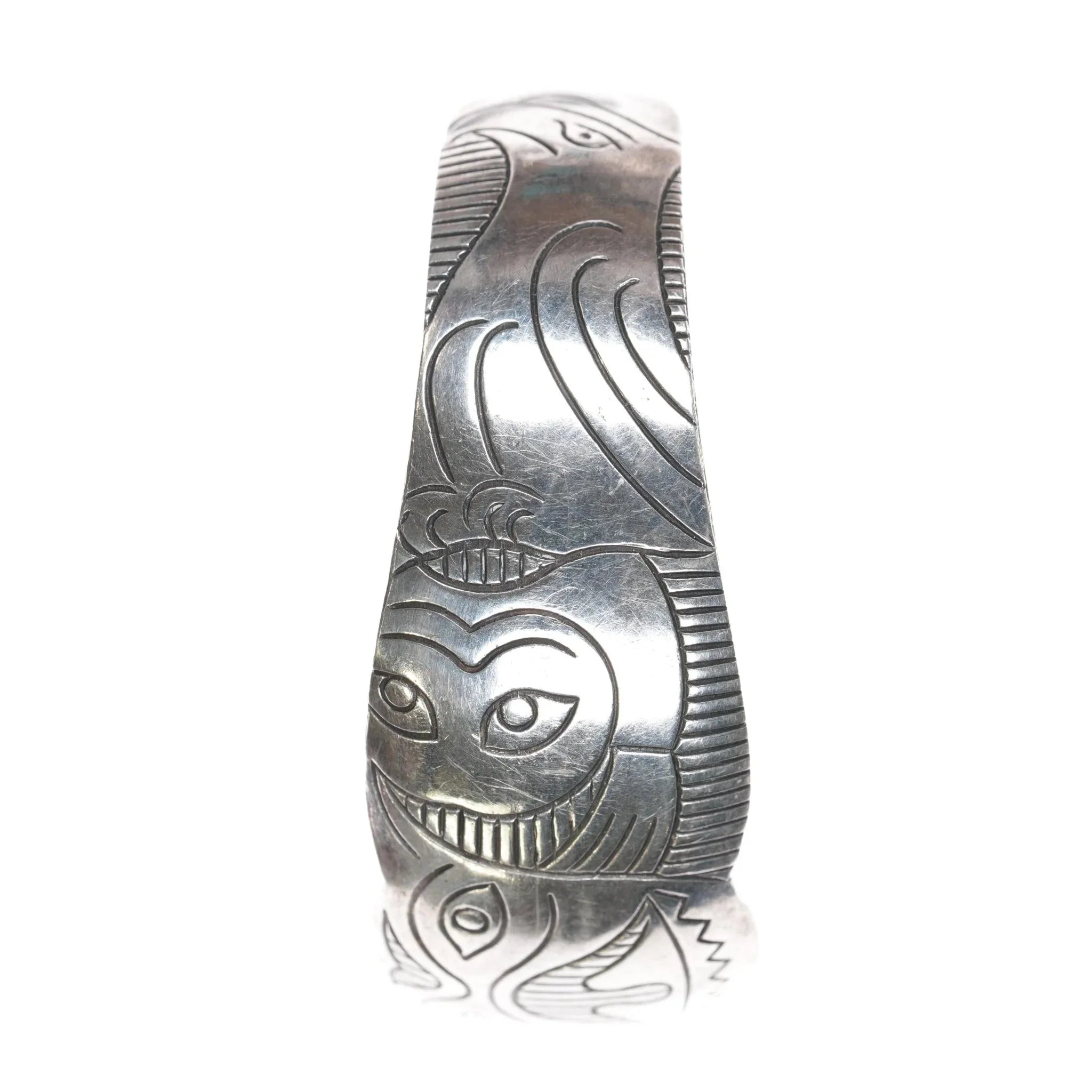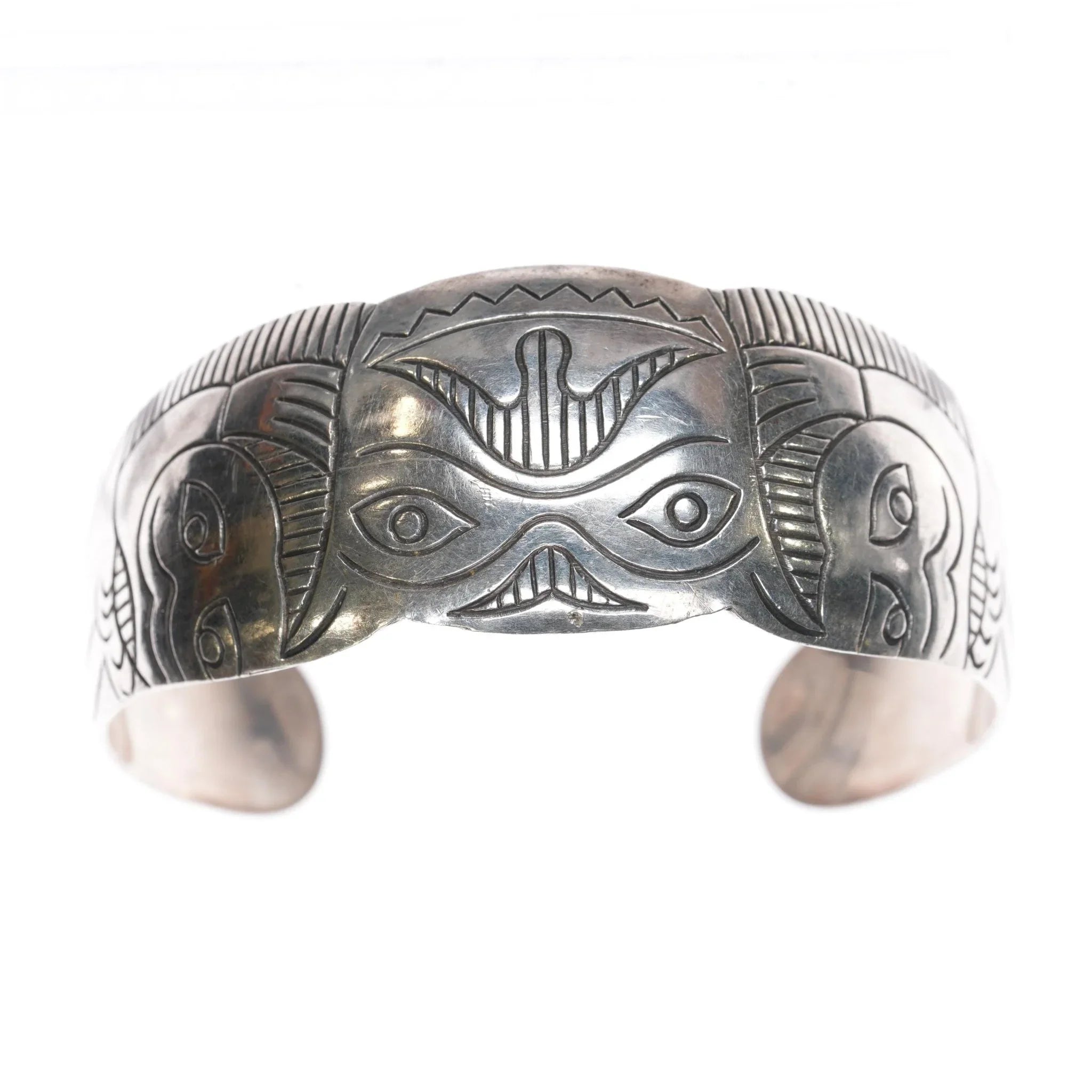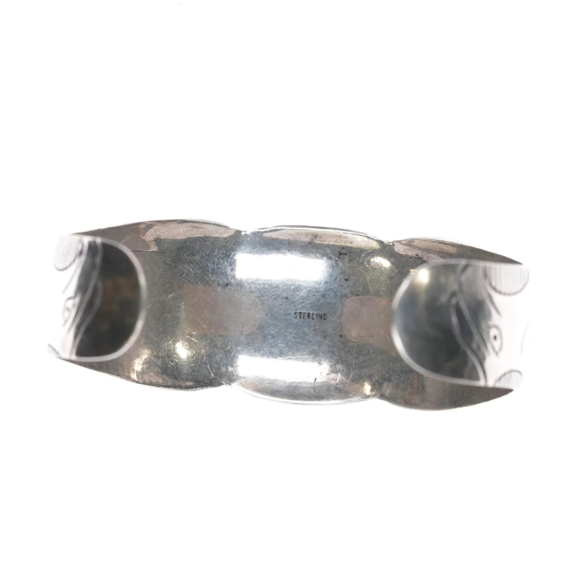 7.25" Vintage Northwest coast style sterling cuff bracelet. Weight and measurements in pics. Solid sterling, marked sterling with no other markings. Circa third quarter of 20th century.