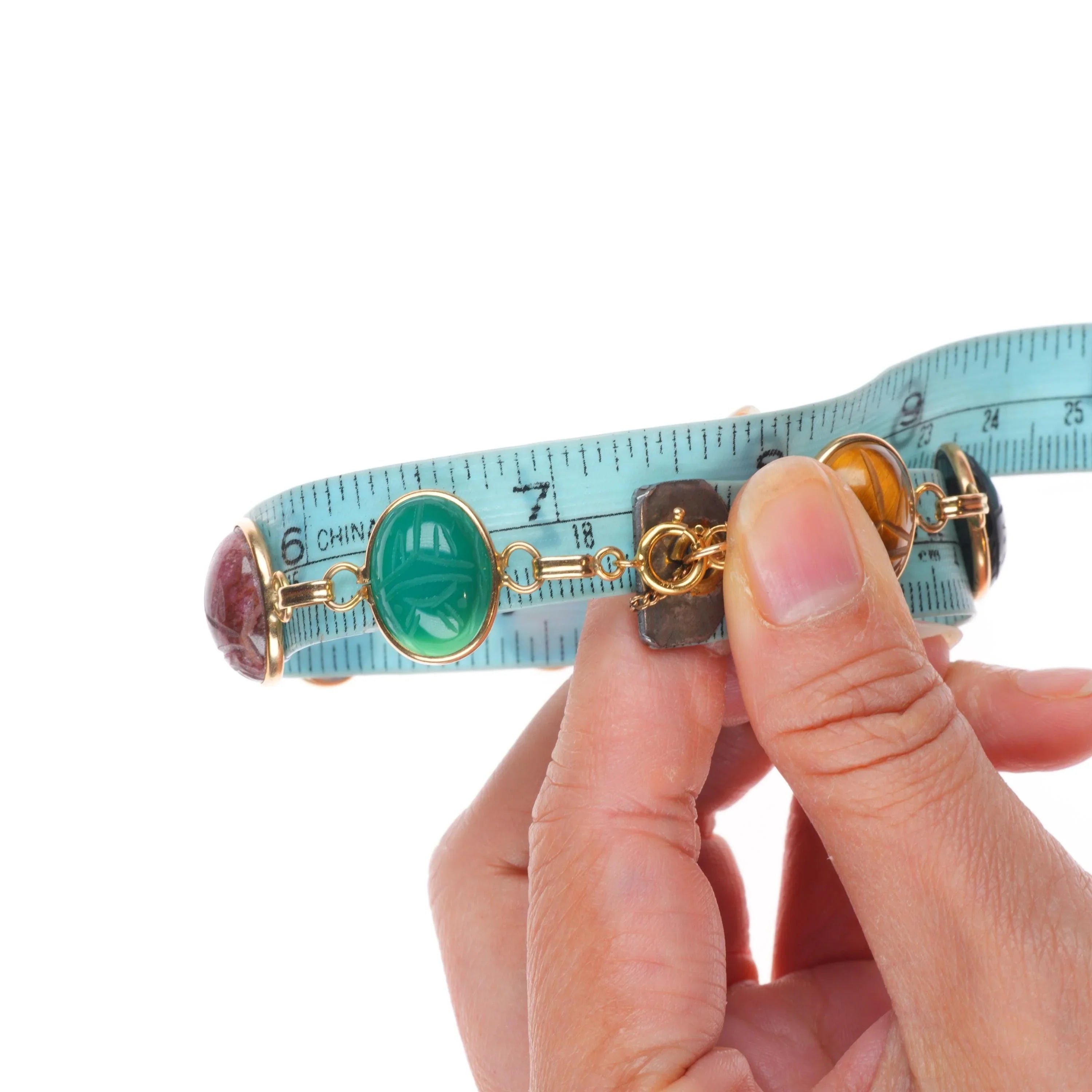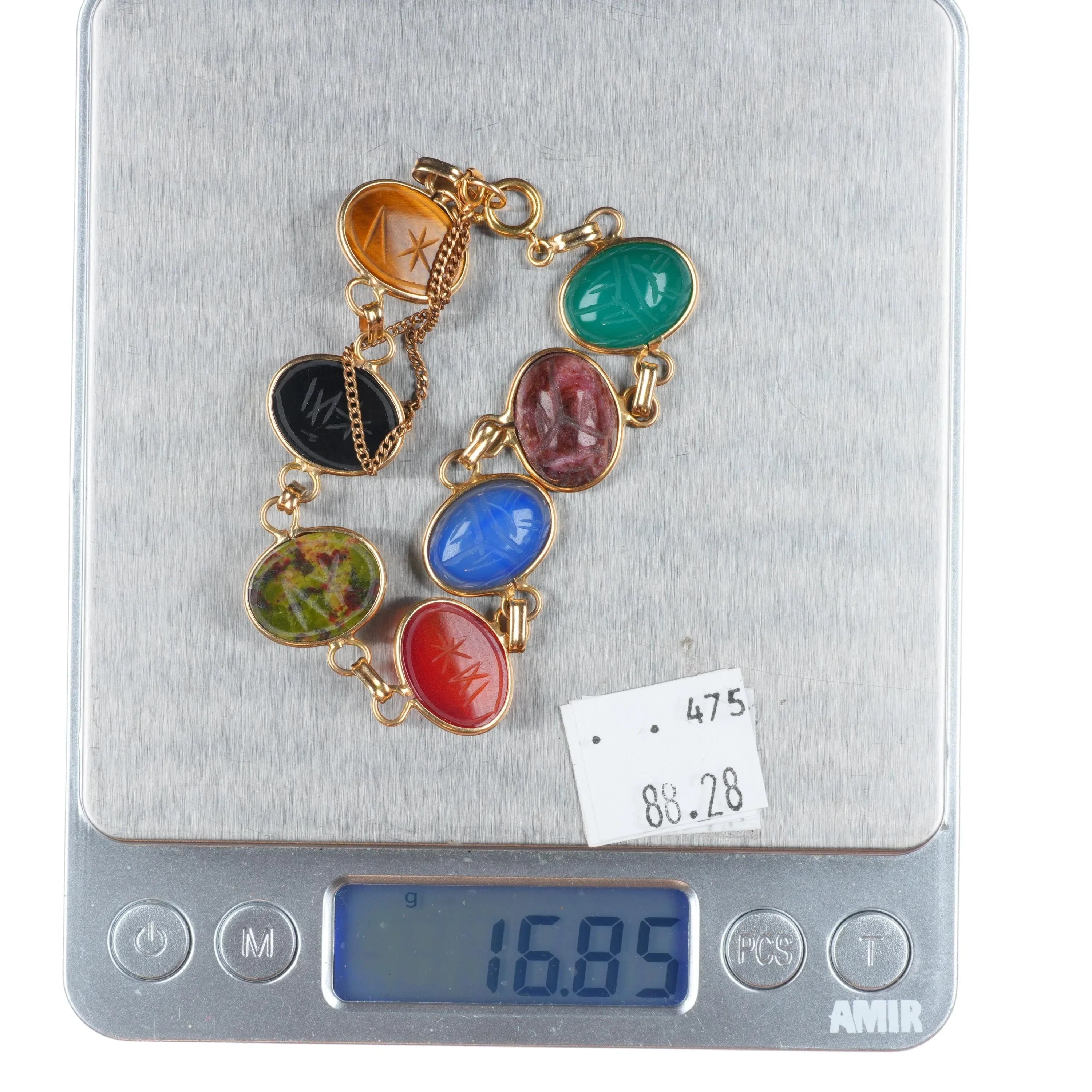7.25" vintage solid 14k gold multi-stone carved Scarab link bracelet . Weight and measurements in pictures Marked, tested, and guaranteed solid 14k gold with semi-precious stones. Circa third quarter of the 20th century with no issues.