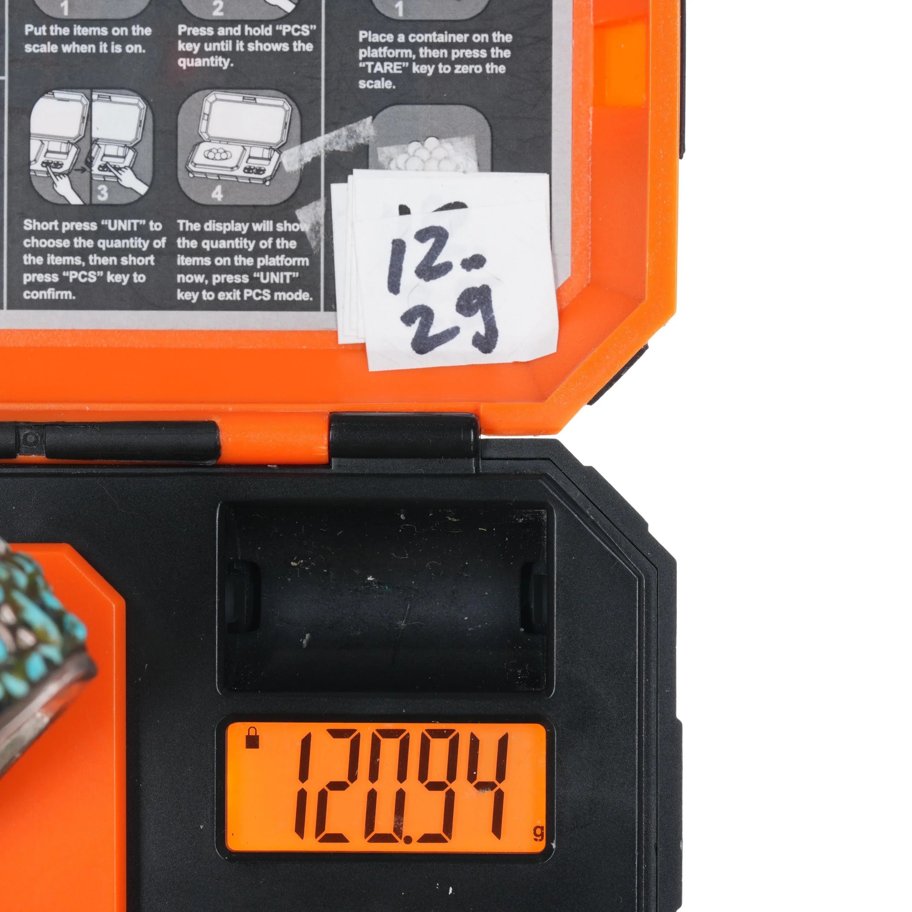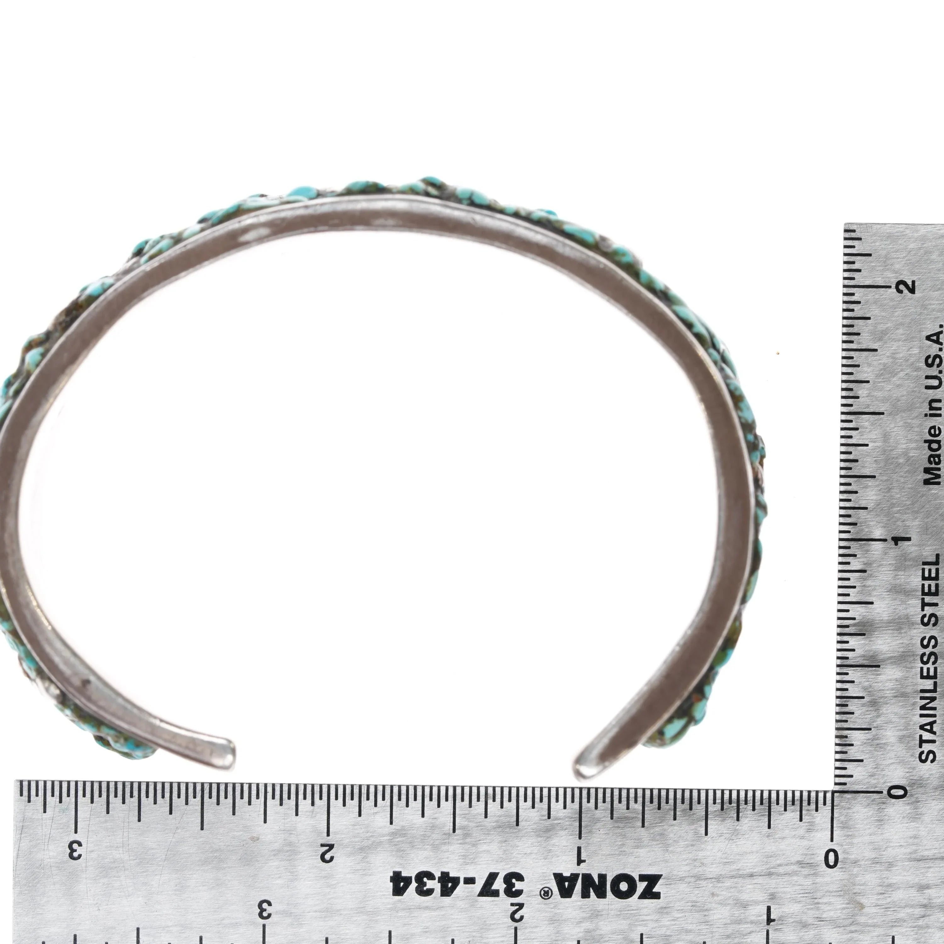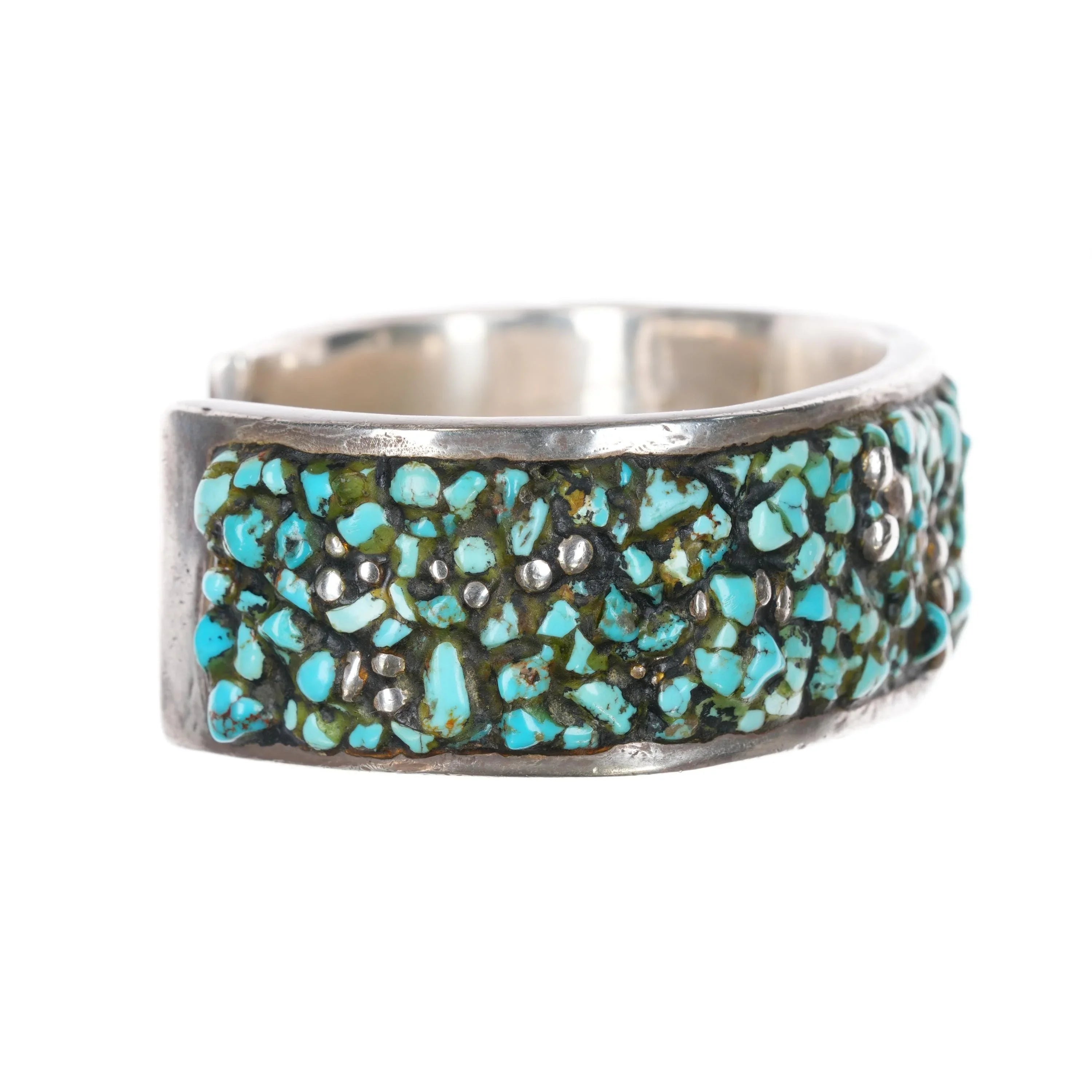 7 3/8" Large, Strange, Heavy sterling turquoise pebble epoxy cuff bracelet. Weight and measurements in pics, no issues other than one pebble appears to be missing. Circa 1970‘s, solid sterling silver with no apparent markings.