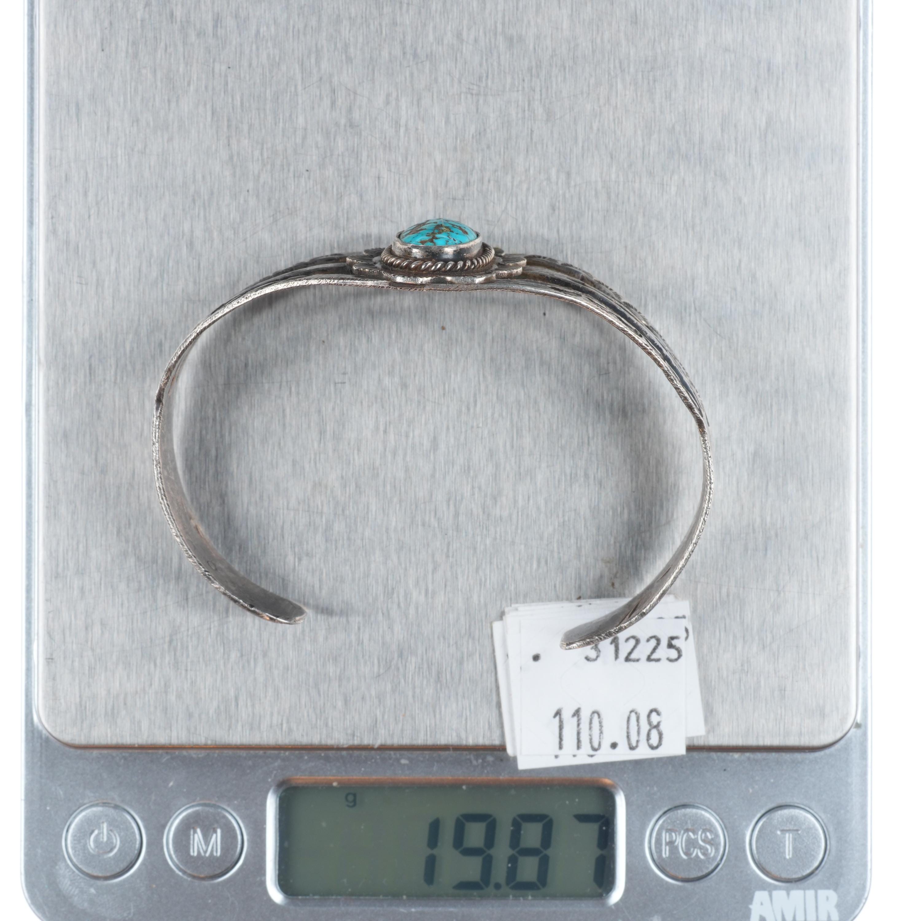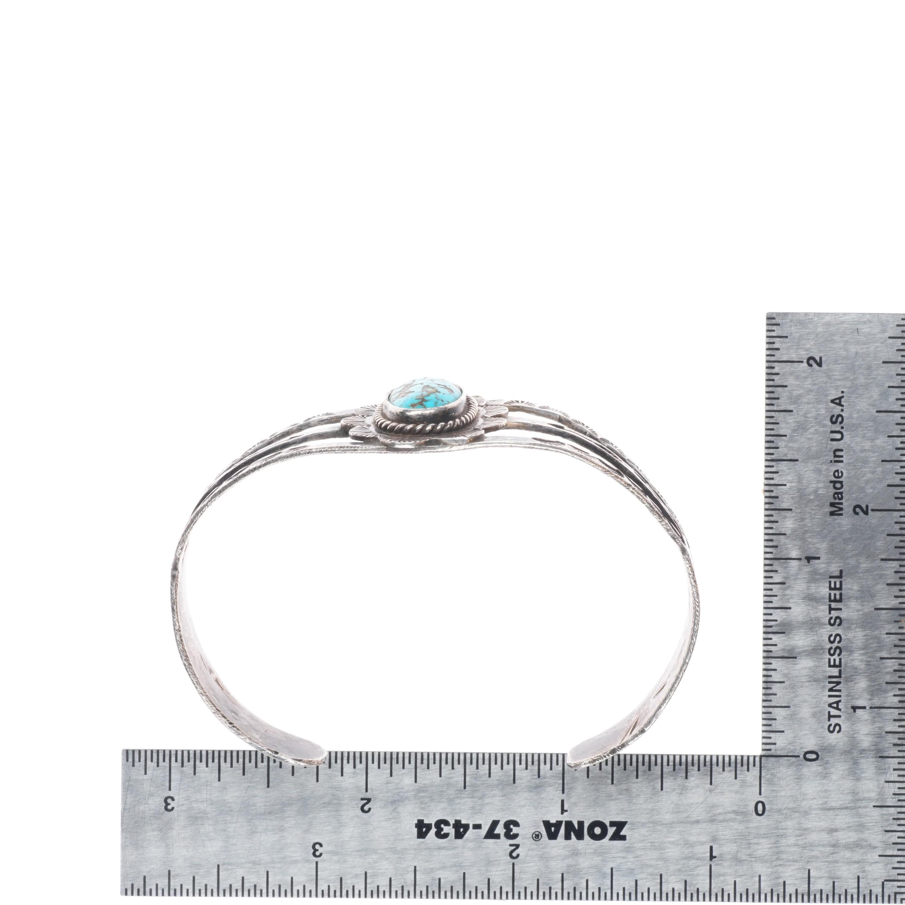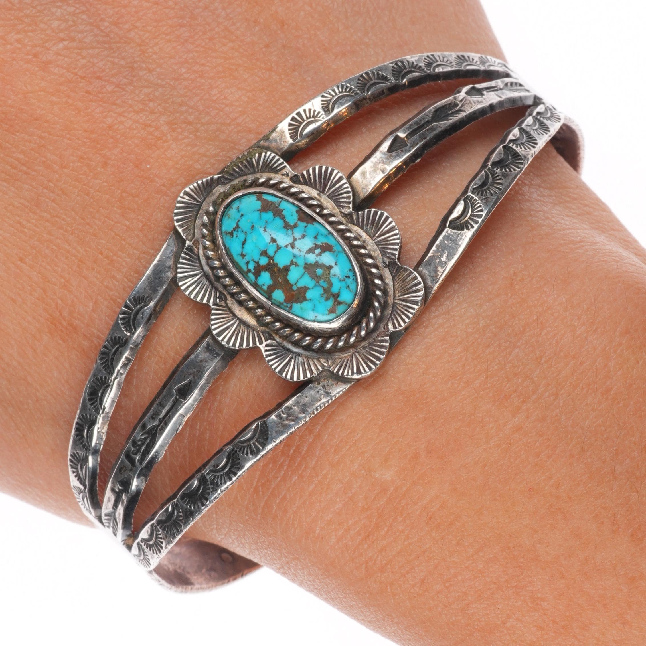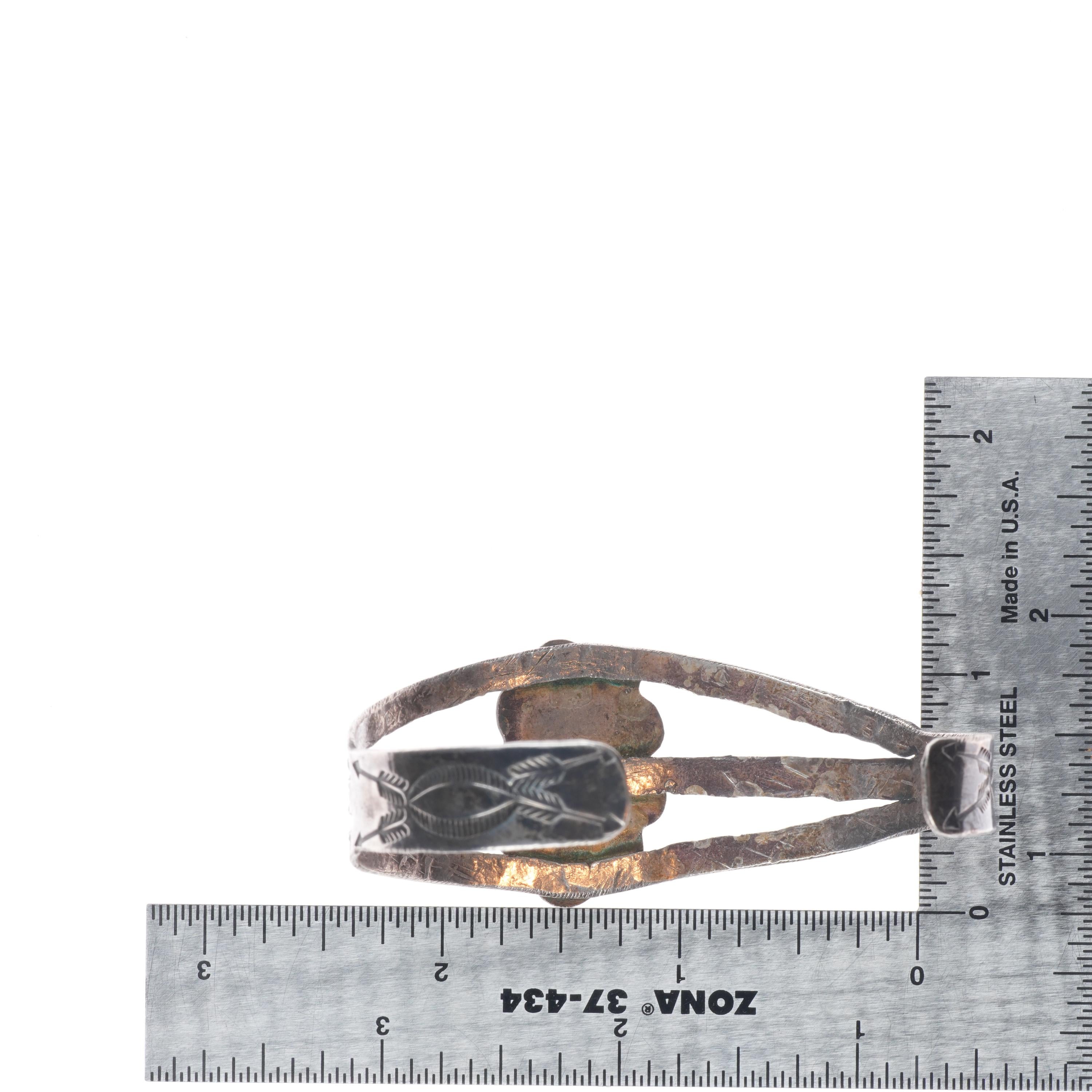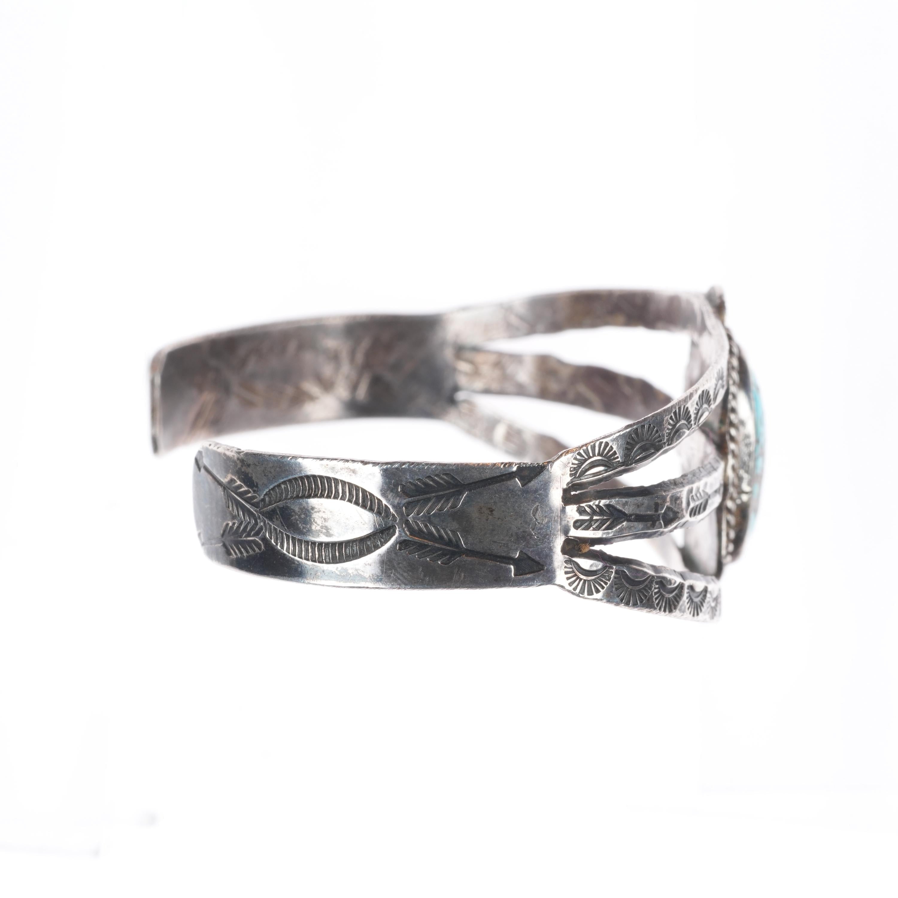 7" 30‘s-40‘s Navajo sterling silver arrow stamped cuff bracelet w/Nice turquoise. Tested and guaranteed solid sterling silver with weight and measurements in pictures. Fits up to a 7" wrist. Circa second quarter of the 20th century.