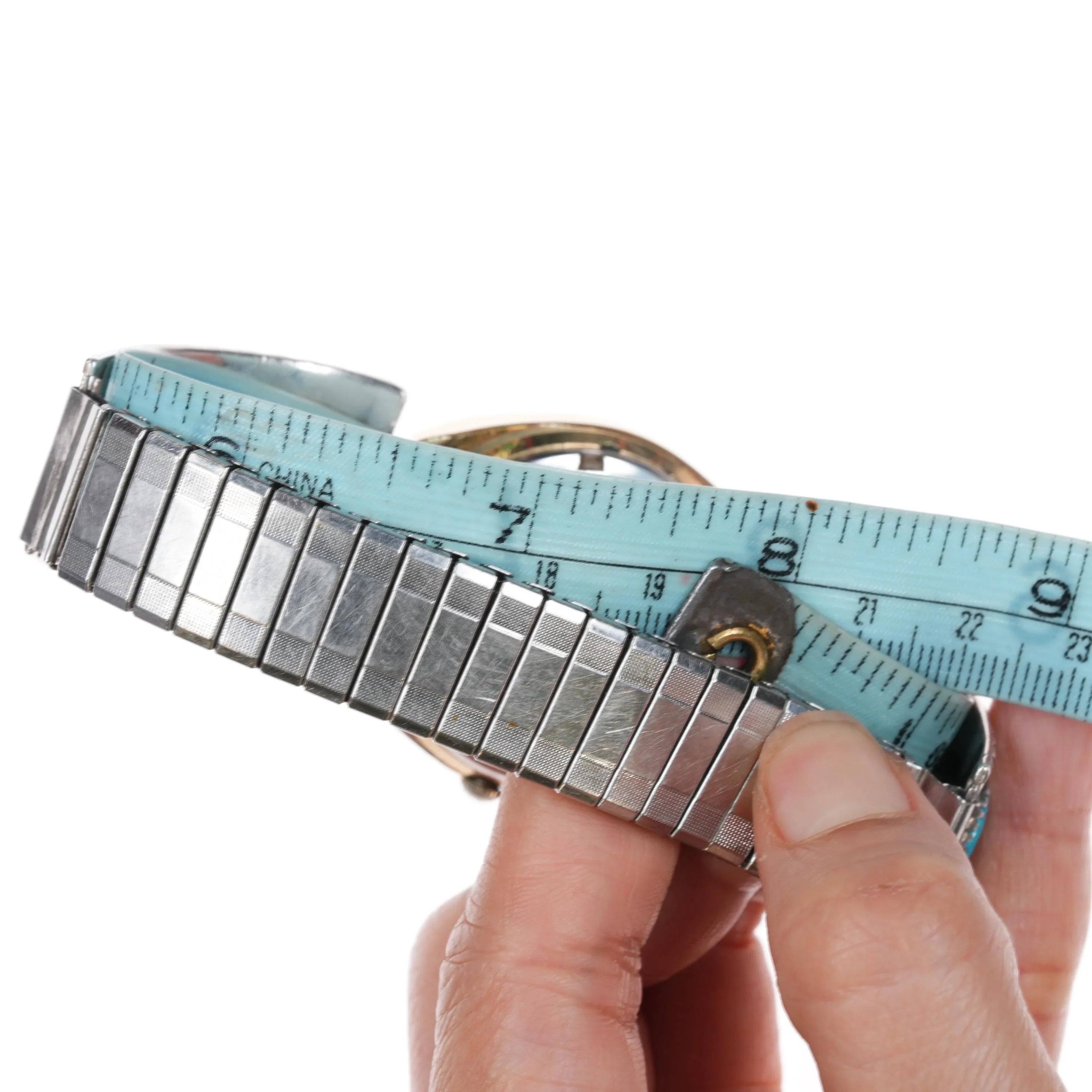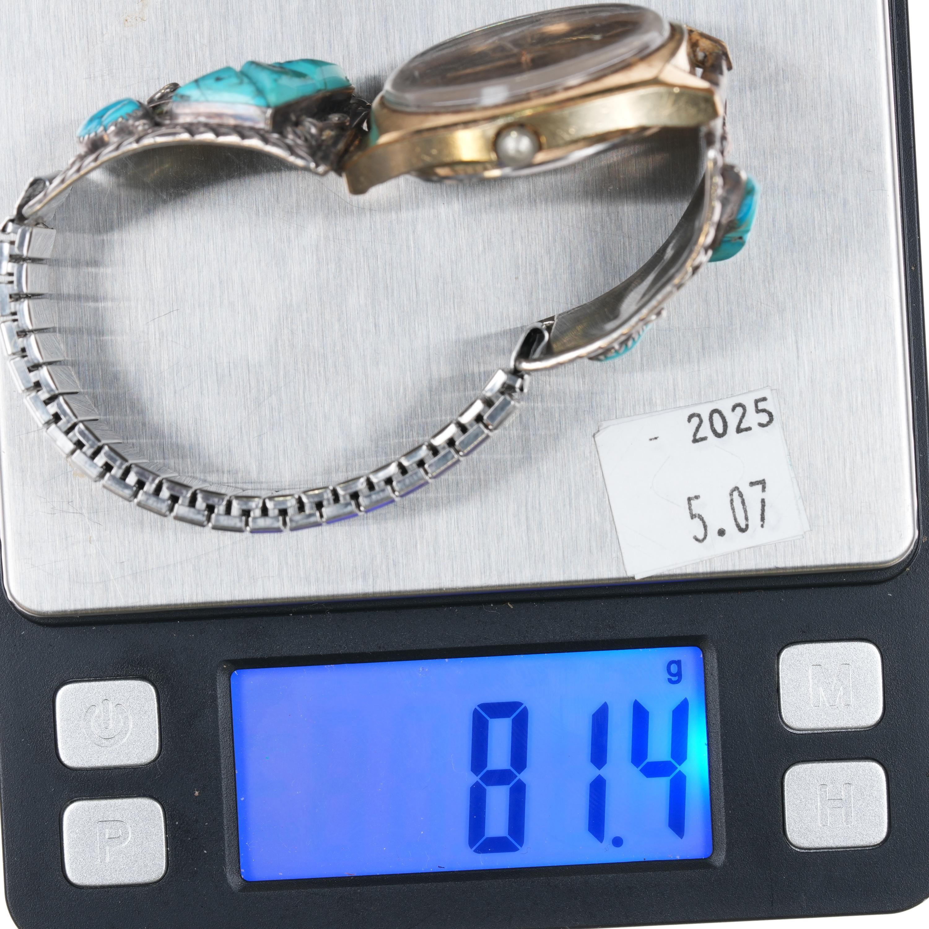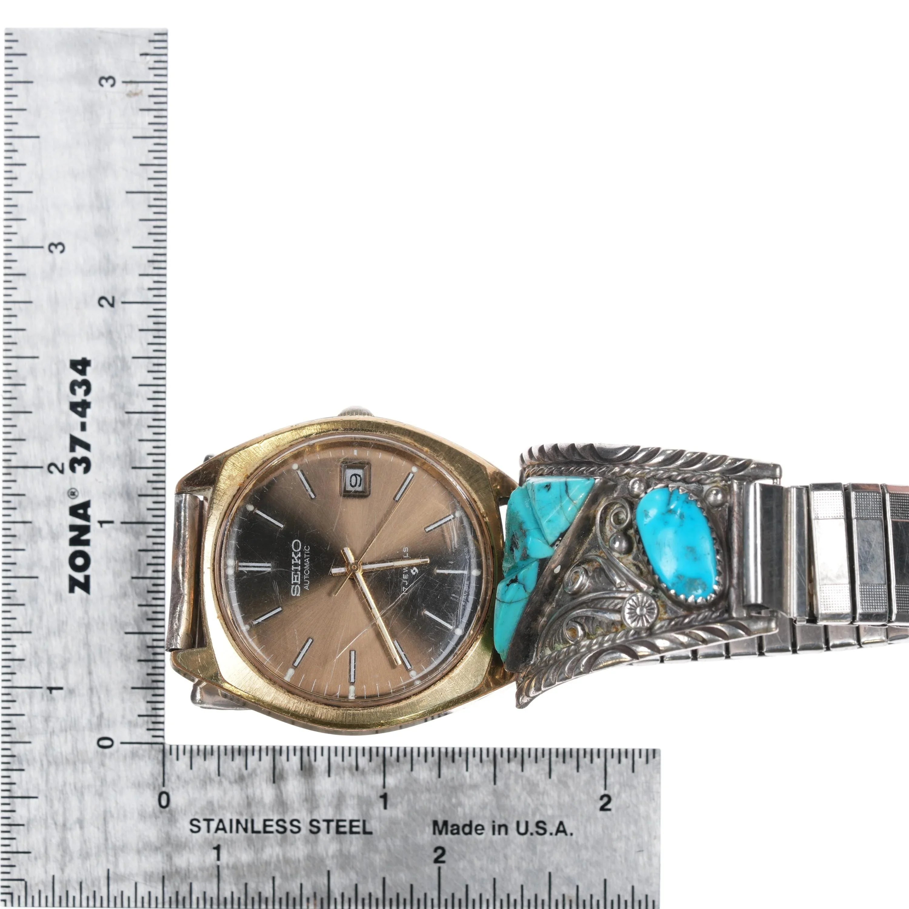 7.5" CW 80‘s Navajo sterling silver turquoise watch tips Automatic Seiko. Weight and measurements in pictures, solid sterling silver tips. Stretchy band and watch not silver. Watch is an Automatic watch made in Japan, I shook it and it kept ticking. I have not tested it for accuracy. Watch stretched wider to put it on. Some scratches to watch/crystal.
