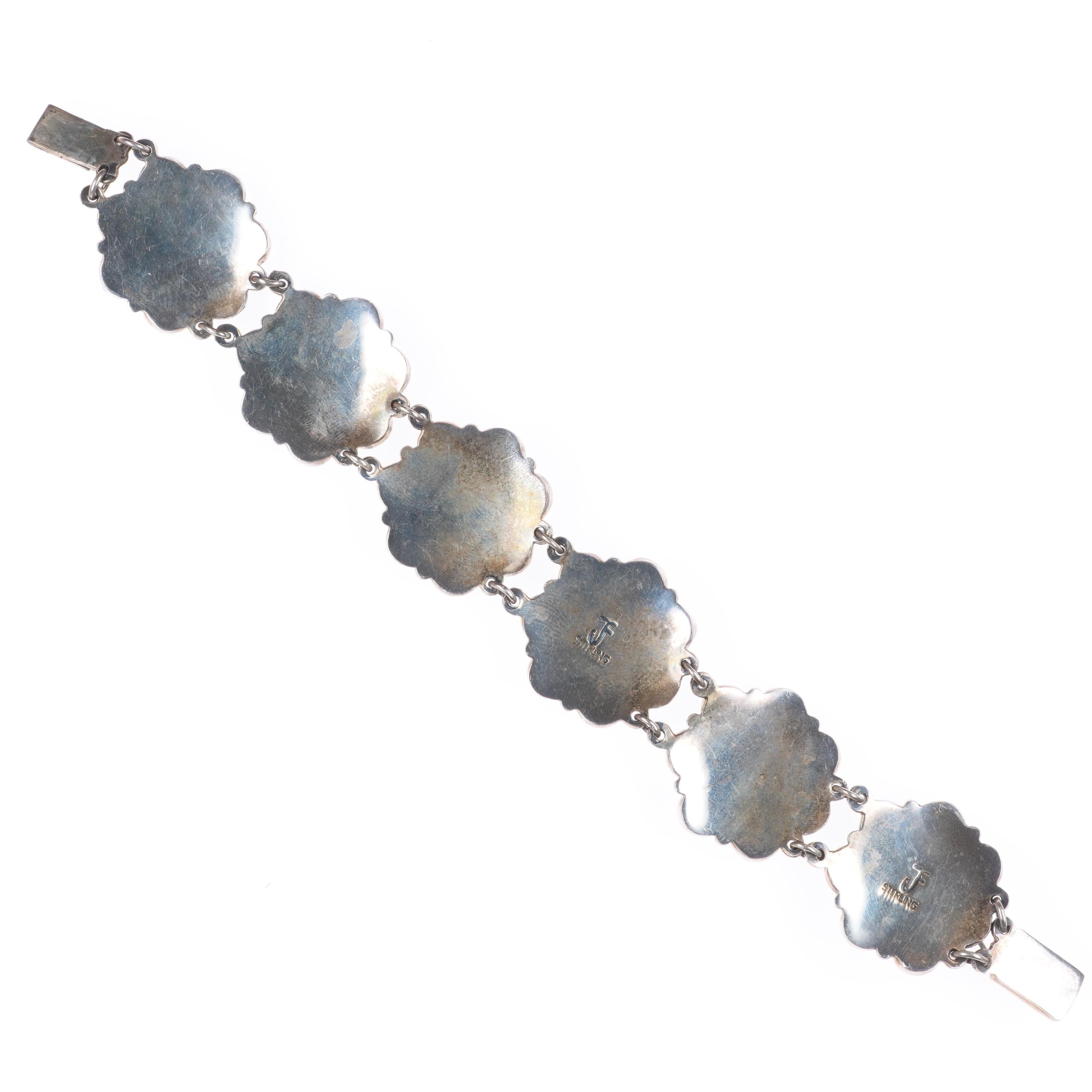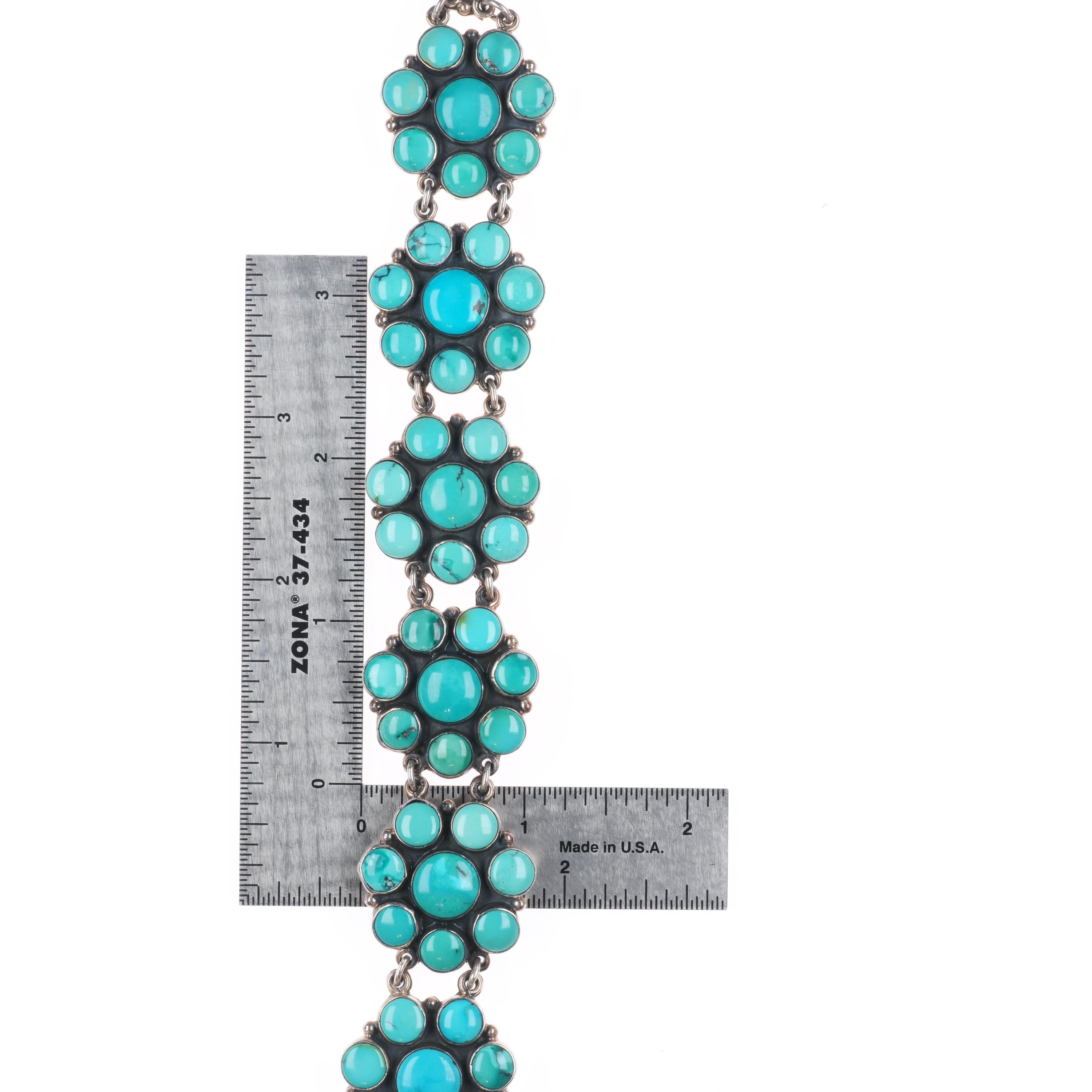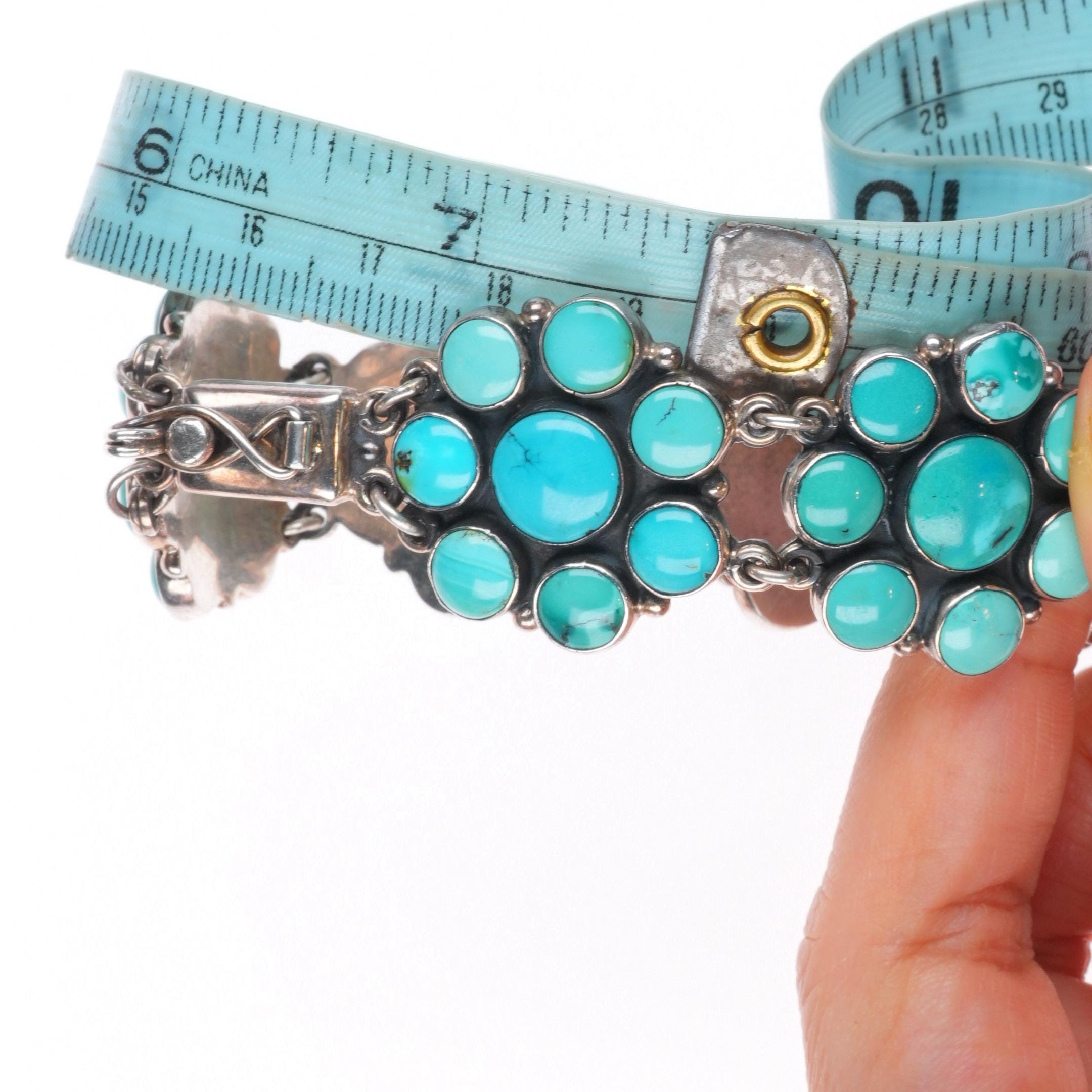 7.5" Federico Jimenez sterling silver turquoise flower cluster link bracelet . Tested and guaranteed solid sterling silver with weight and measurements in pictures. Circa last quarter of the 20th century with age appropriate wear..