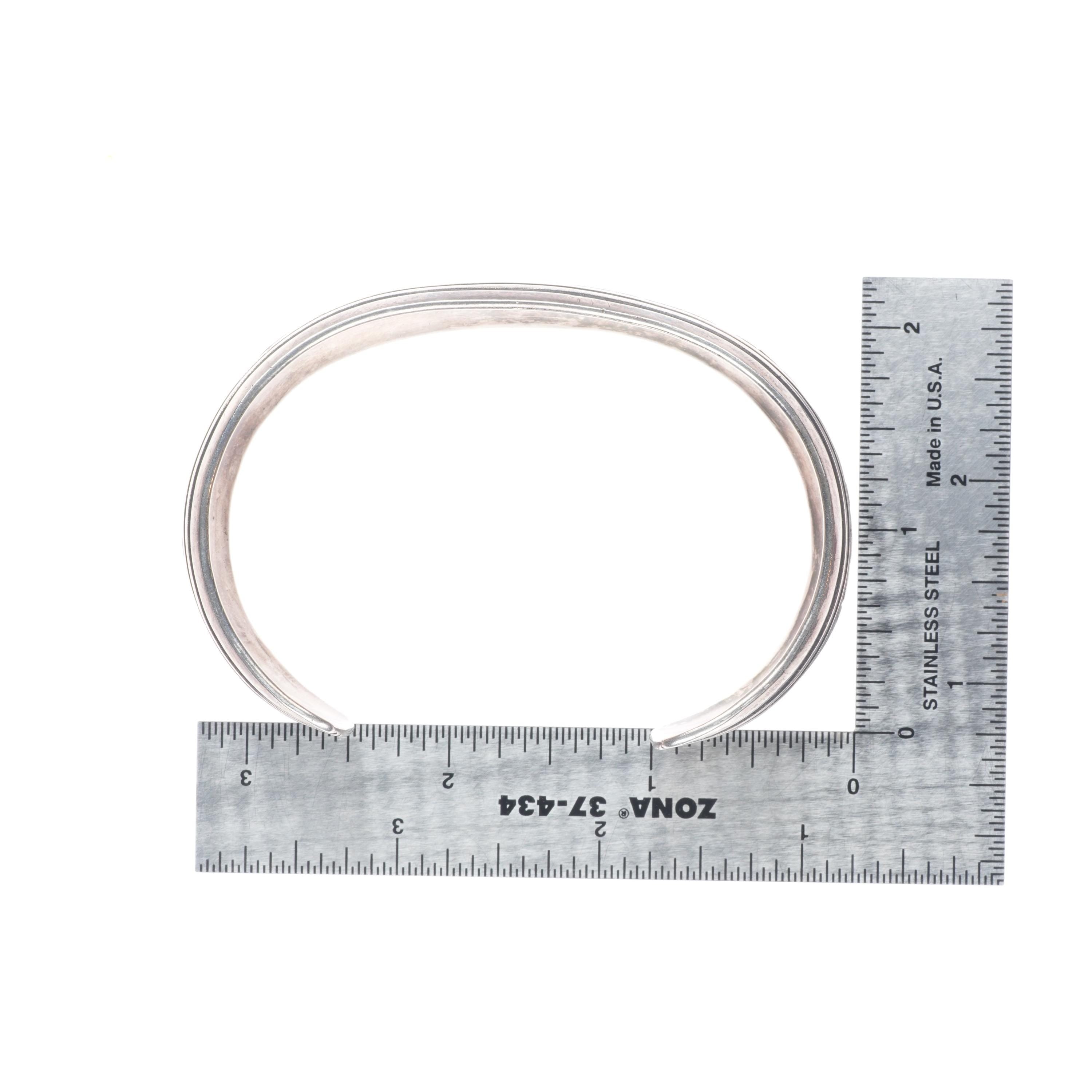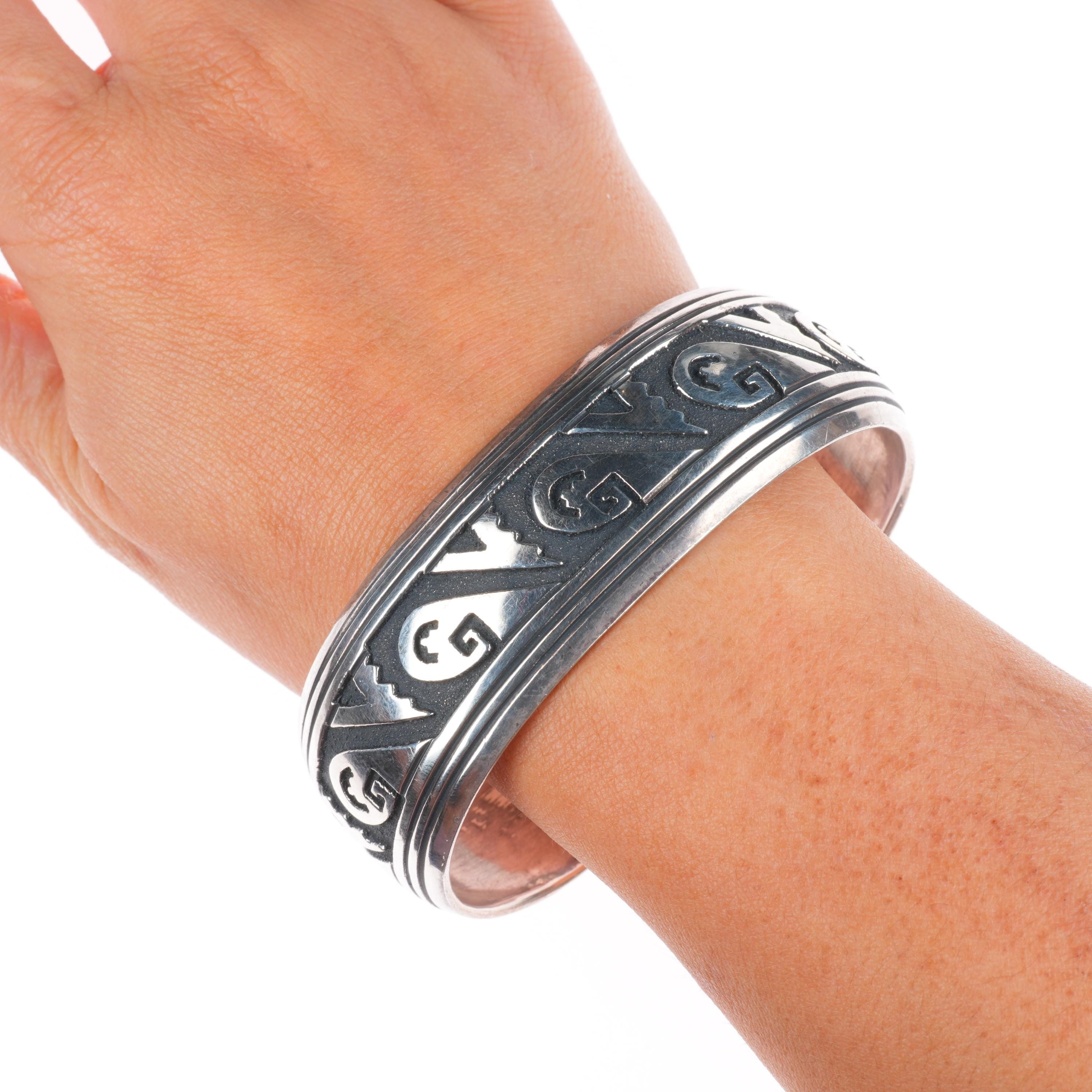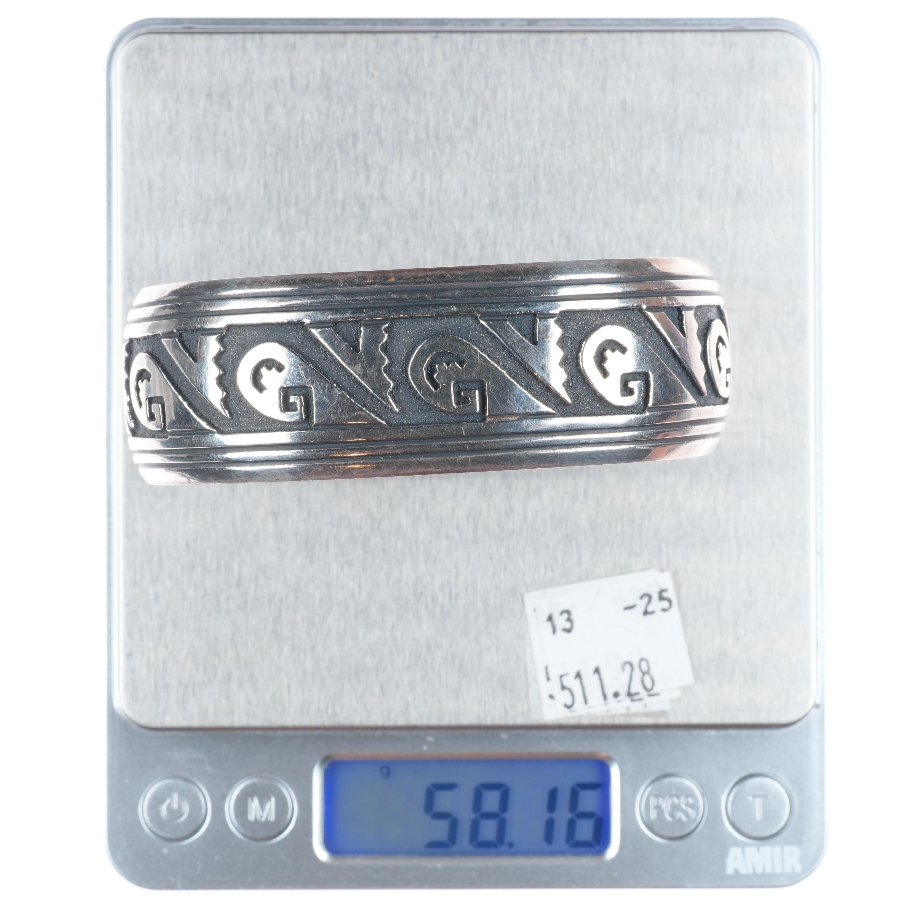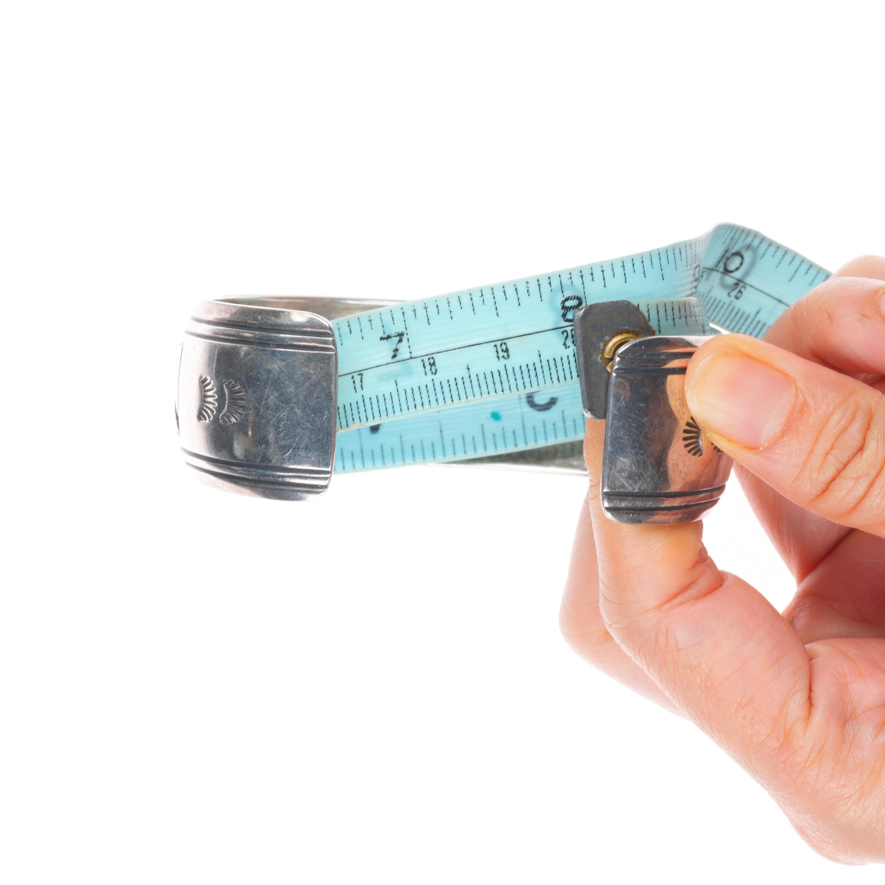 7.75" Vintage Navajo Tommy Singer large sterling silver cuff bracelet. Tested and guaranteed solid sterling silver with weight and measurements in pictures. Circa last quarter of the 20th century with some expected age appropriate wear. I know this shows 8", but it's a convex bracelet in the interior and she measured the inside of the convex, so it's more like 7.75".