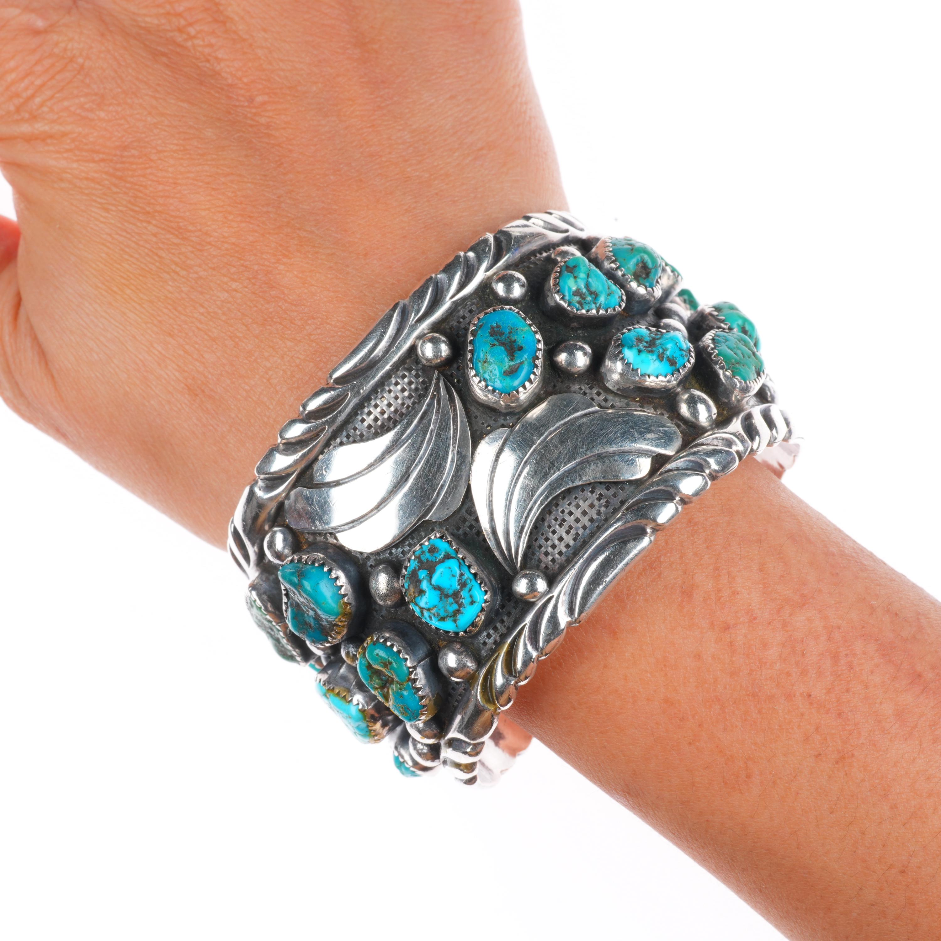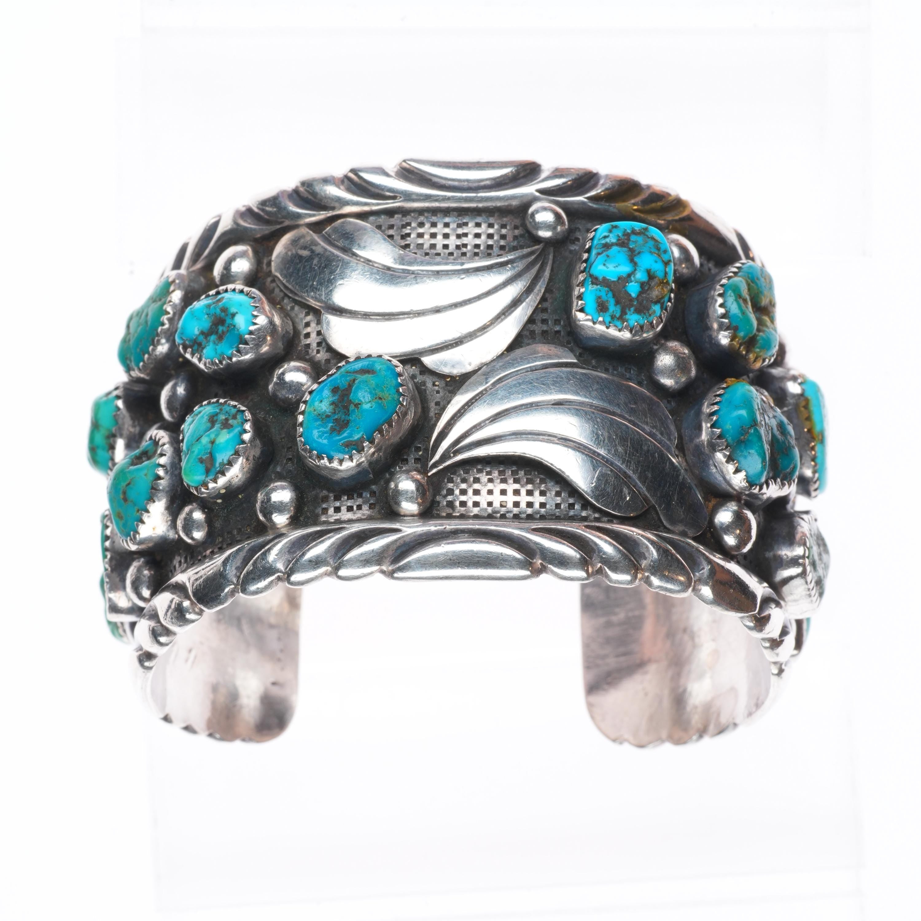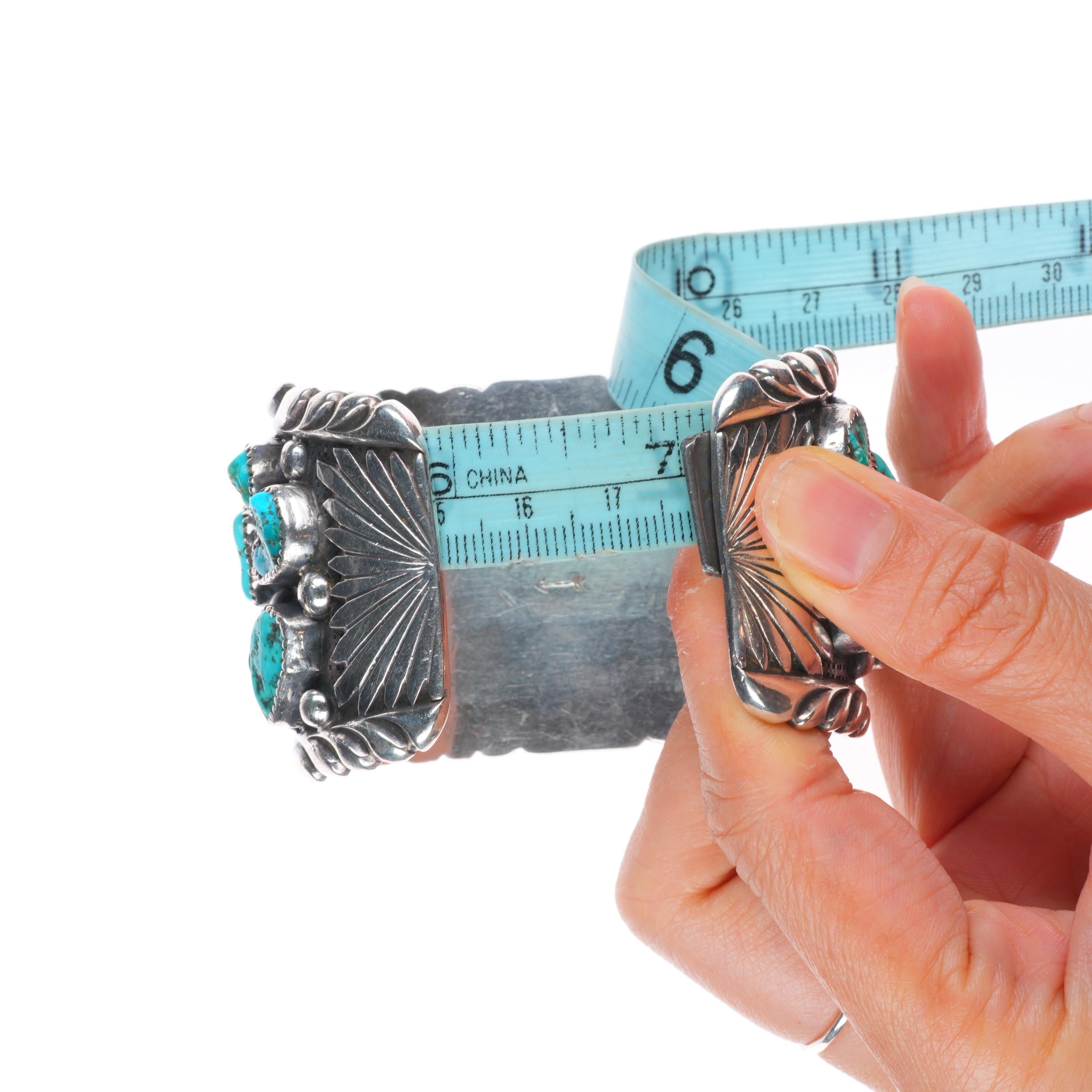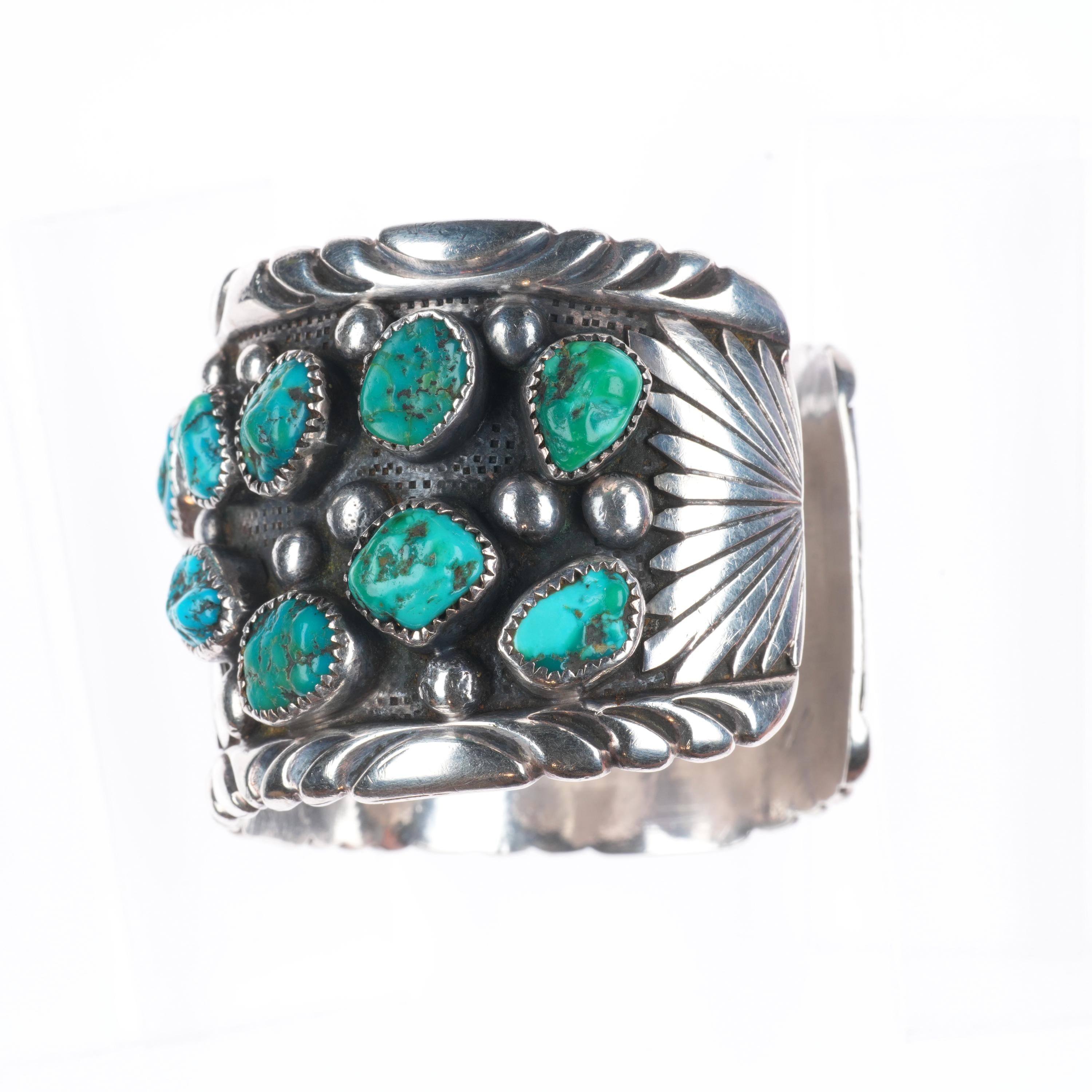 7" Heavy vintage Navajo Ernest Largo sterling silver turquoise cuff bracelet. Tested and guaranteed solid sterling silver with weight and measurements in pictures. Circa third quarter of the 20th century with some expected age appropriate wear.