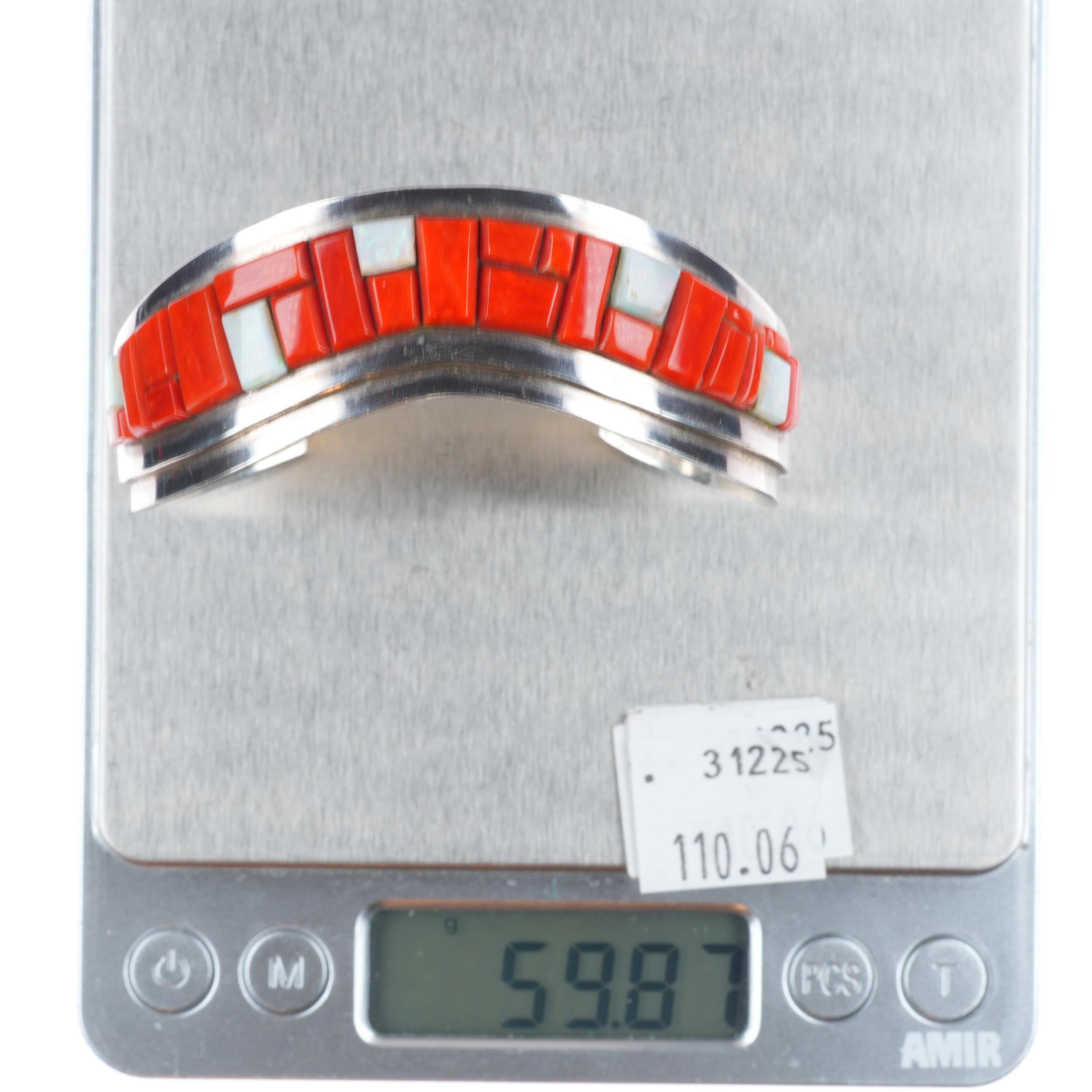 7" Norton Becenti Navajo sterling silver red coral/opal corn row cuff bracelet