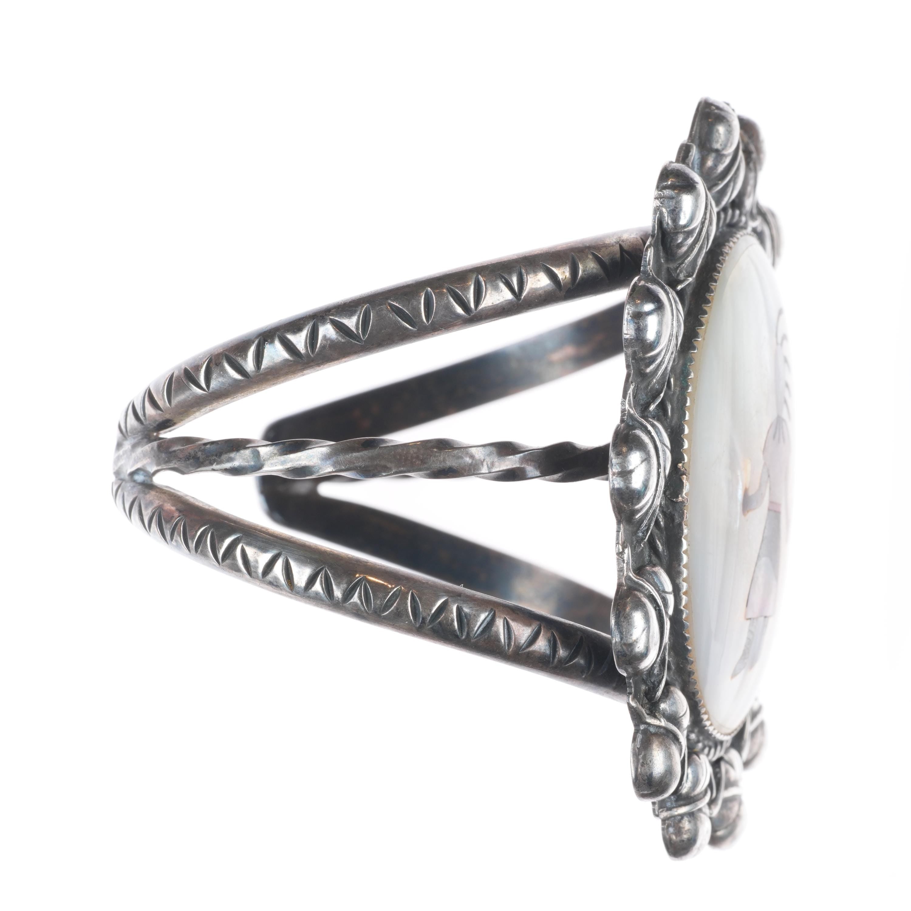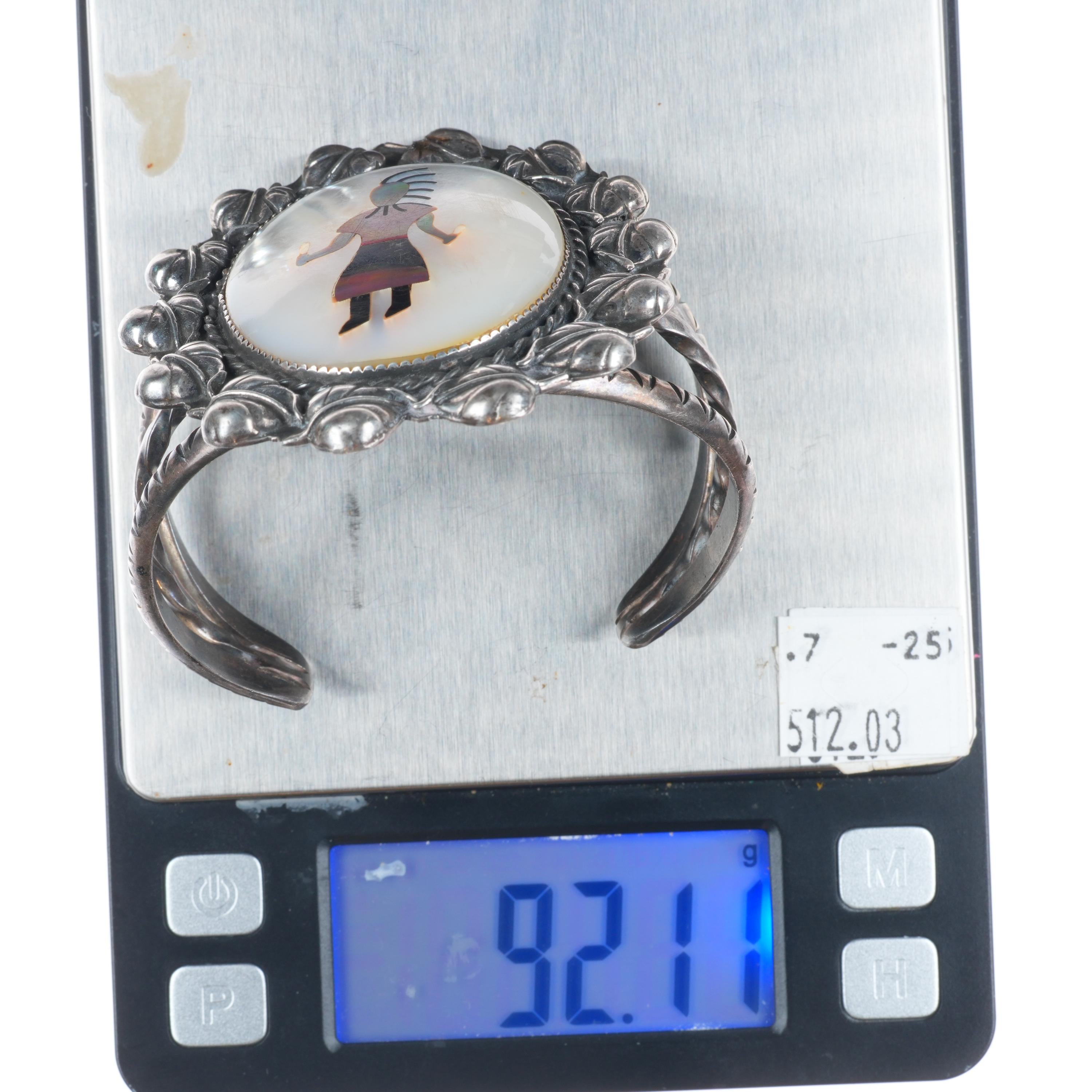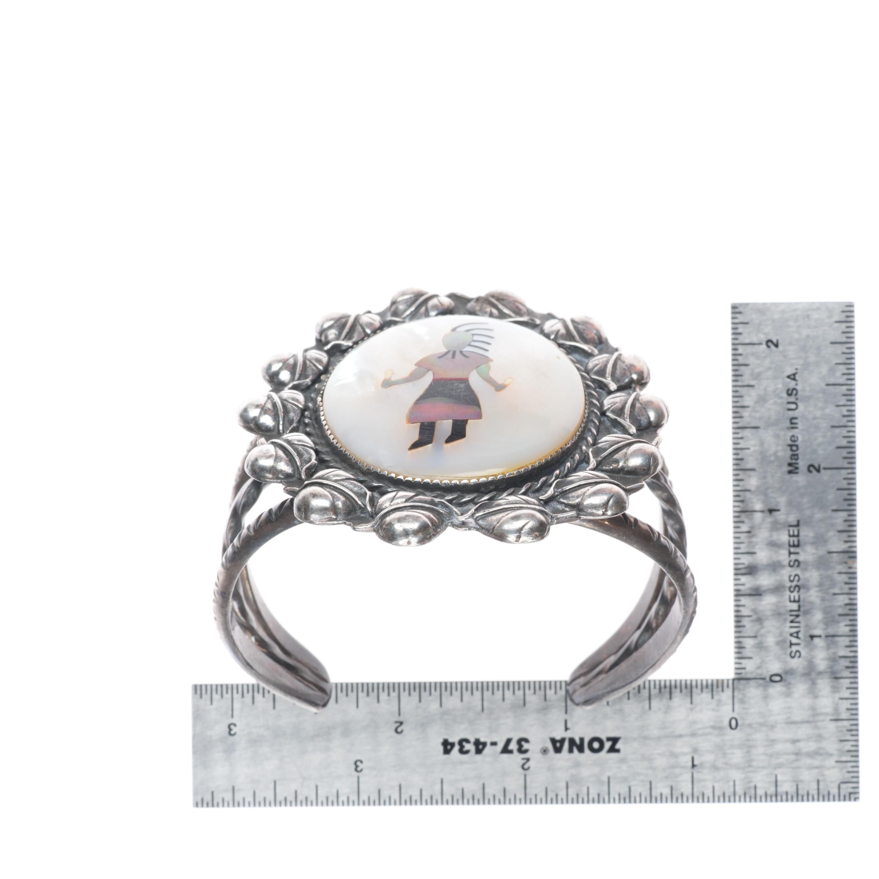 7" Vintage JF Zuni sterling silver shell inlay Kachina Dancer cuff bracelet Tested and guaranteed solid sterling silver with weight and measurements in pictures. Circa second quarter of the 20th century with some expected age appropriate wear. High quality silverwork and inlay. Much nicer than most similar type bracelets.