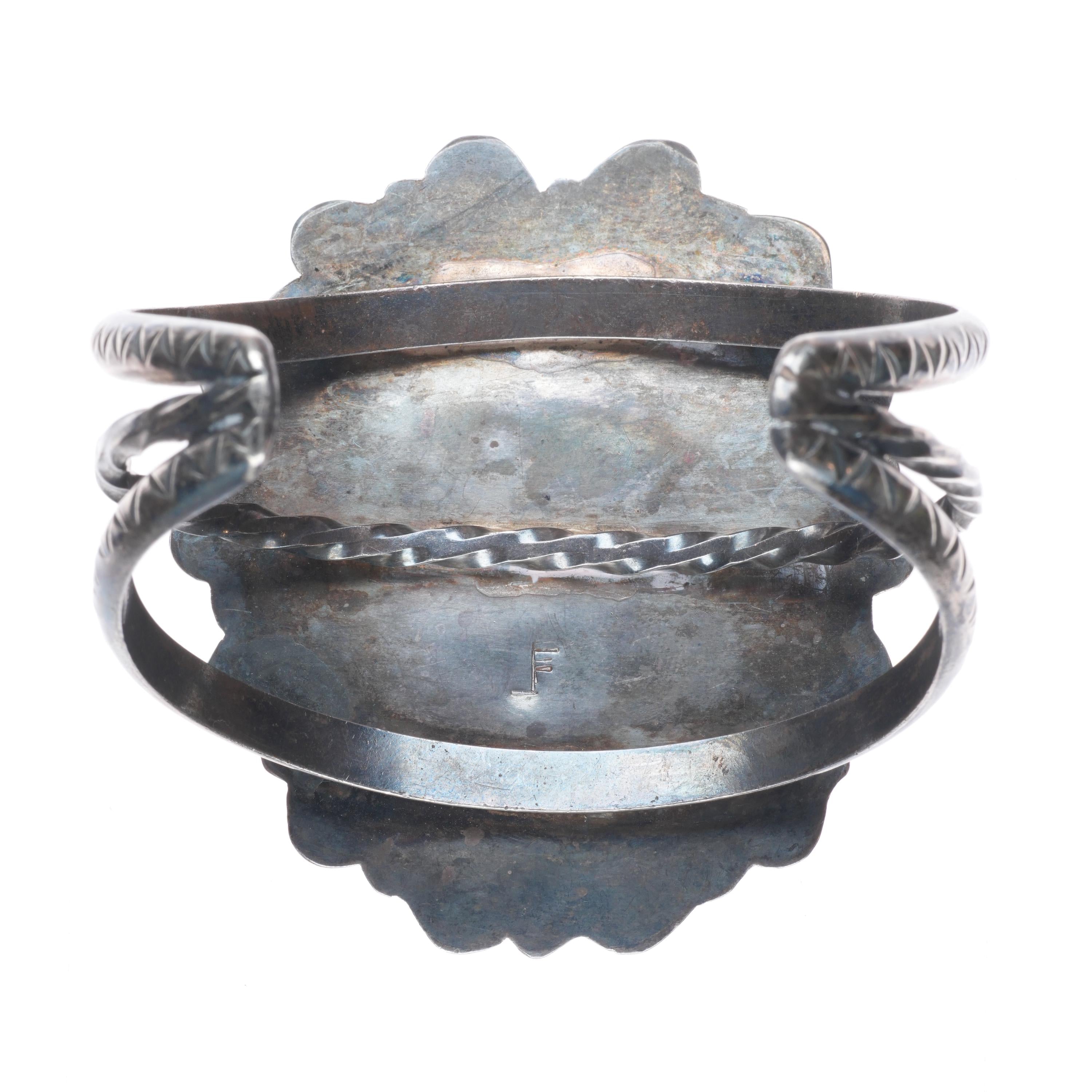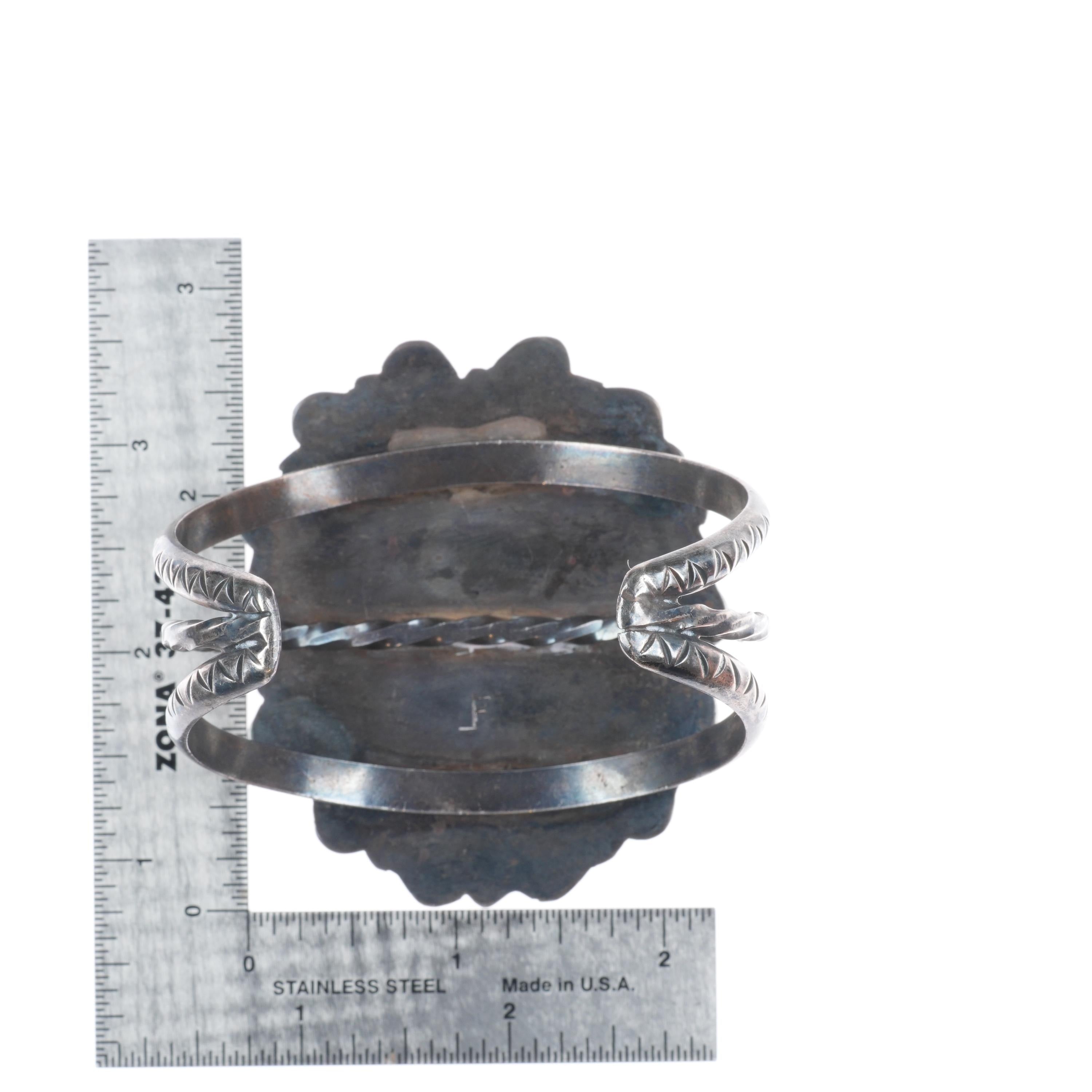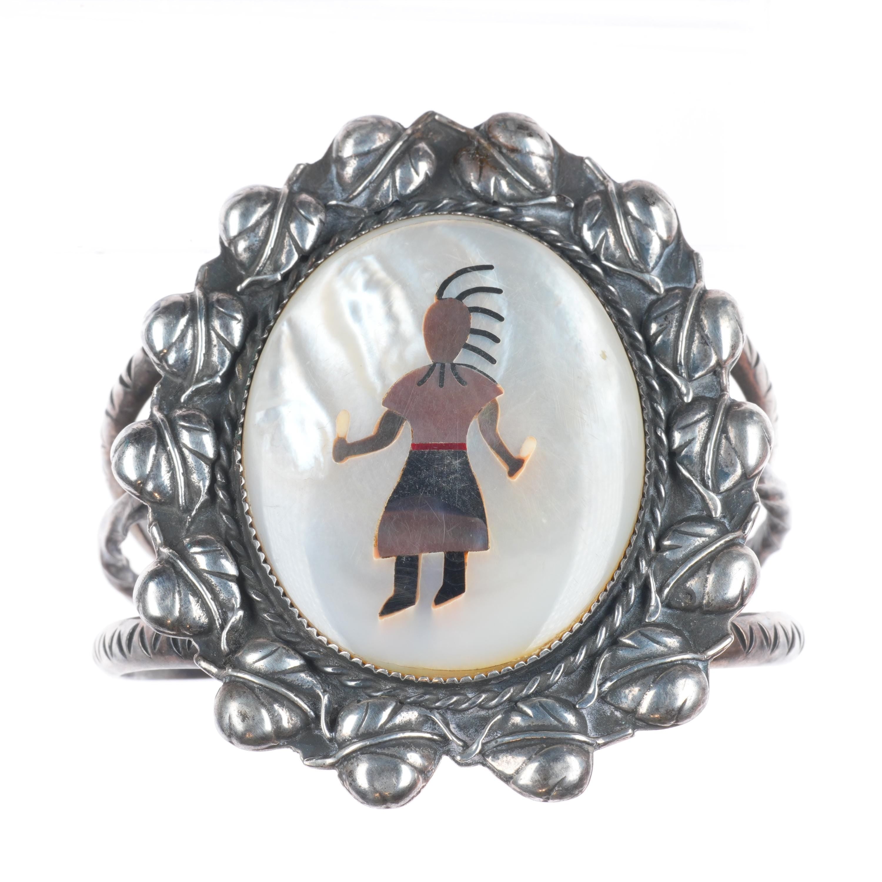 7" Vintage JF Zuni sterling silver shell inlay Kachina Dancer cuff bracelet Tested and guaranteed solid sterling silver with weight and measurements in pictures. Circa second quarter of the 20th century with some expected age appropriate wear. High quality silverwork and inlay. Much nicer than most similar type bracelets.