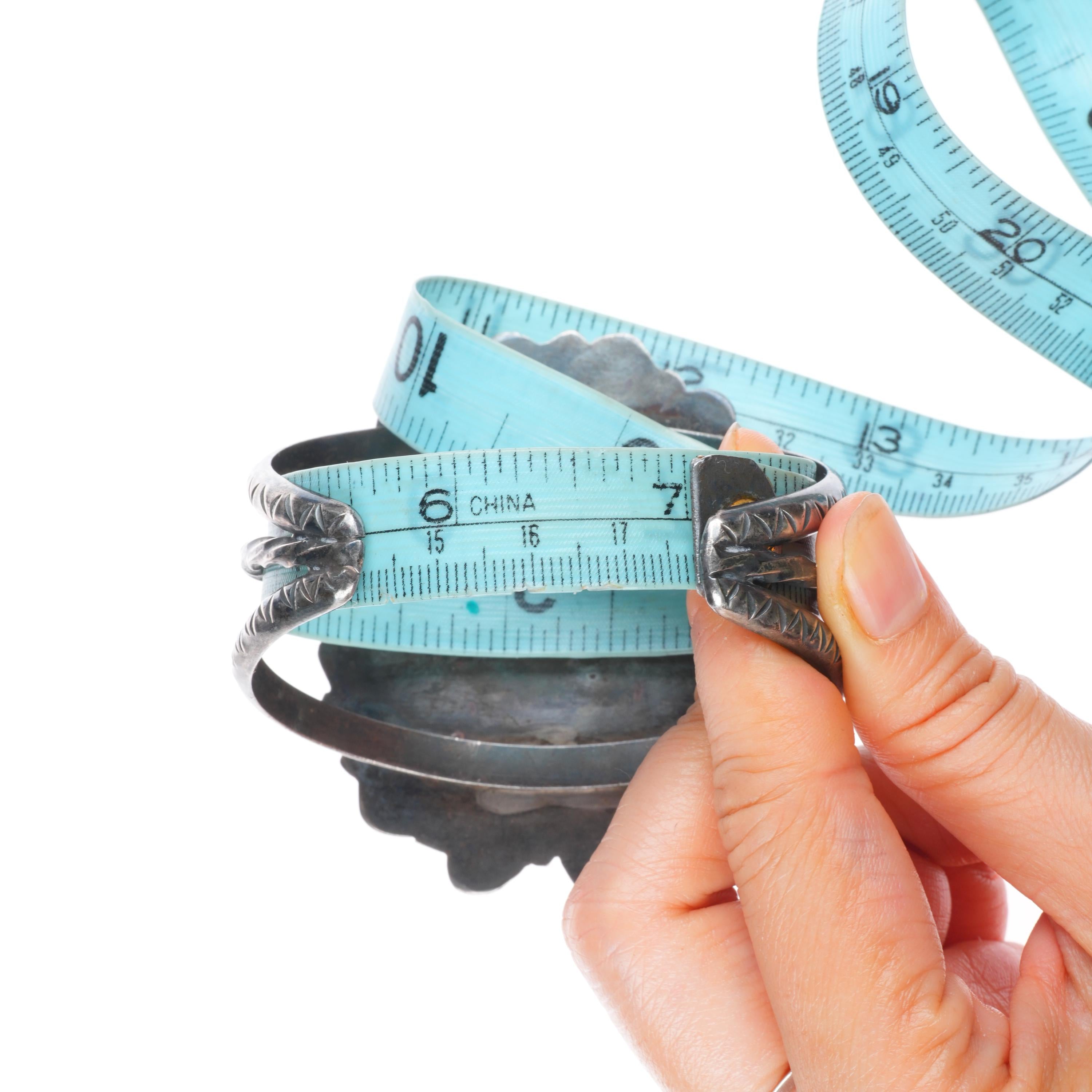 Bracelets are shown in the photos with a tape measure inside the bracelet, other photos will typically show the gap size. The size at the beginning of the title includes the gap. Almost all bracelets that don‘t have inlay work should be adjustable by at least .25", please refer to pictures for the gap size to see if it would work if slightly adjusted as the gap would change.
