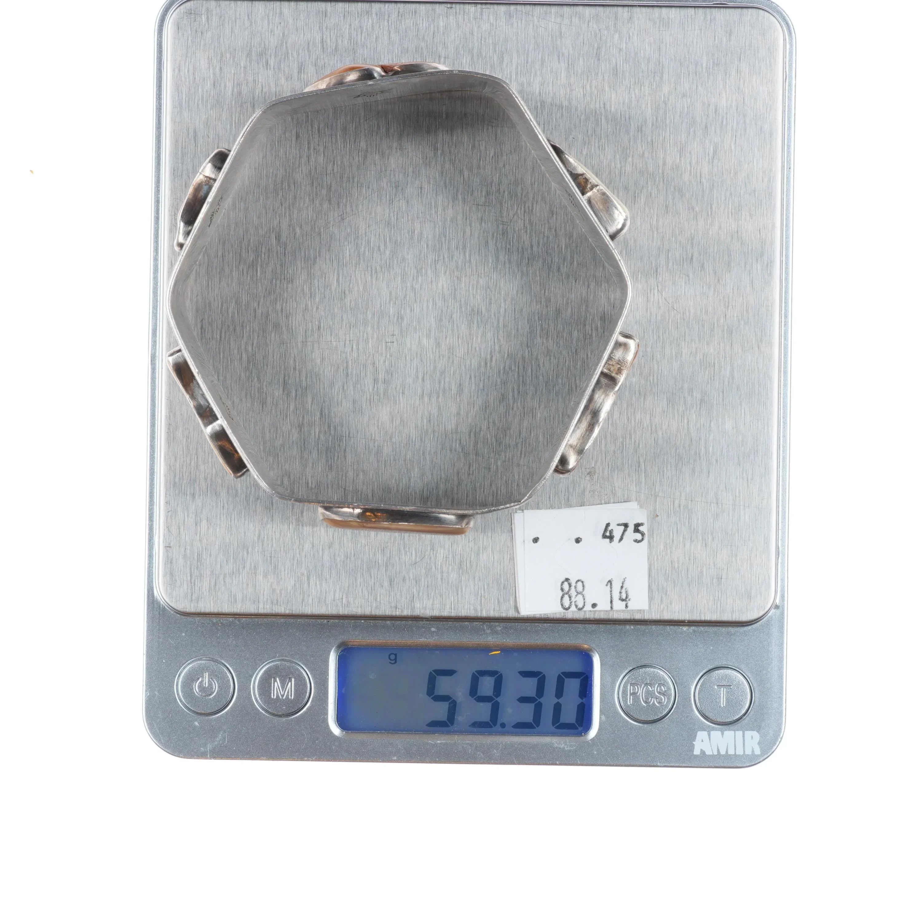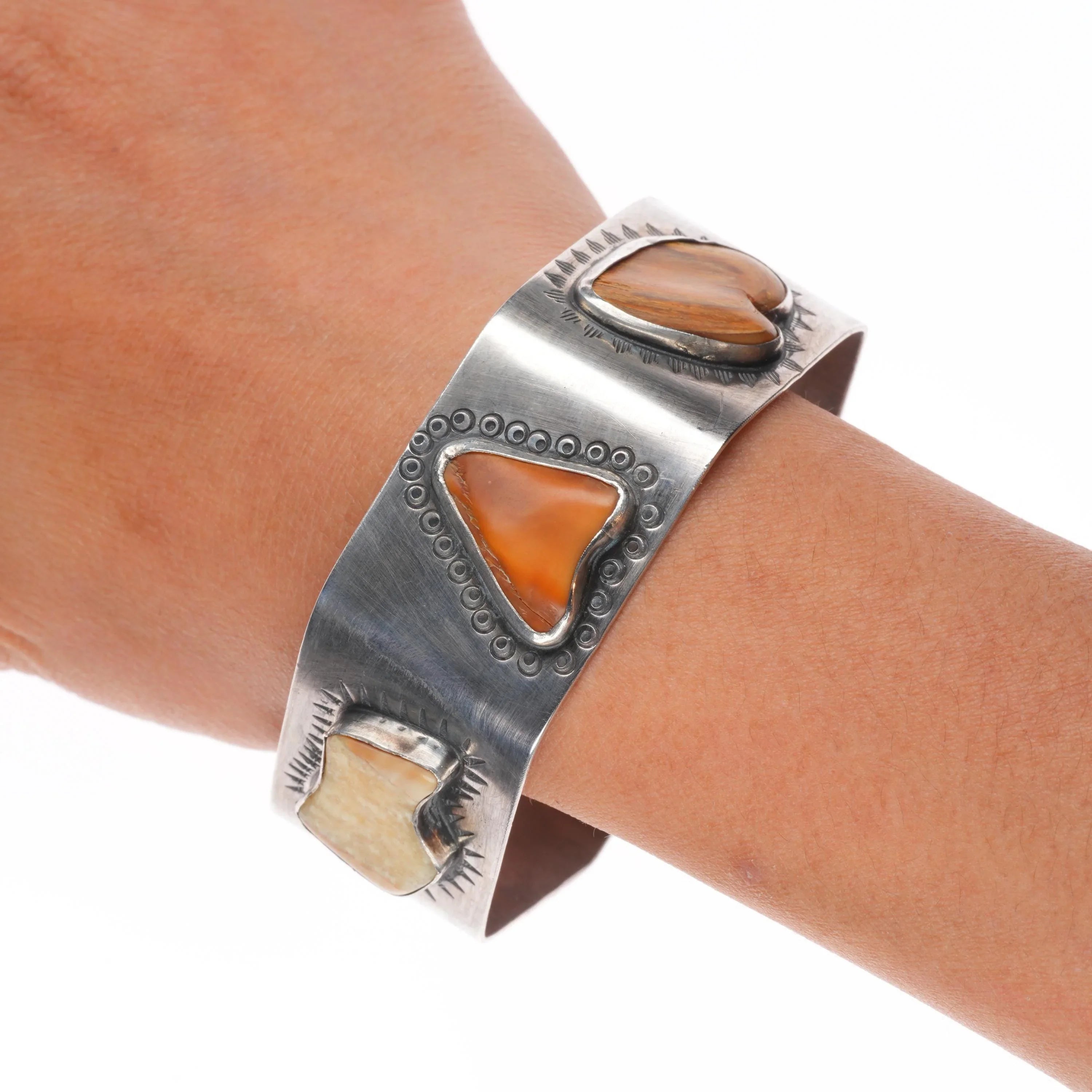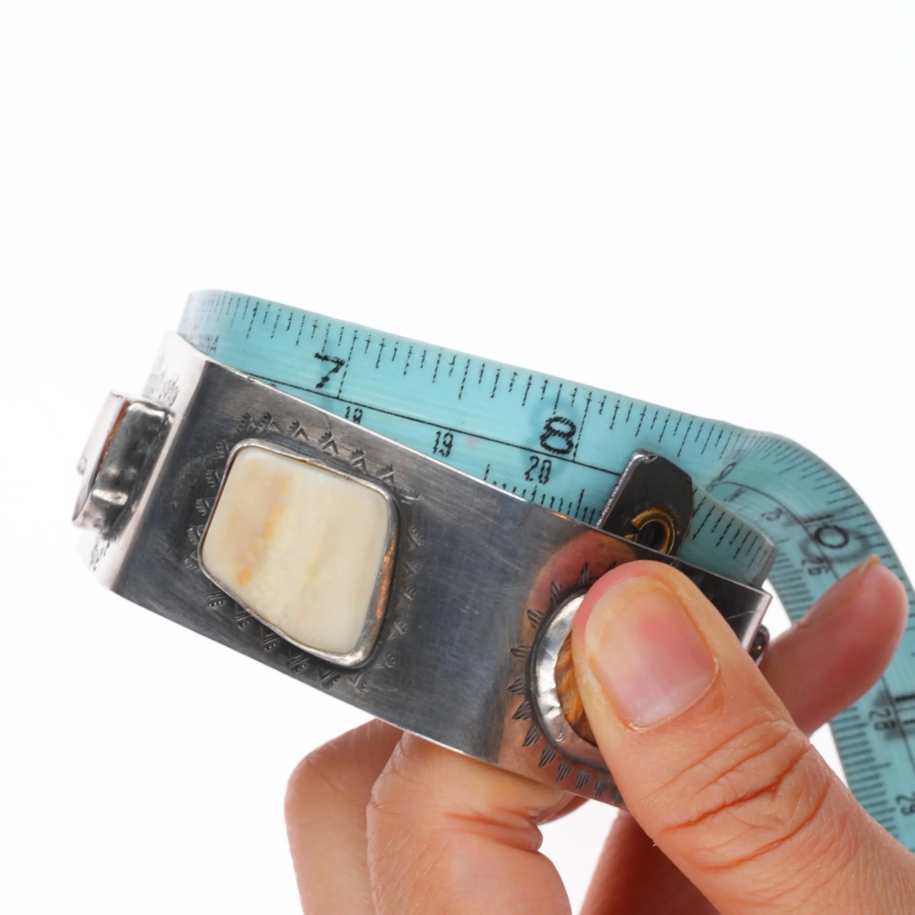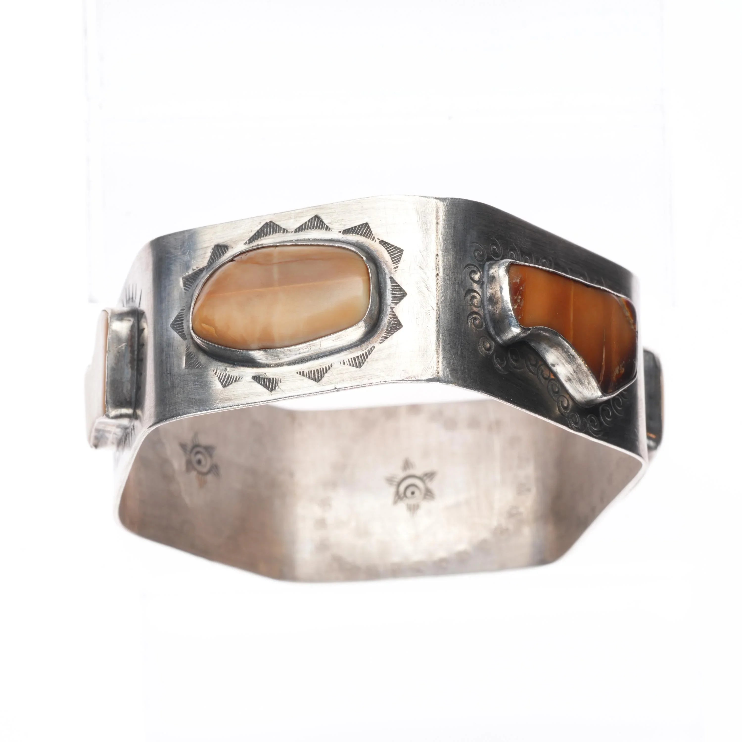8" TH Southwestern sterling silver fossil/petrified bone/jasper bangle bracelet. Tested and guaranteed solid sterling silver with weight and measurements in pictures. Good condition, circa last quarter of the 20th century.