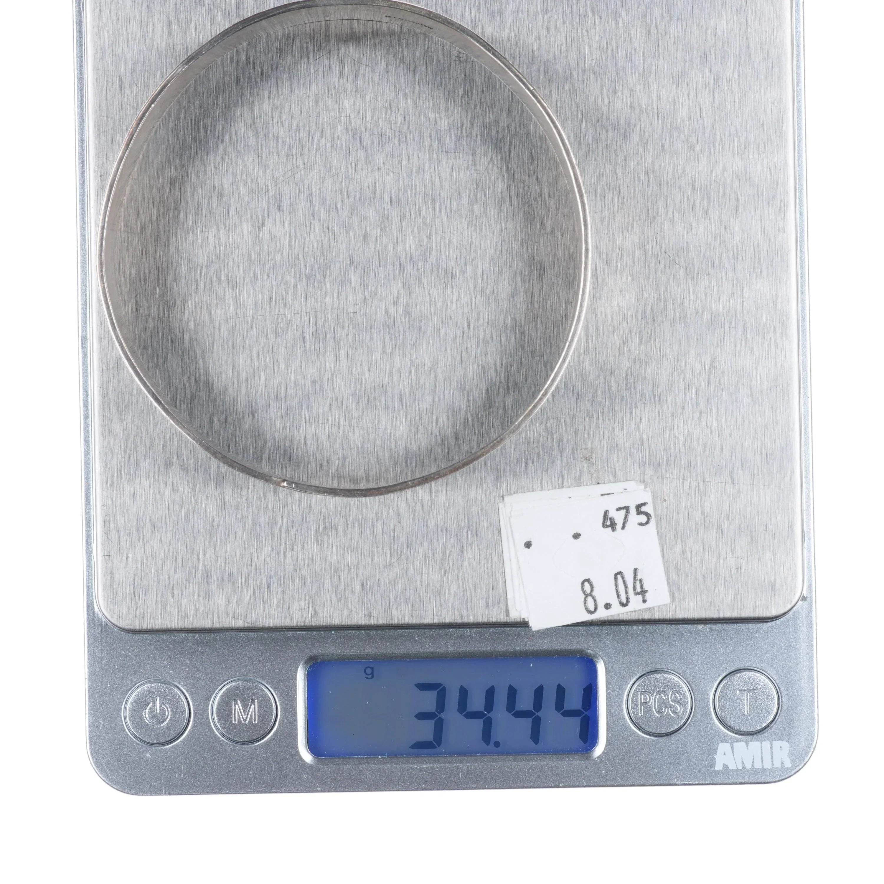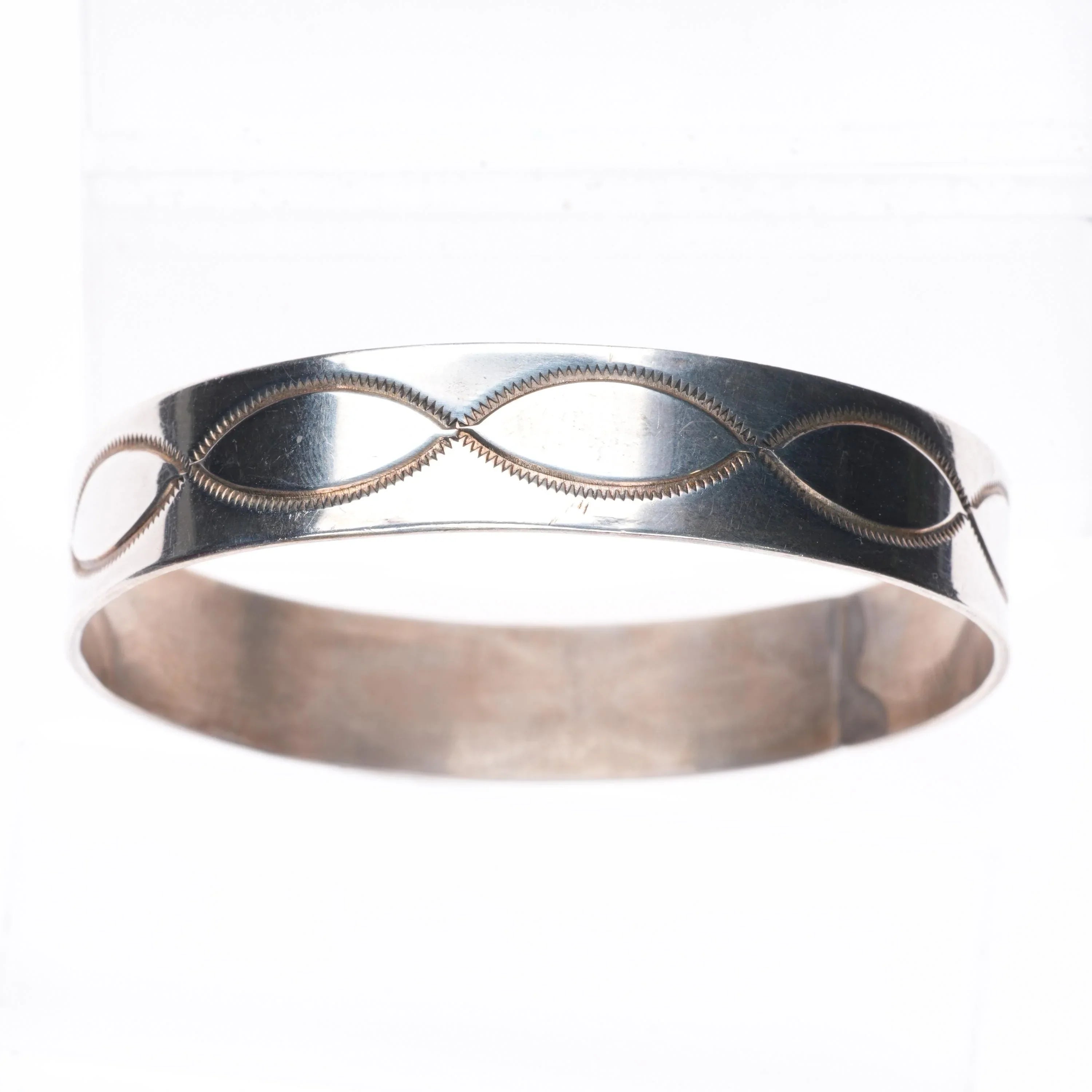 8" Vintage Navajo hand stamped sterling silver wide band bangle bracelet. Tested and guaranteed solid sterling silver with weight and measurements in pictures. Good condition, circa third quarter of the 20th century.