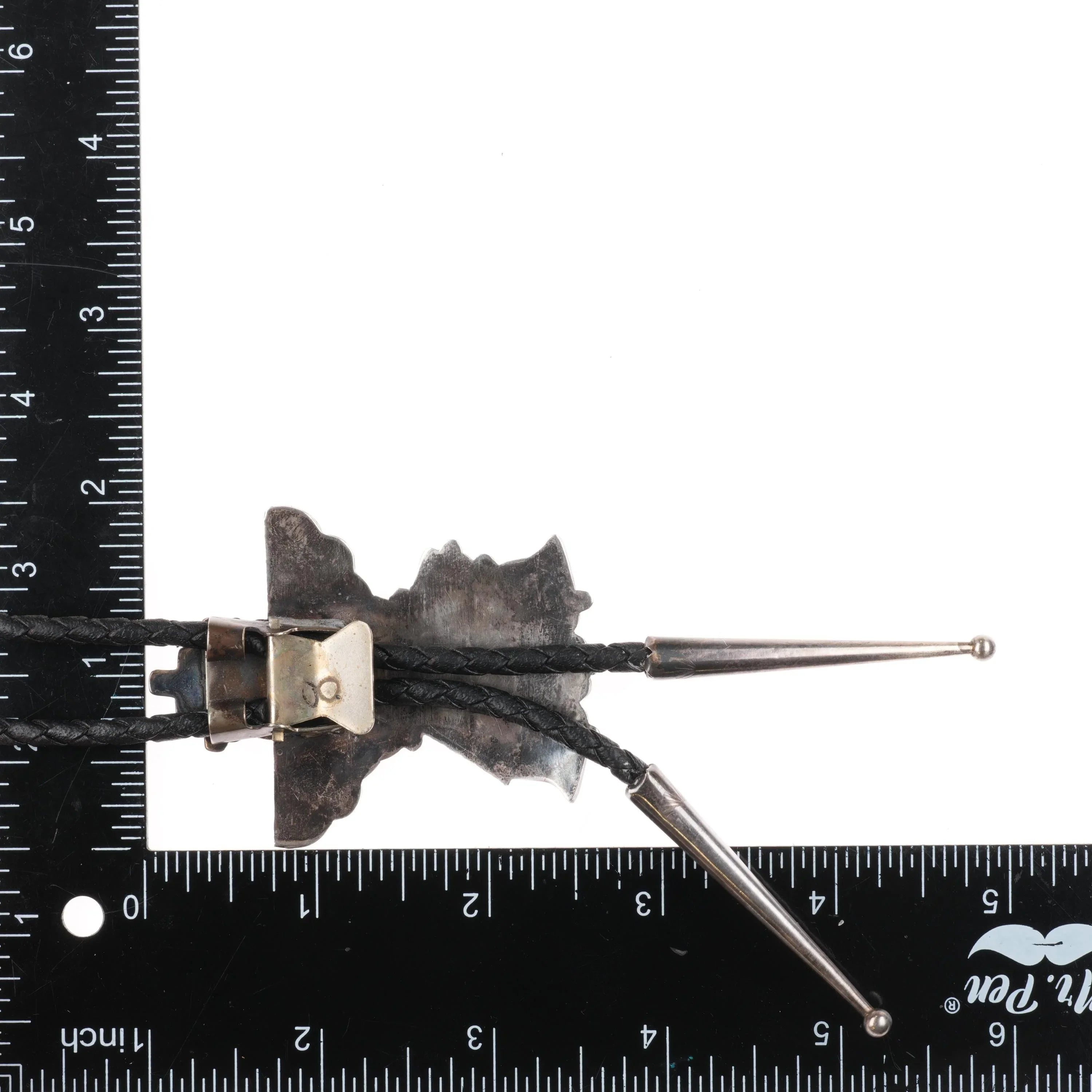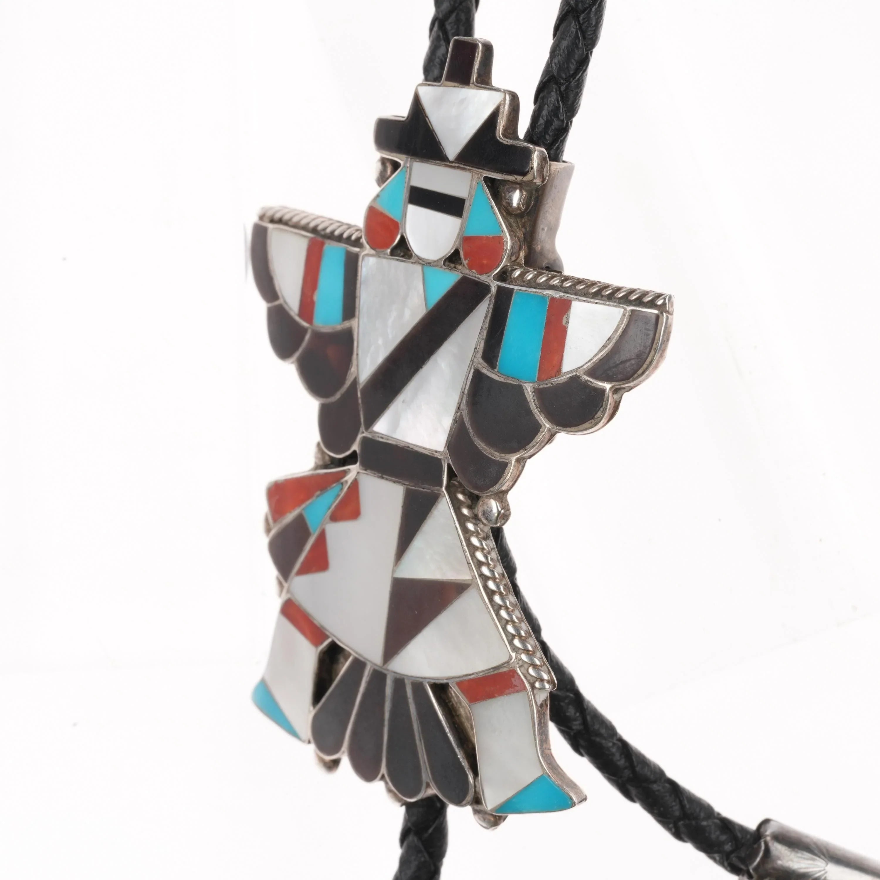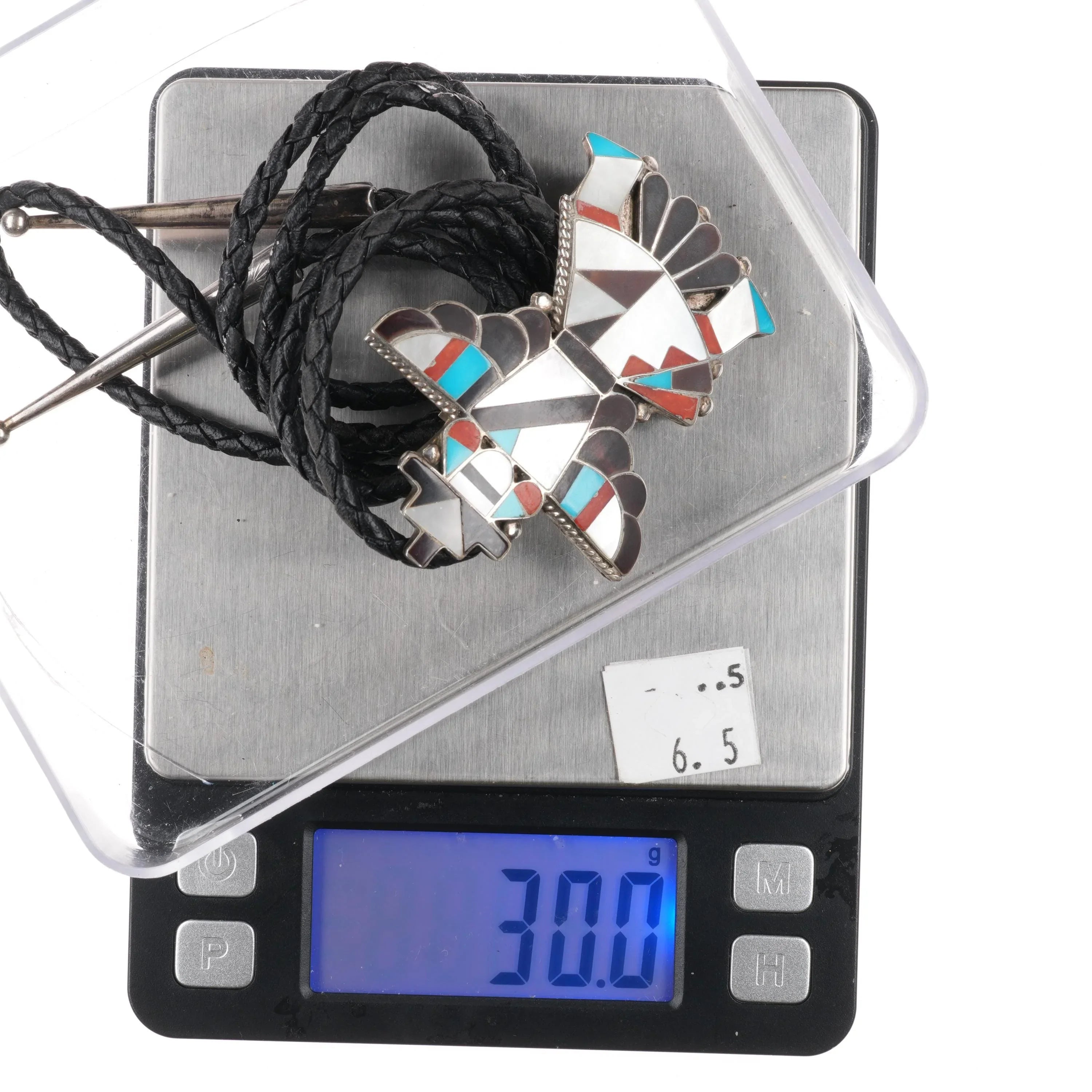 Anna Tekala Zuni sterling silver inlaid knifewing bolo tie turquoise/coral/shell