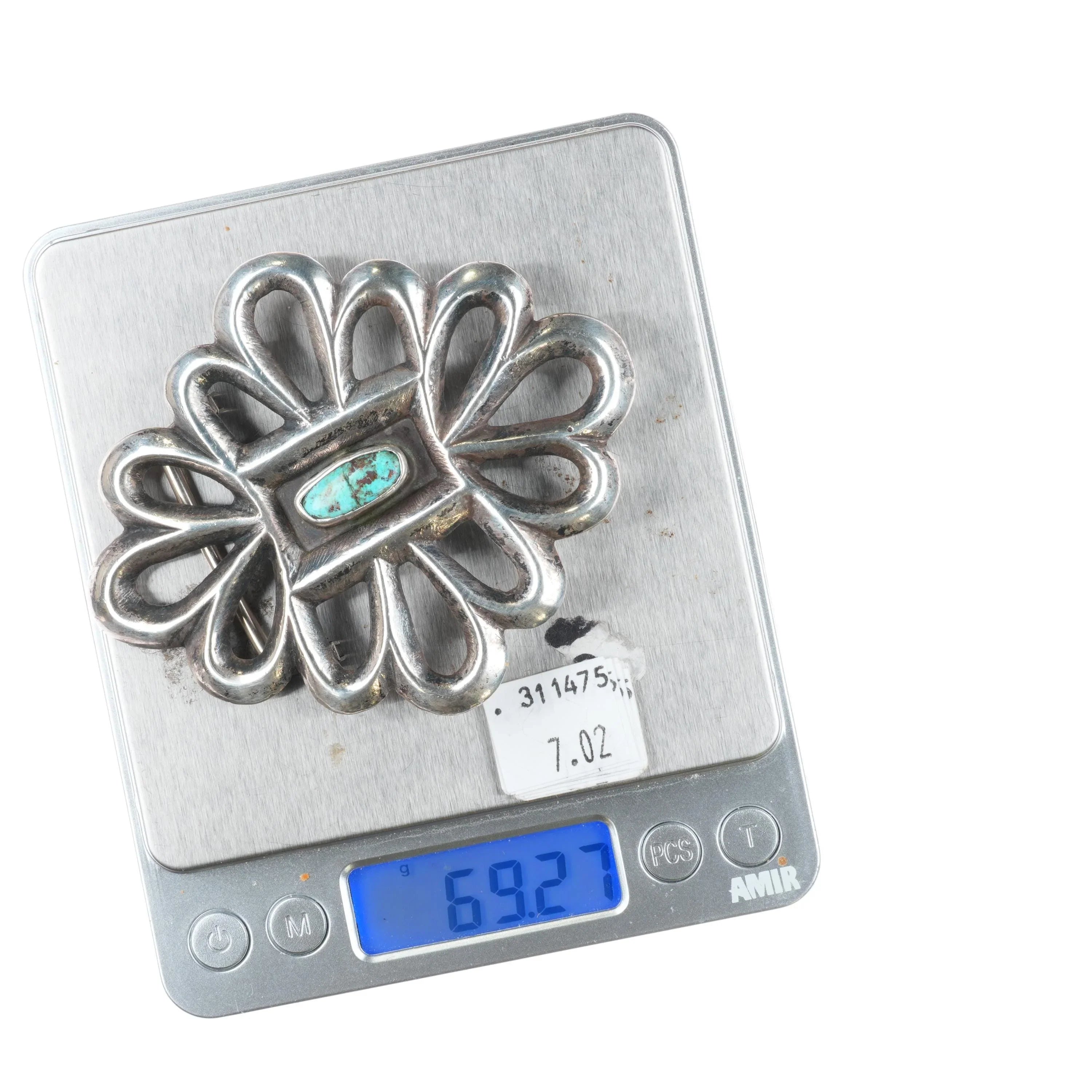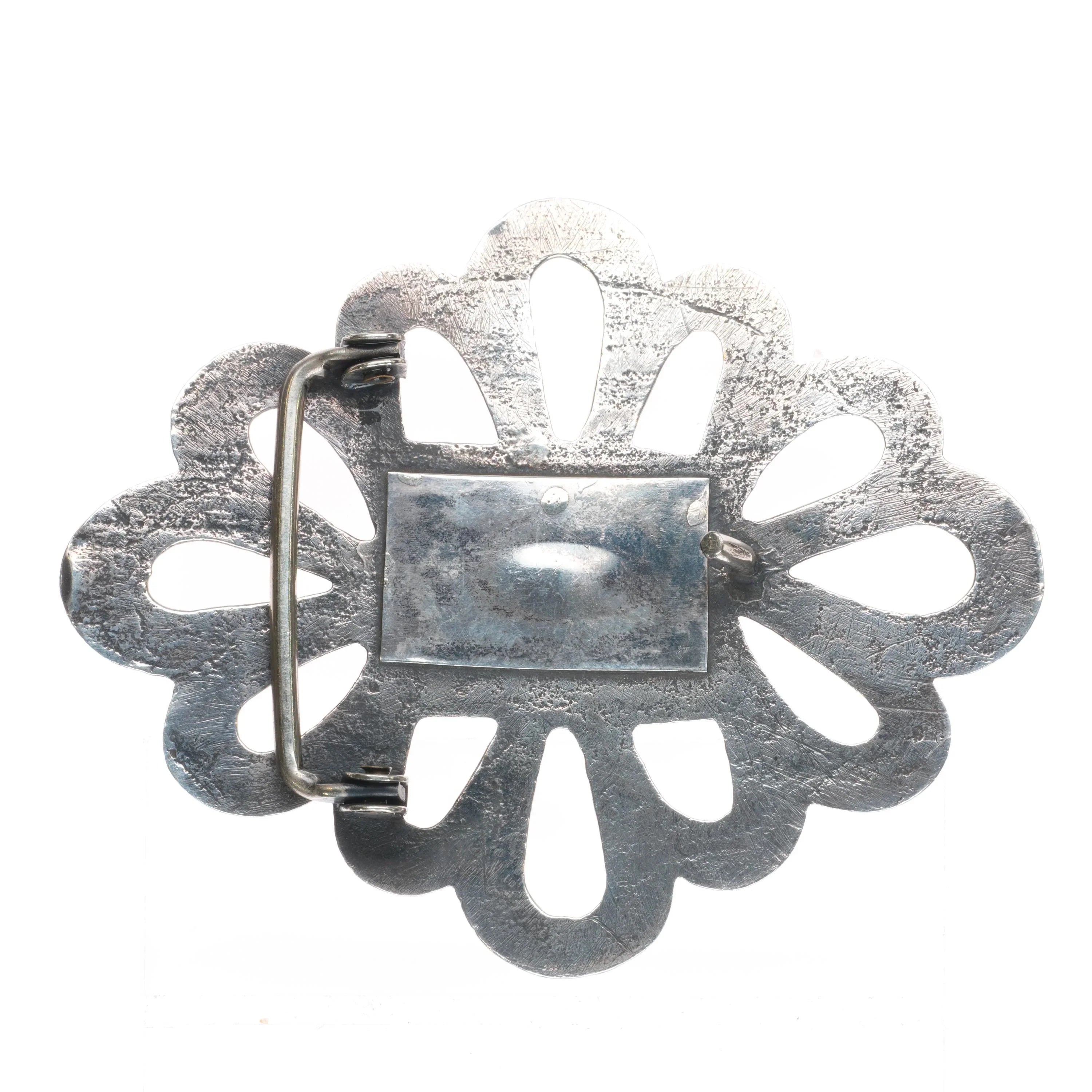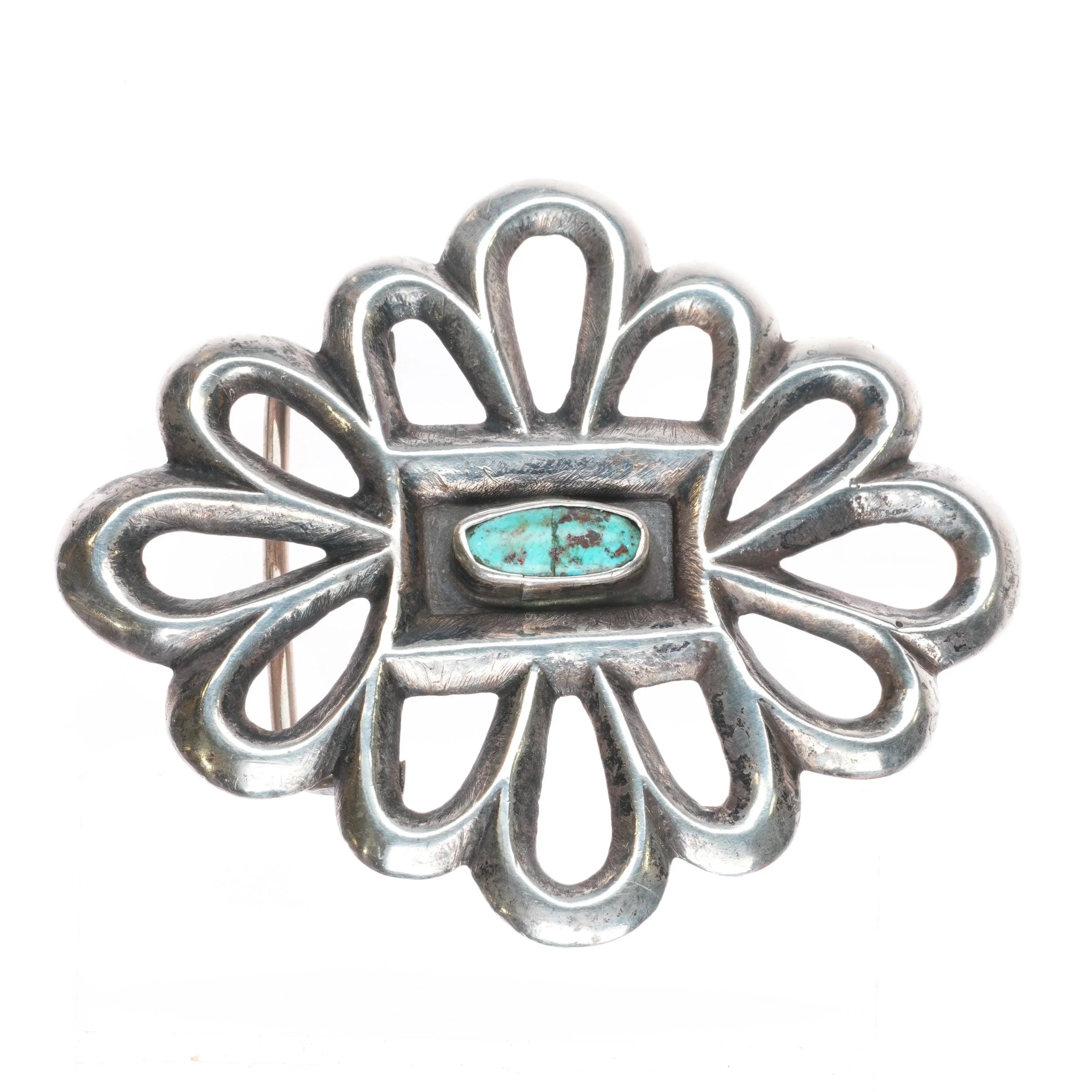 Big Vintage Navajo sandcast sterling silver belt buckle with center turquoise