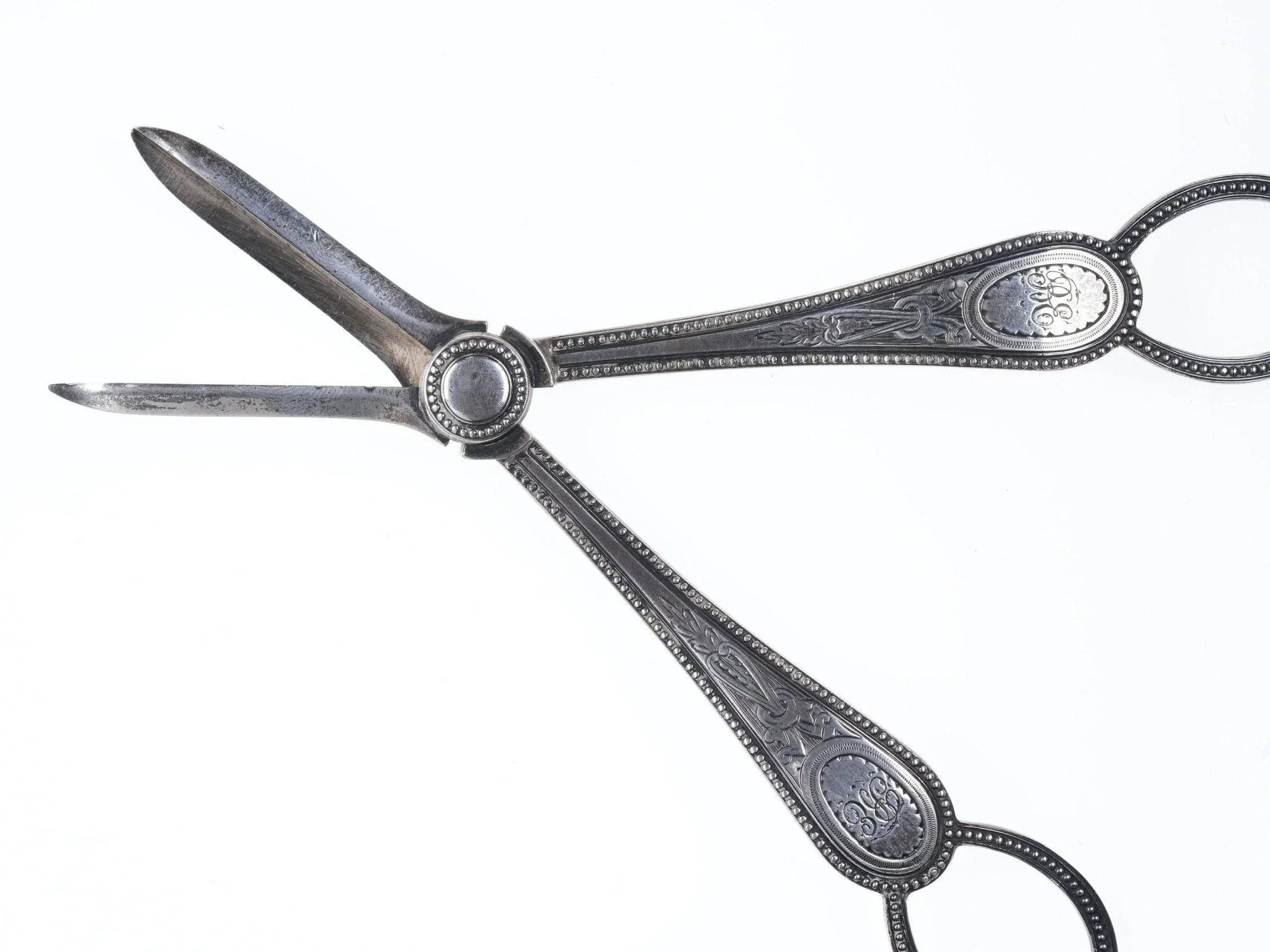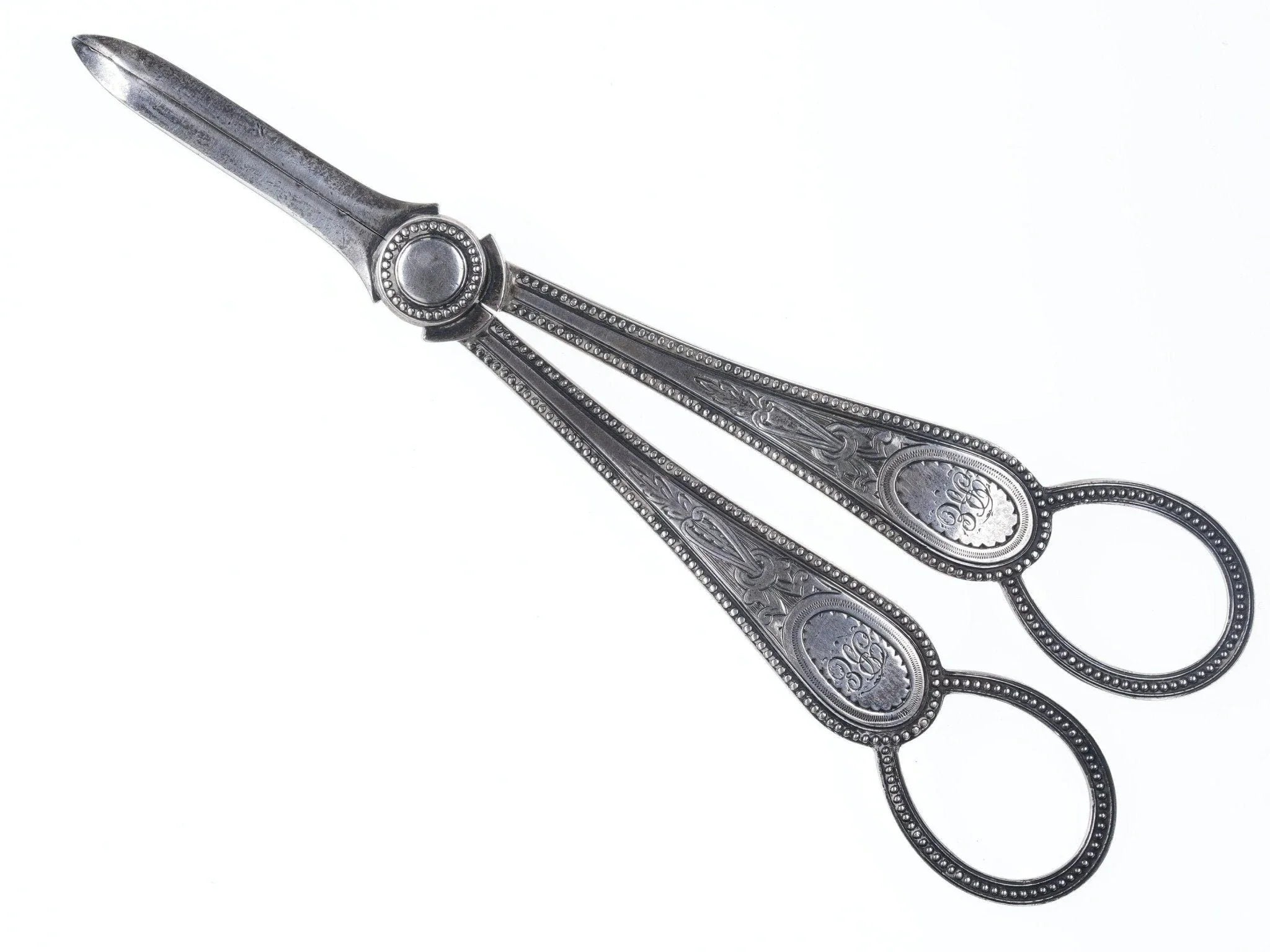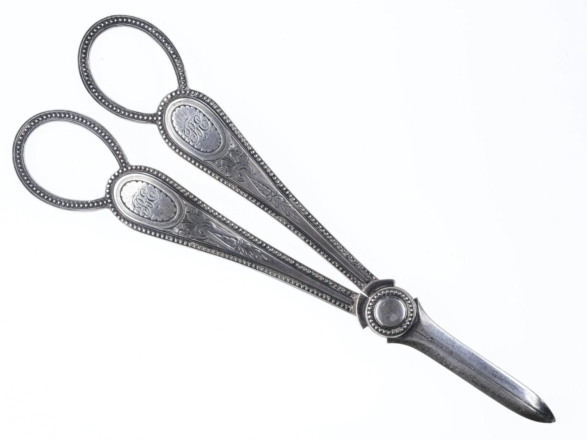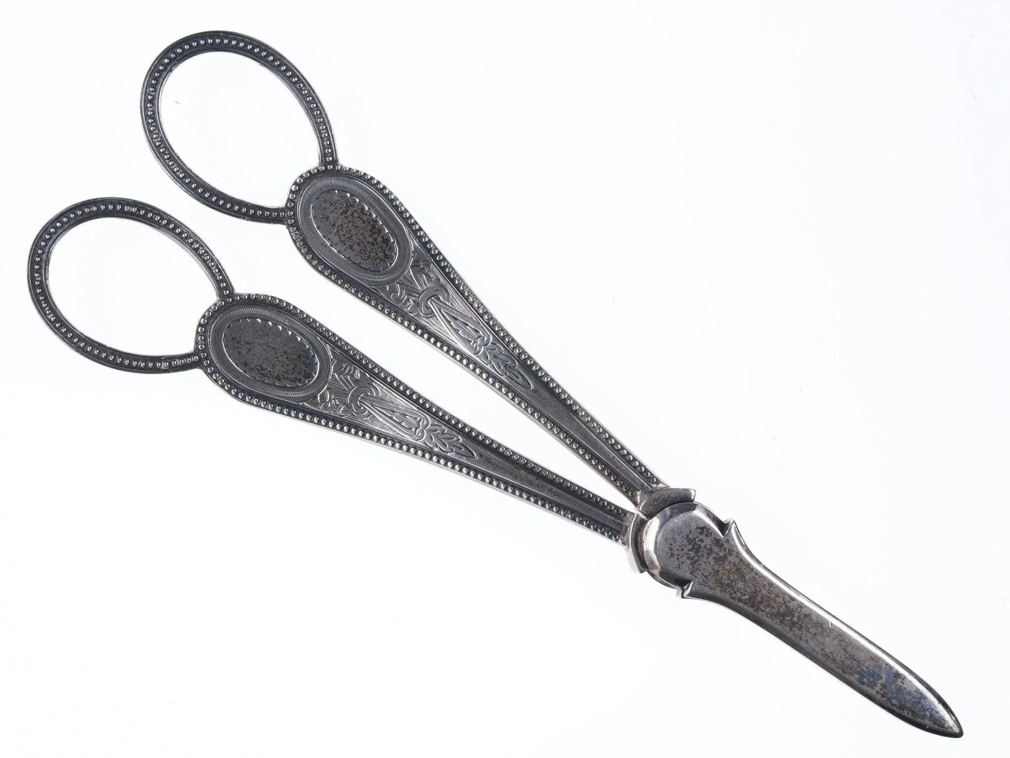 cluster of grapes. Most of the scissor ends of these pieces of antique silver