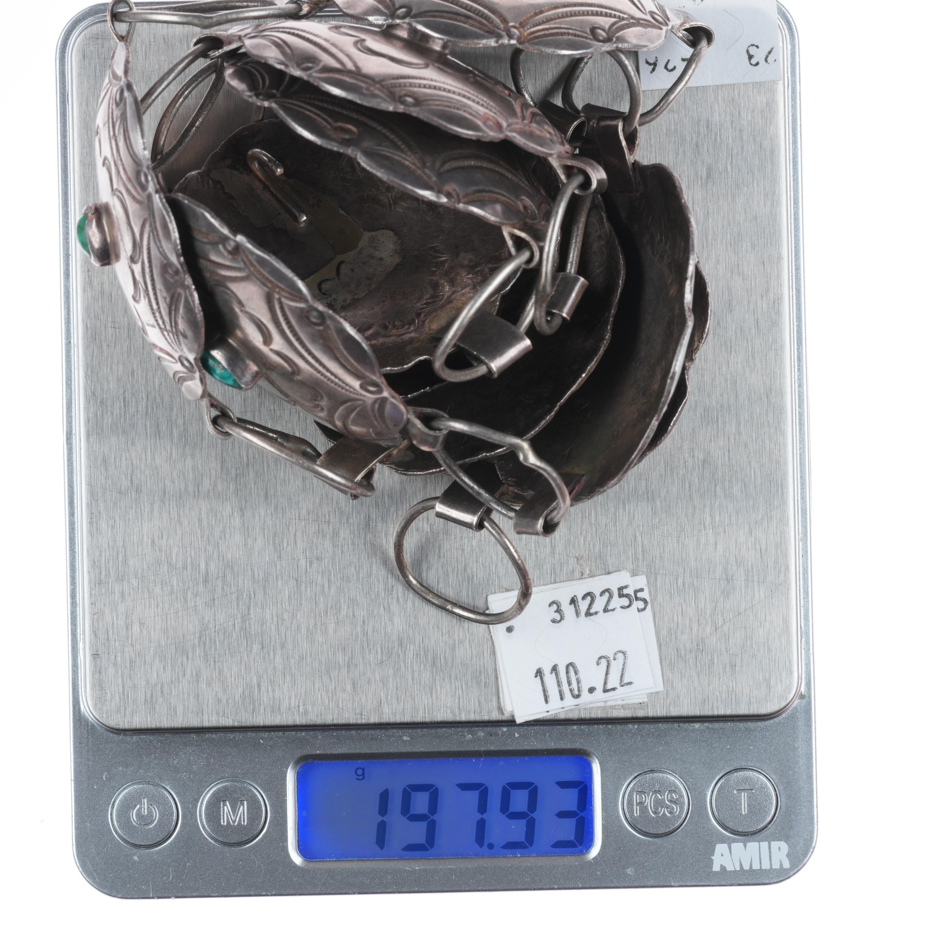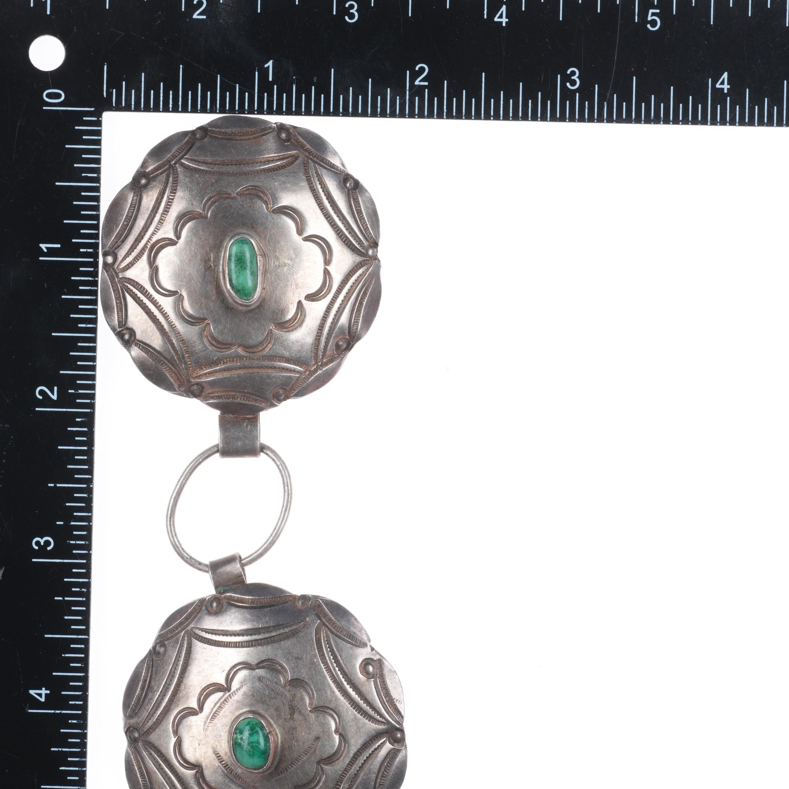 c1940 Large/Heavy Navajo hand stamped sterling silver link concho belt turquoise. Tape measure shown in pics.. Will fit up to a 30" waist or hat, large conchos. Could be hooked anywhere lower. Weight and measurements in pictures. No damage or issues, tested and guaranteed solid sterling silver. Circa second quarter of the 20th century, no hallmarks.
