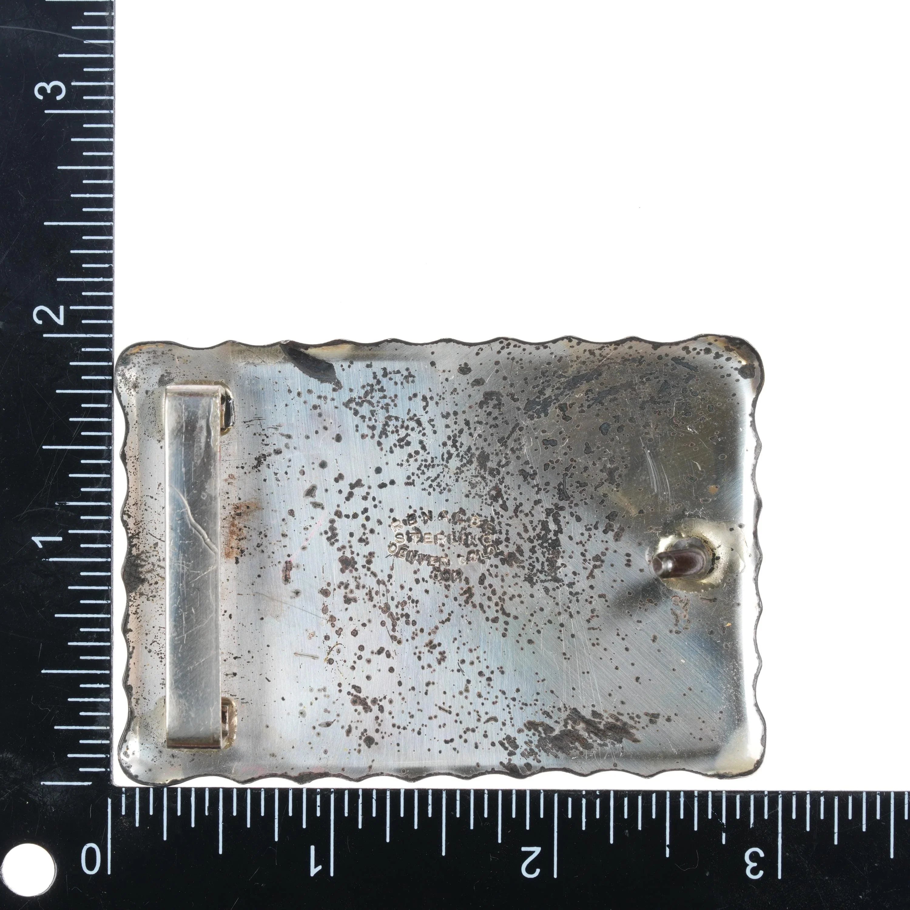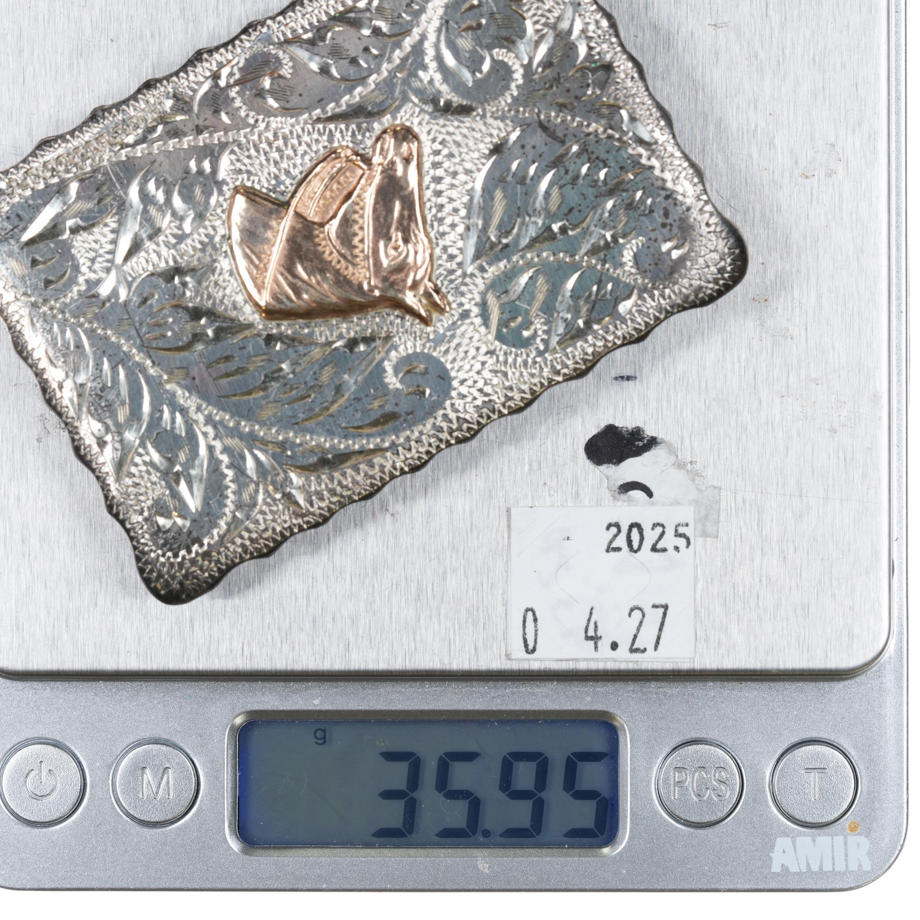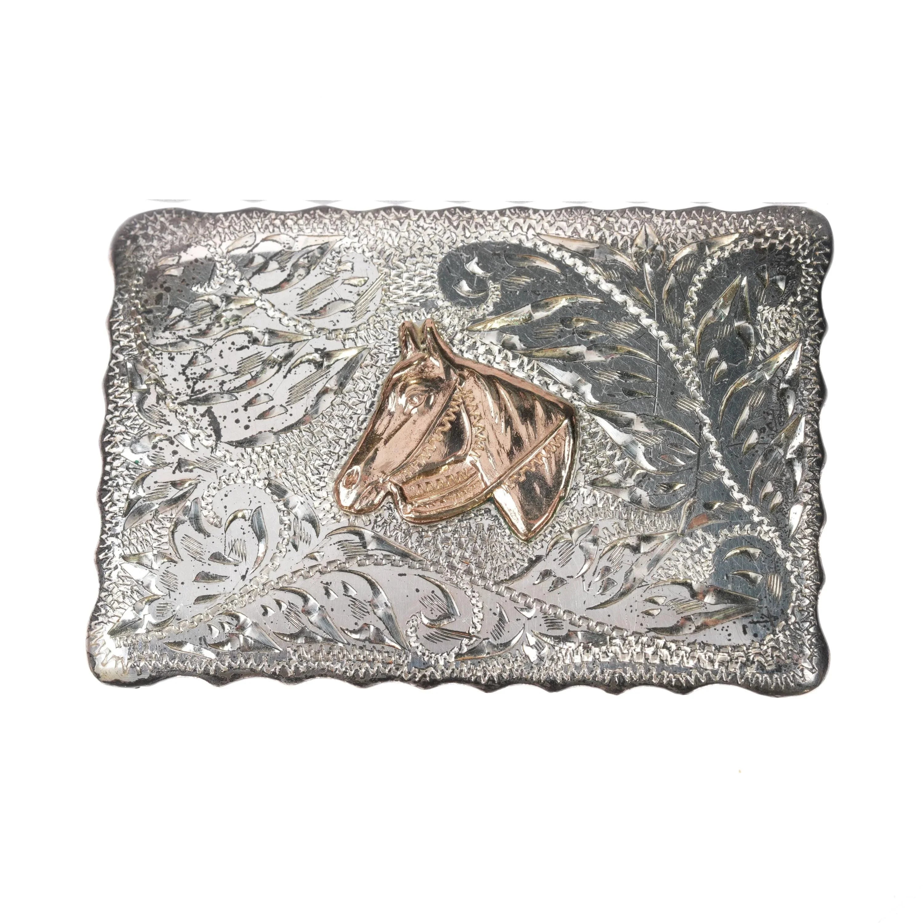 c1950 10k gold/Sterling silver Renalde hand engraved horse western belt buckle. Solid sterling silver with weight and measurements in pictures. Fits up to a 1.5" belt.