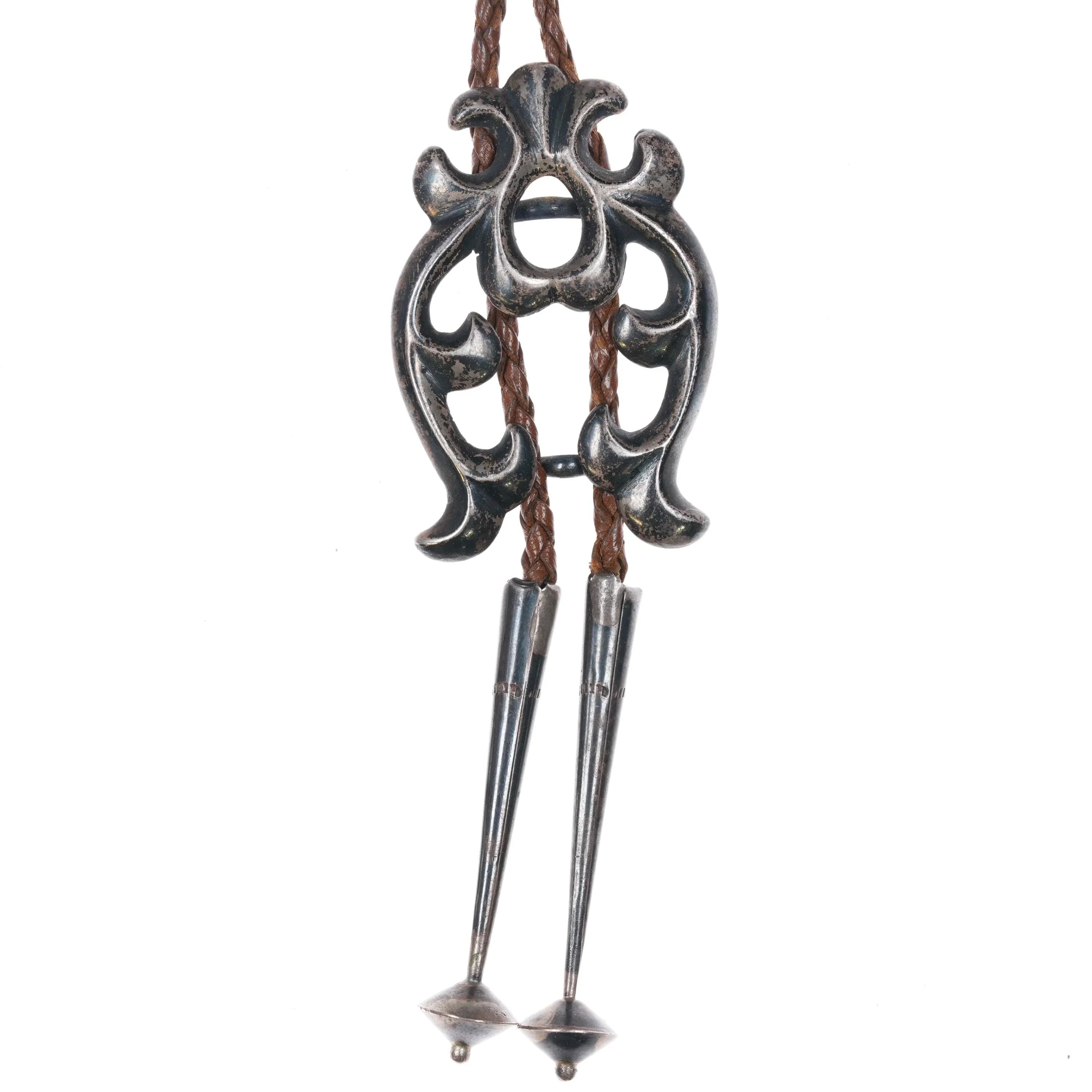 c1950 Navajo Fancy cast sterling silver bolo tie brown leather cord 42"