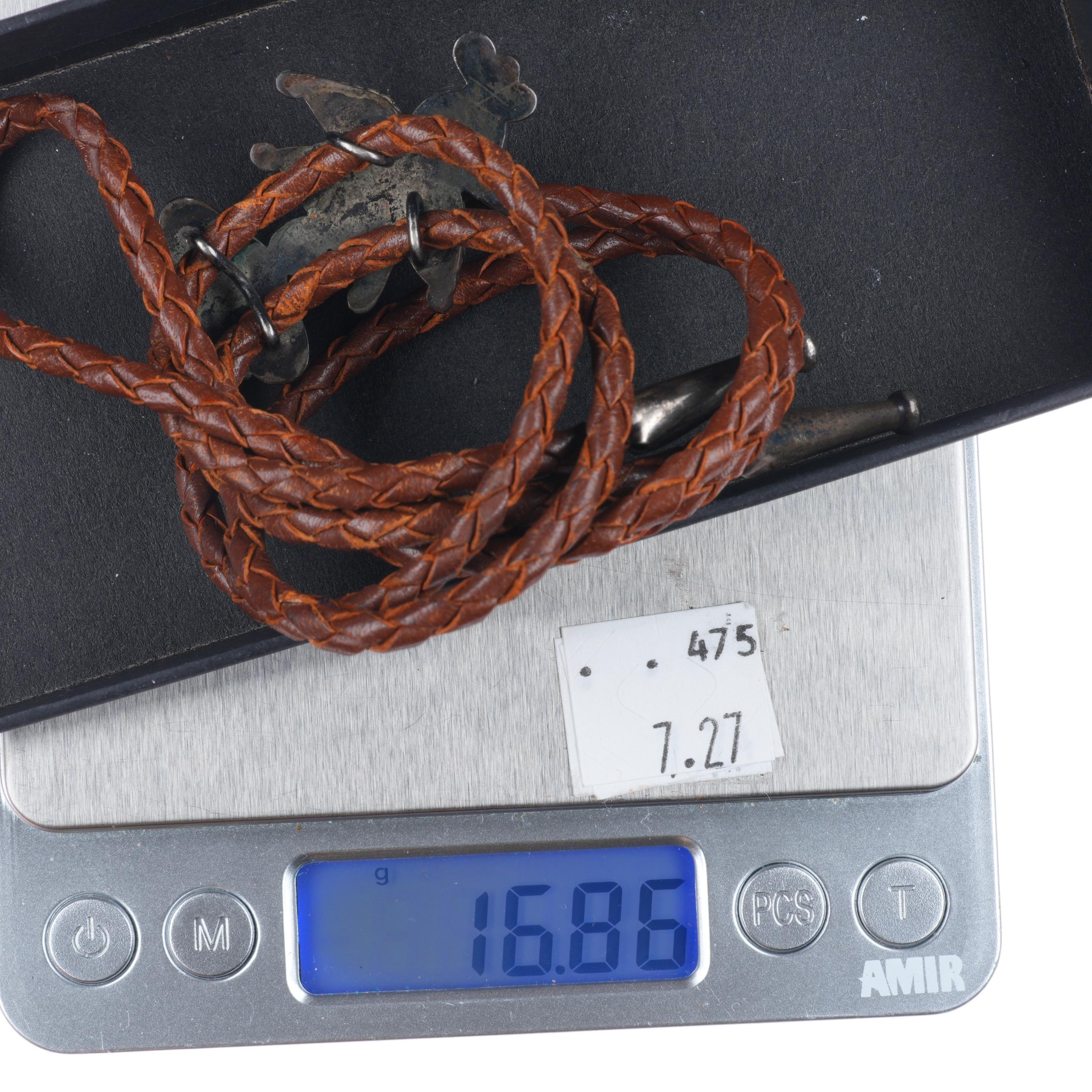c1950 Zuni sterling silver channel inlay thunderbird bolo tie. Tested and guaranteed solid sterling silver slide and tips. Weight and measurements in pictures. Great bolo, 36" long with no issues. Tray is tared out, so weight shown is just the bolo of course. Unknown maker, apparently unmarked.