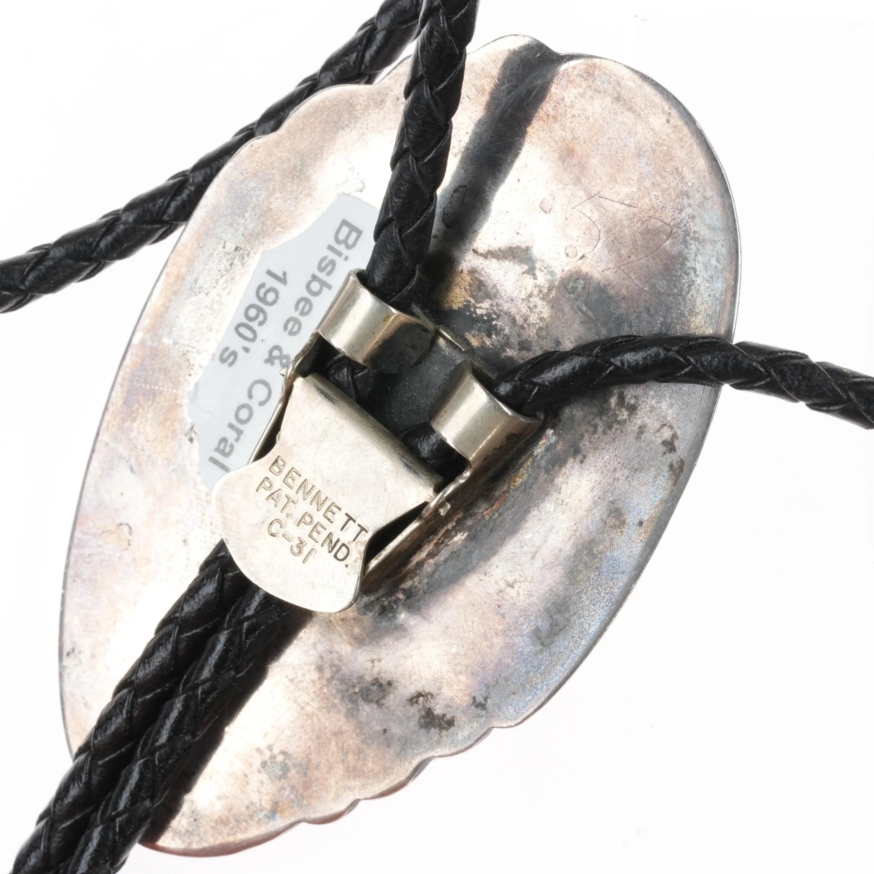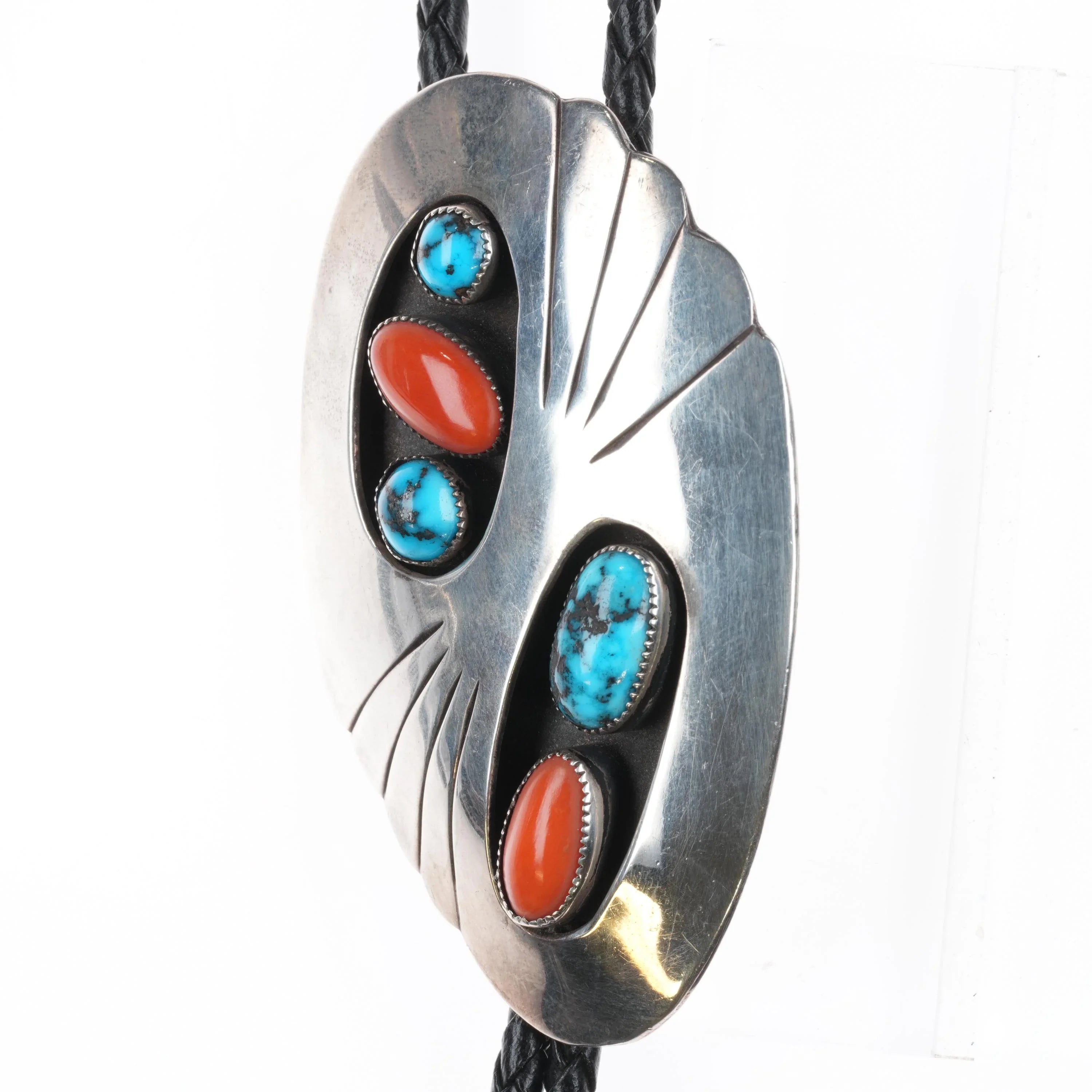 c1960 c-31 Bisbee turquoise/Mediterranean coral sterling silver Navajo bolo tie