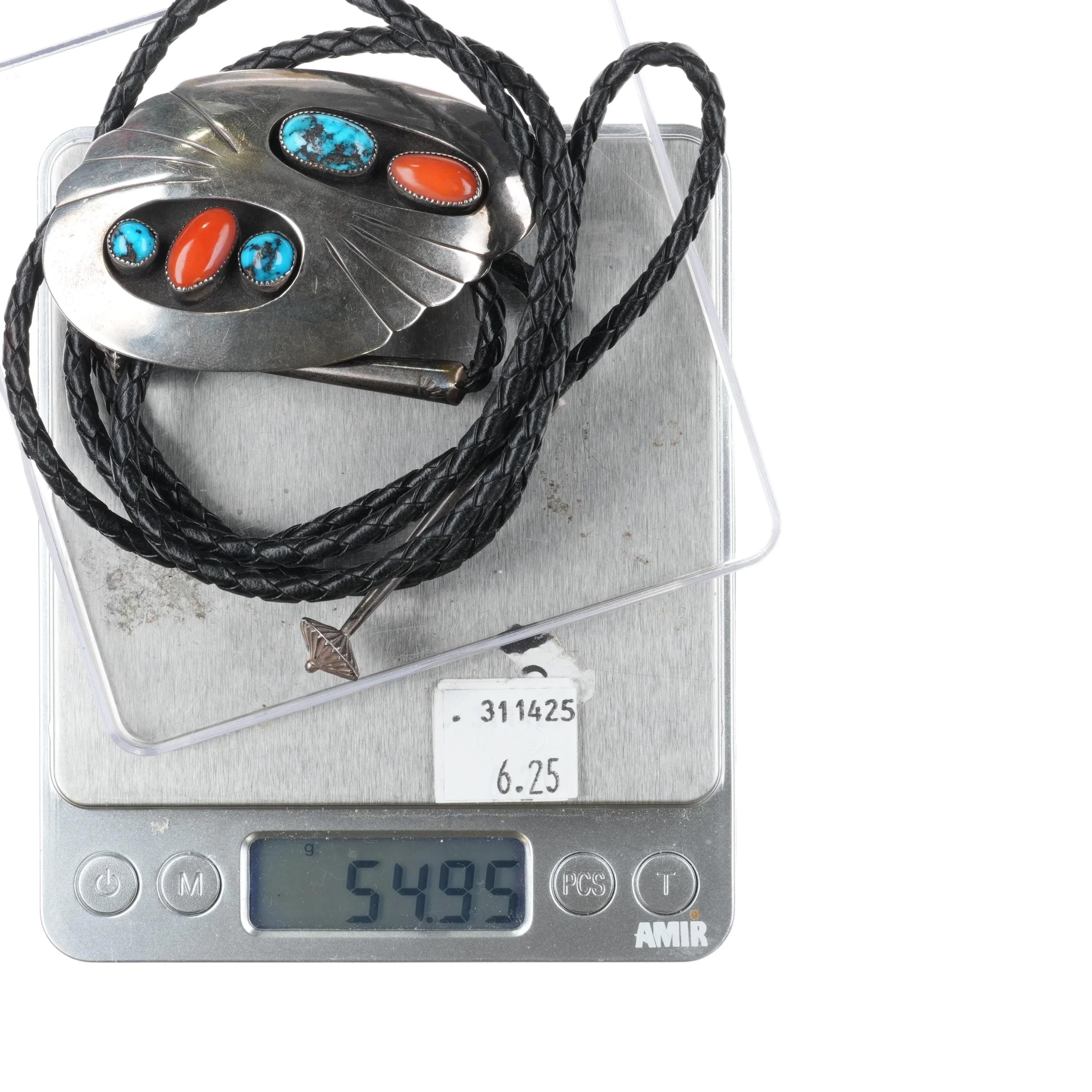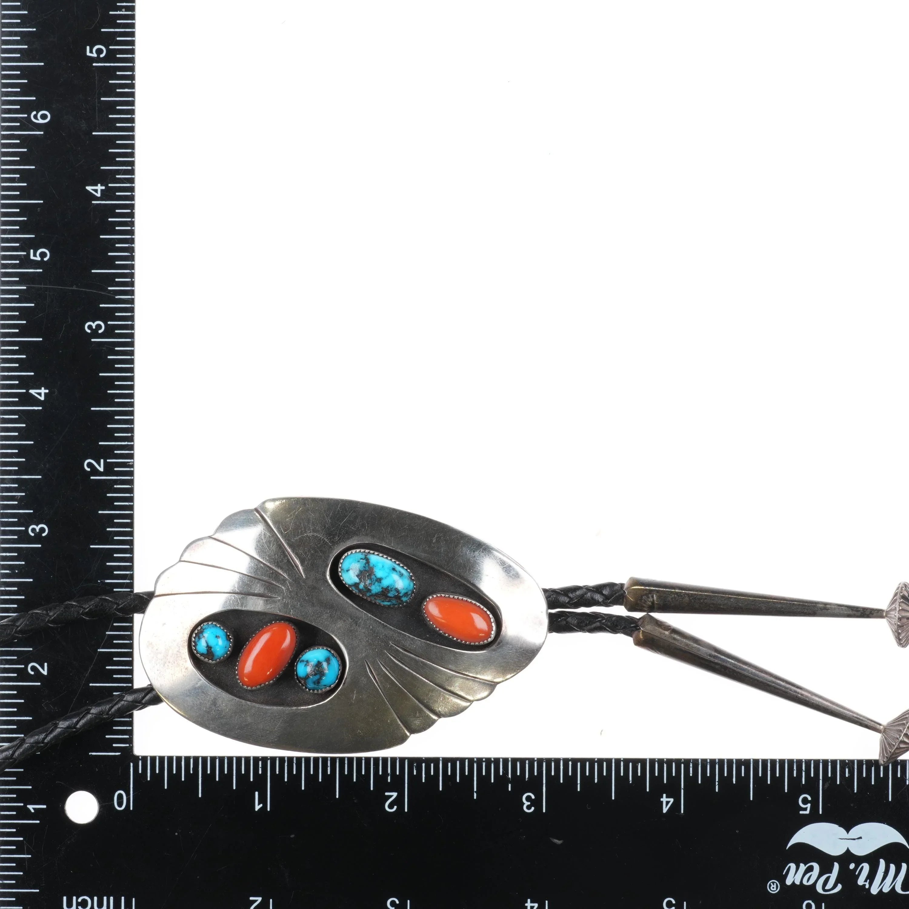 c1960 c-31 Bisbee turquoise/Mediterranean coral sterling silver Navajo bolo tie. Tested and guaranteed solid sterling silver slide and tips. Weight and measurements in pictures. Great bolo, 44" long with no issues. Tray is tared out, so weight shown is just the bolo of course.