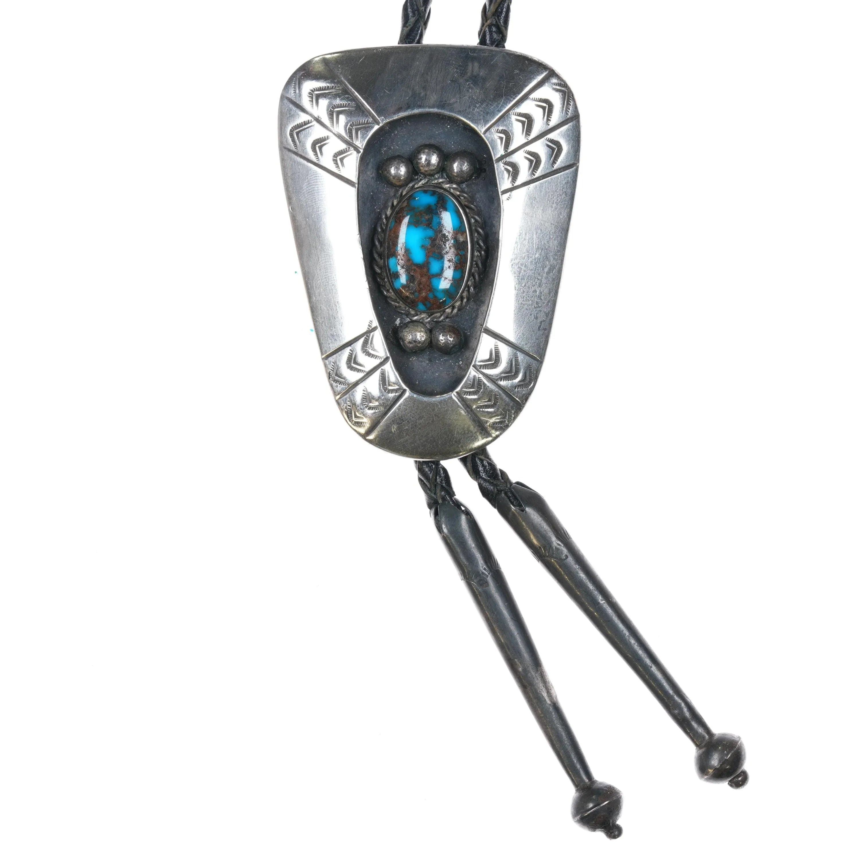 c1960 c-31 High Grade Bisbee turquoise Navajo sterling silver shadowbox bolo tie