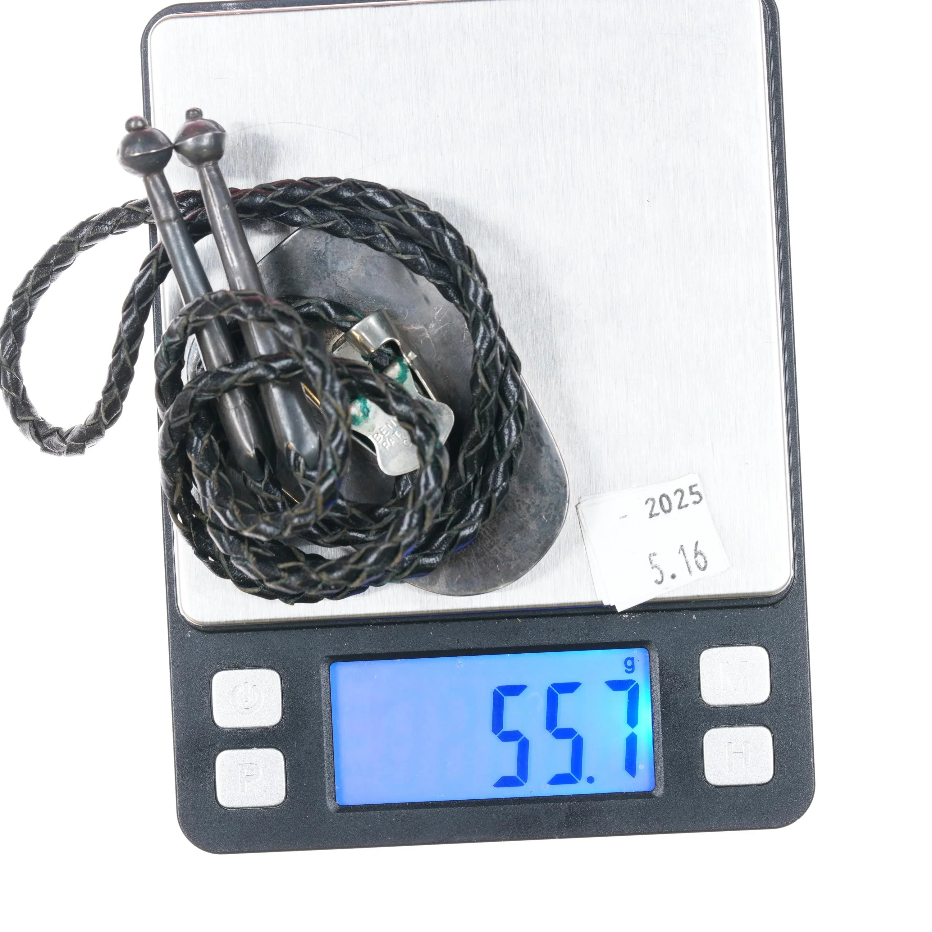c1960 c-31 High Grade Bisbee turquoise Navajo sterling silver shadowbox bolo tie. Solid sterling silver (tested) with no issues. Weight and measurements in pictures. Overall good condition, tested sterling, unmarked.