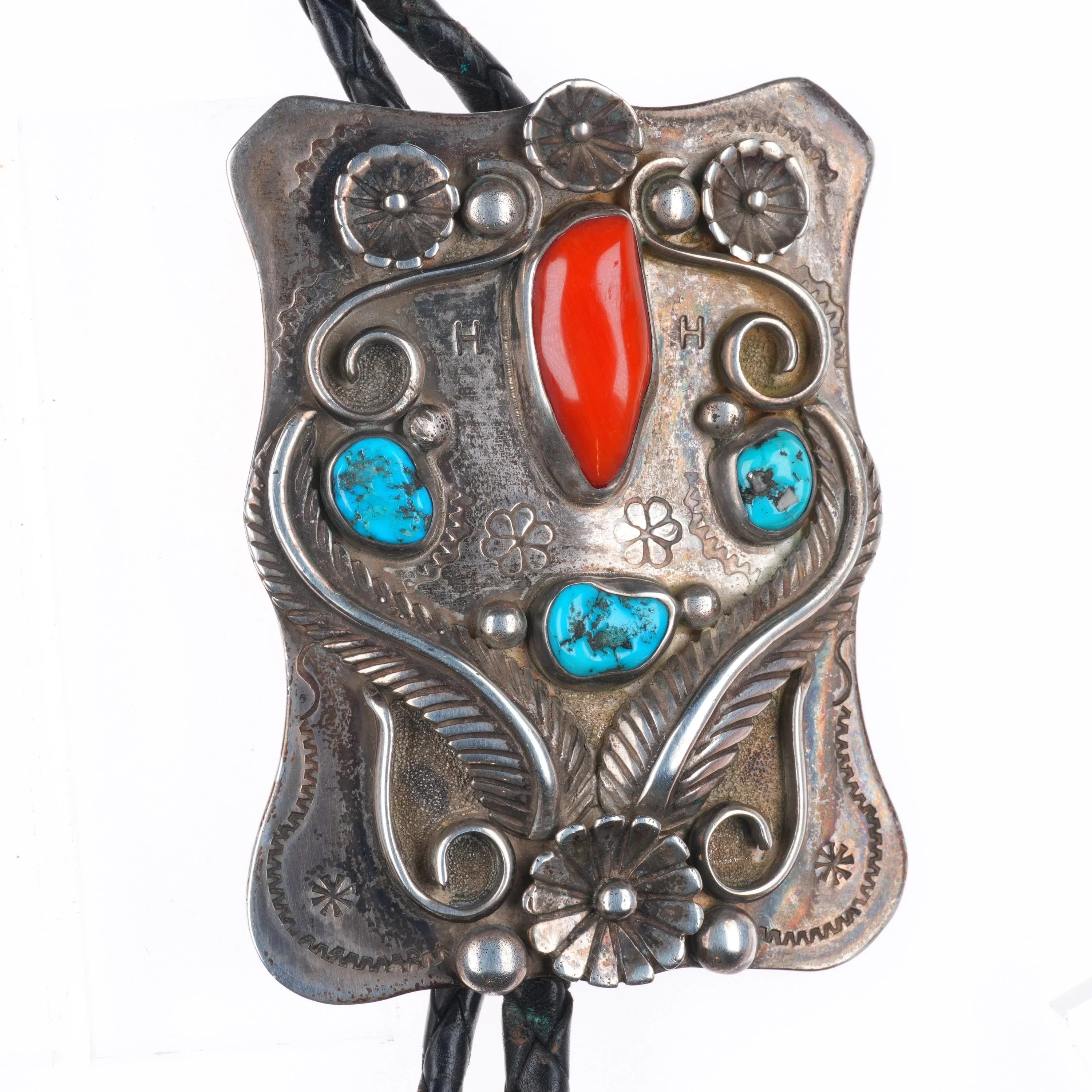 c1960 c-31 Navajo sterling silver, turquoise/coral large bolo tie Tested and guaranteed solid sterling silver slide and tips. Weight and measurements in pictures. Great bolo, 37" long with no issues. Tray is tared out, so weight shown is just the bolo of course. Unknown maker, illegibly marked.