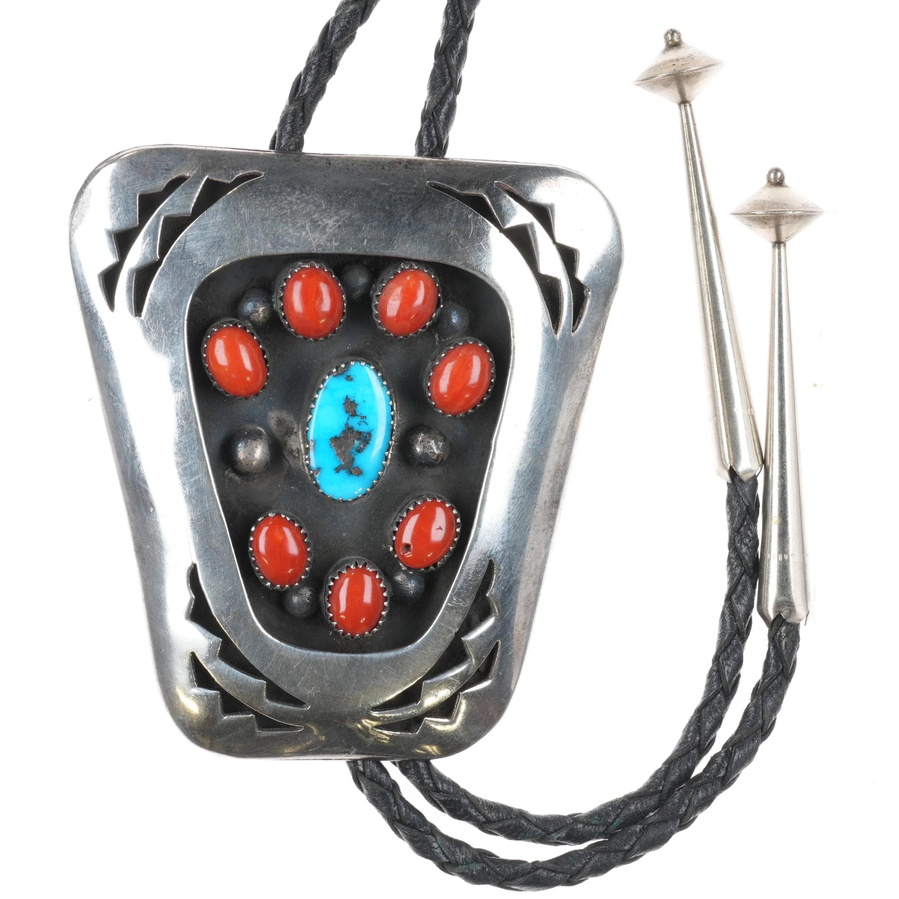 c1960 c-31 Southwest Modernist sterling silver coral cluster turquoise bolo tie