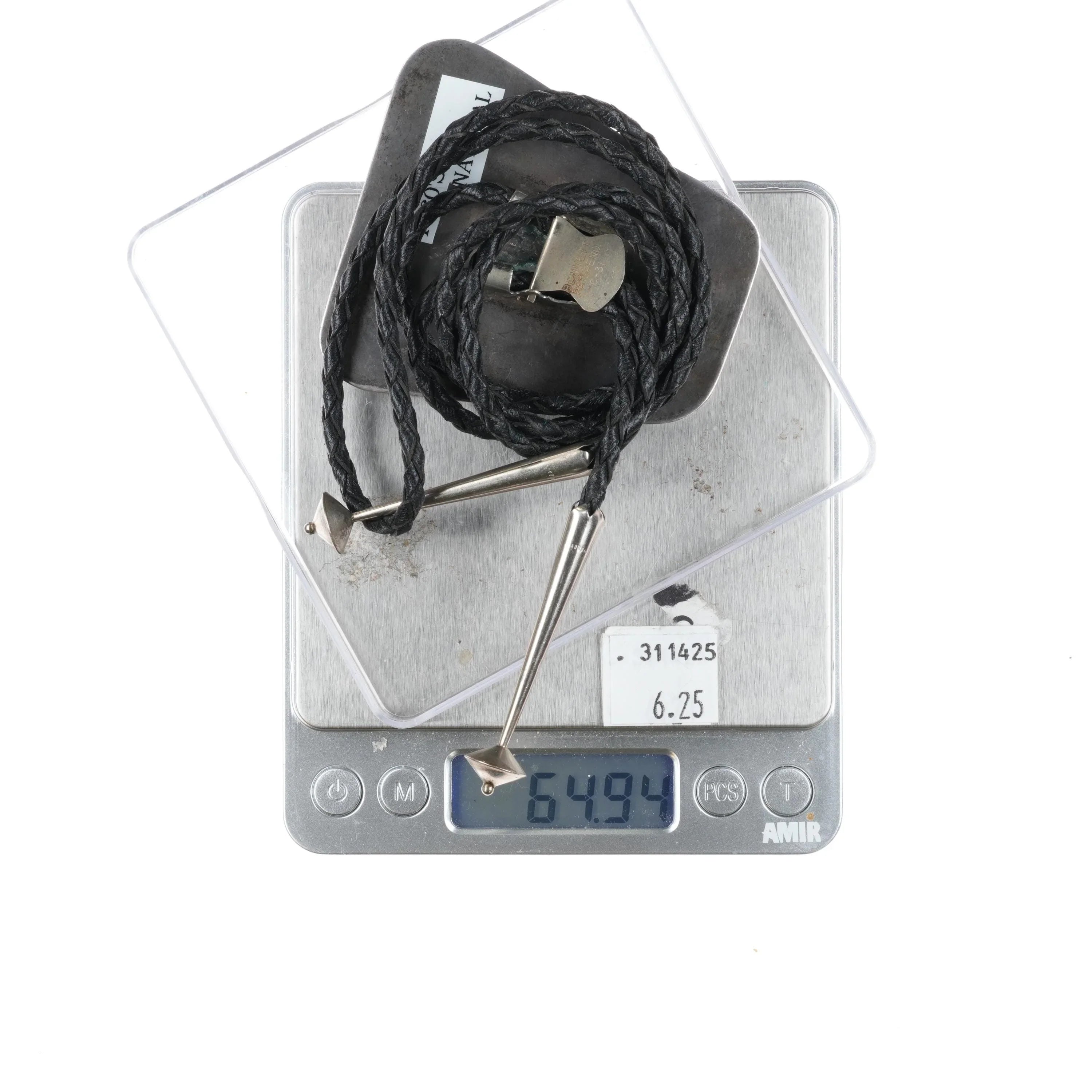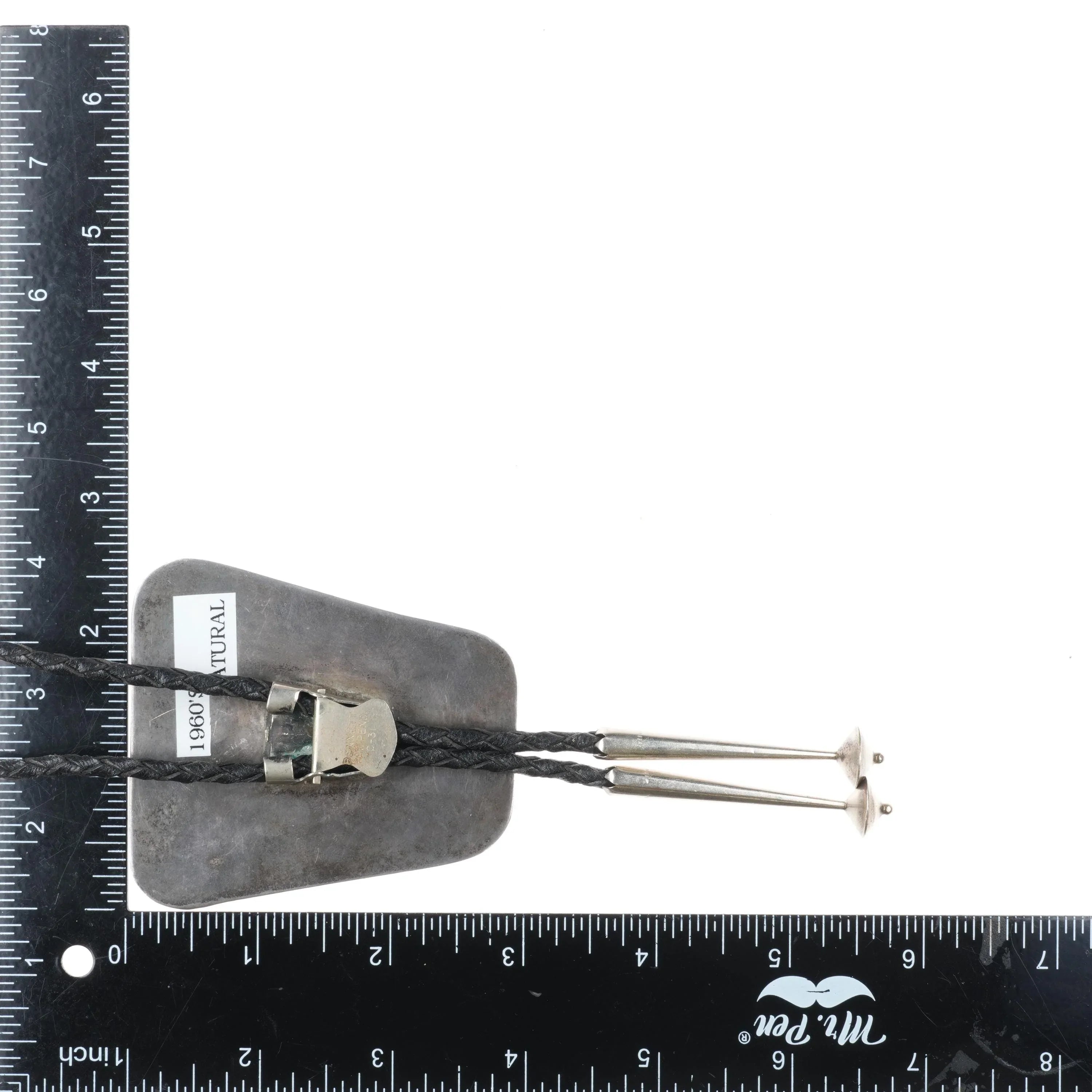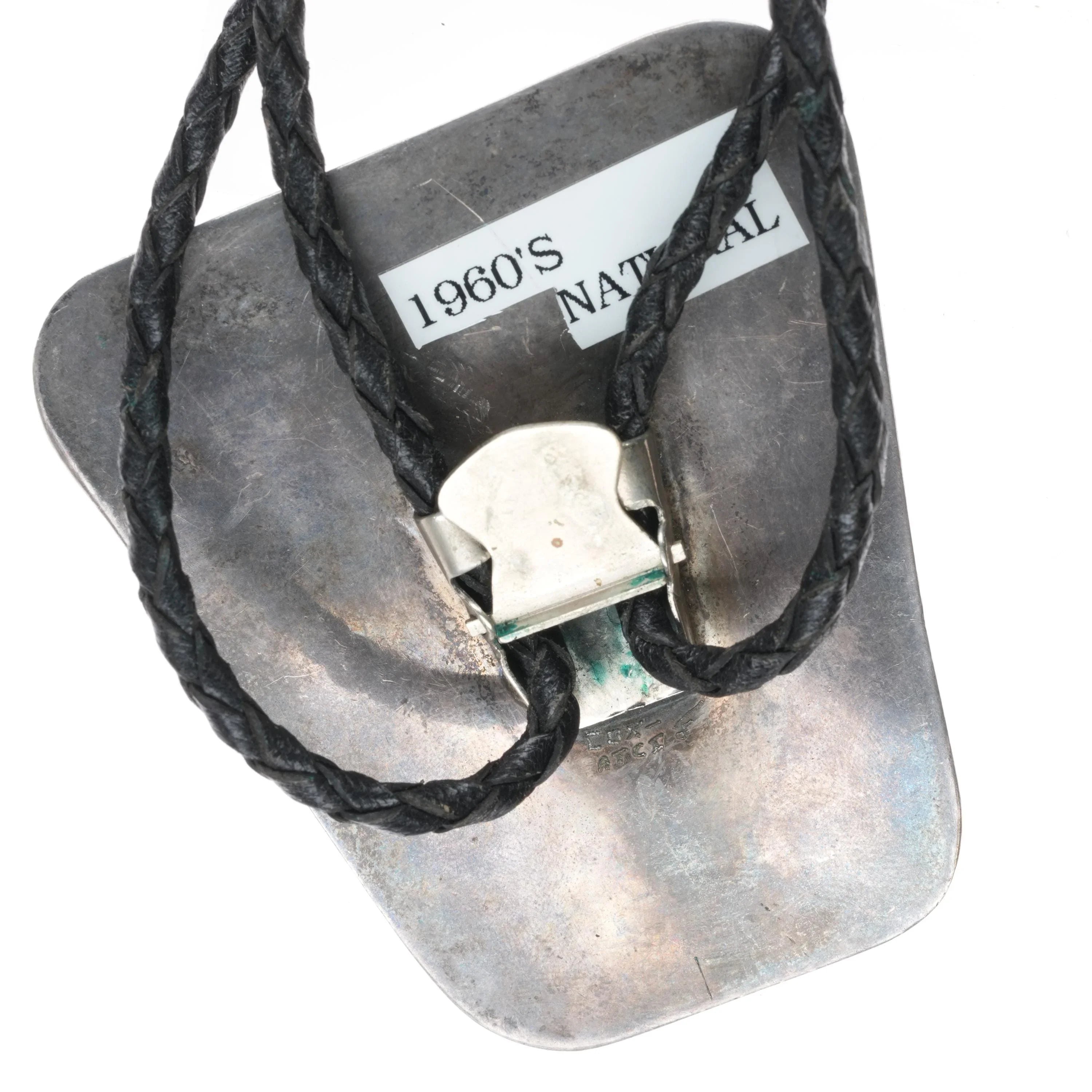 c1960 c-31 Southwest Modernist sterling silver coral cluster turquoise bolo tie. Tested and guaranteed solid sterling silver slide and tips. Weight and measurements in pictures. Great bolo, 39" long with no issues. No detectable markings, likely Native American made. Tray is tared out, so weight shown is just the bolo of course.