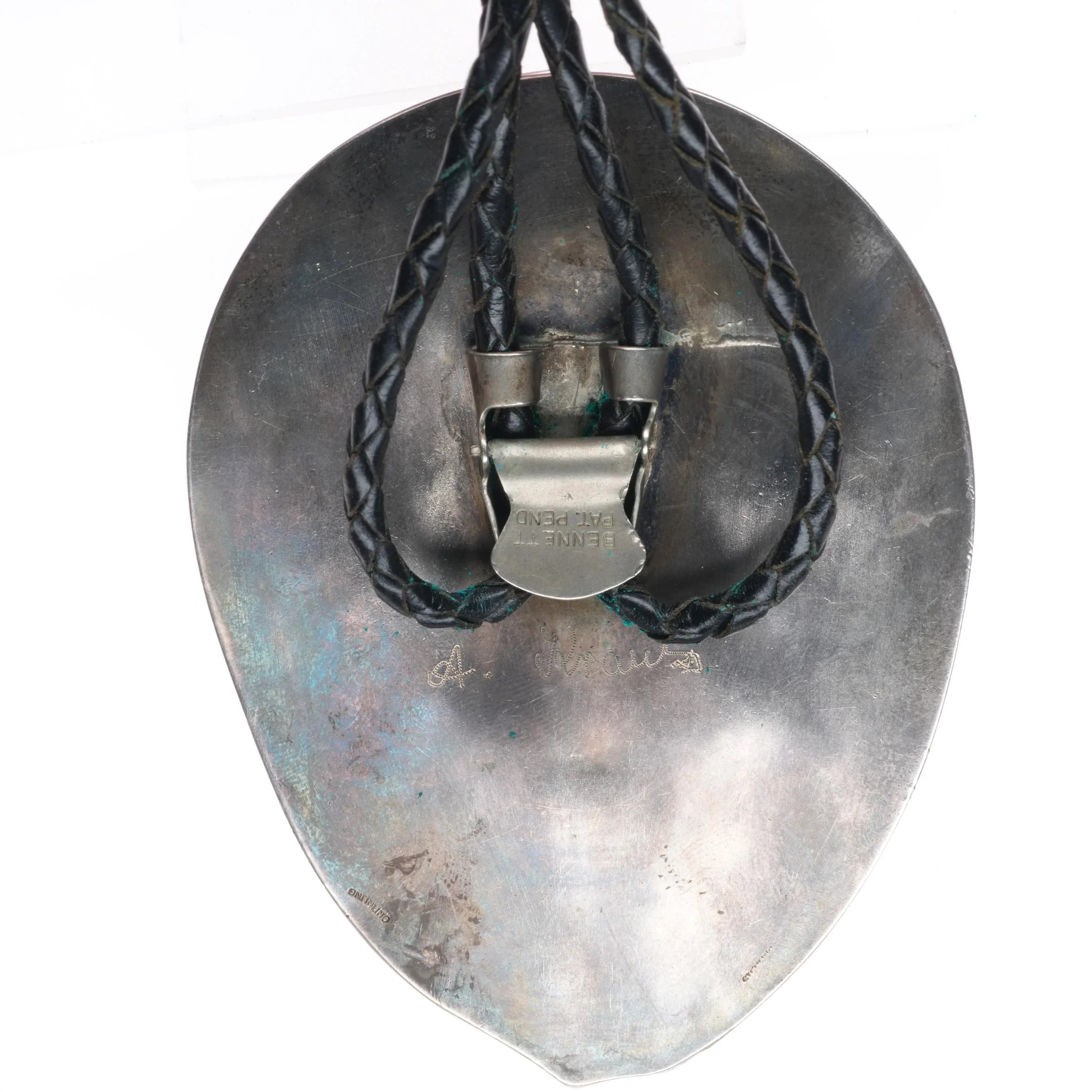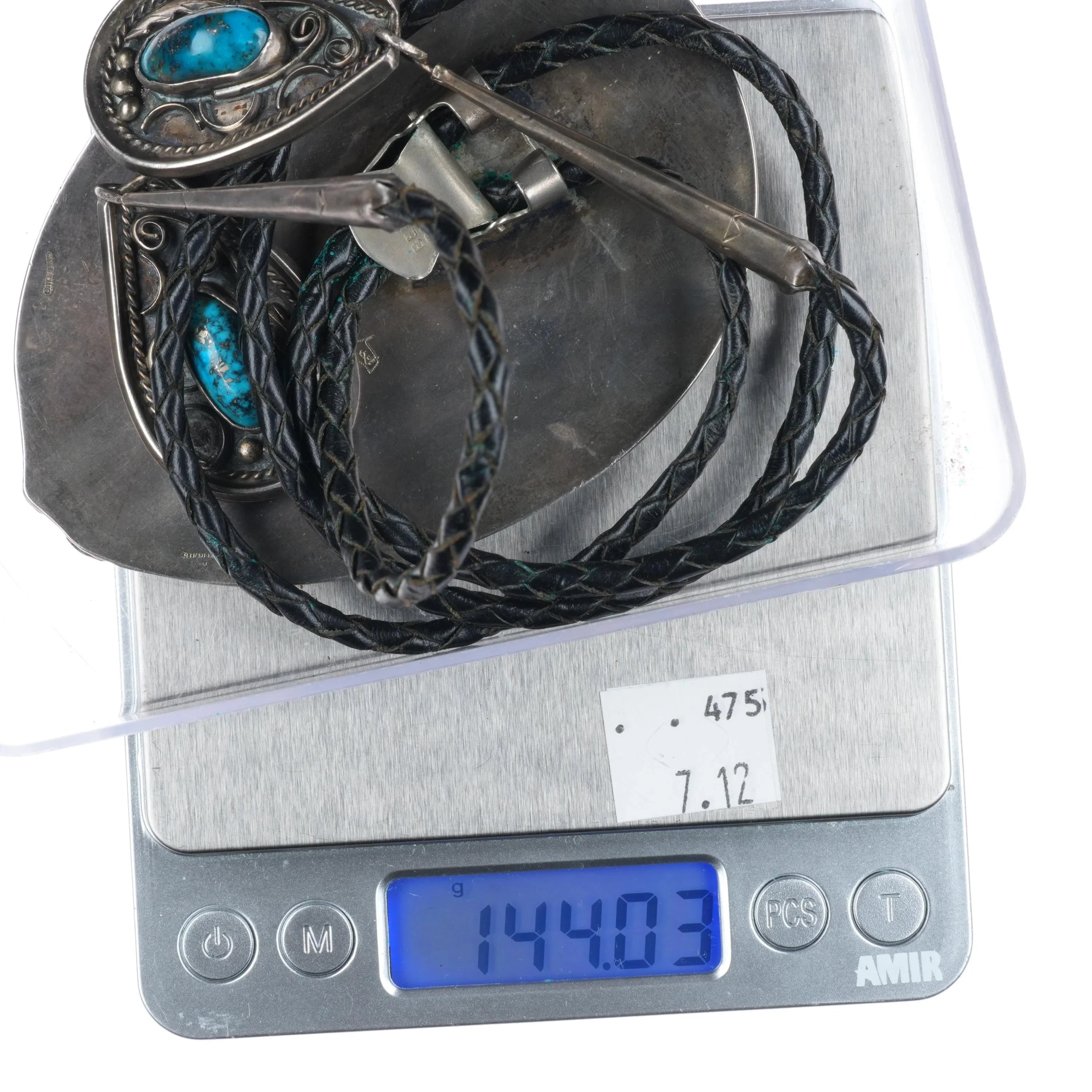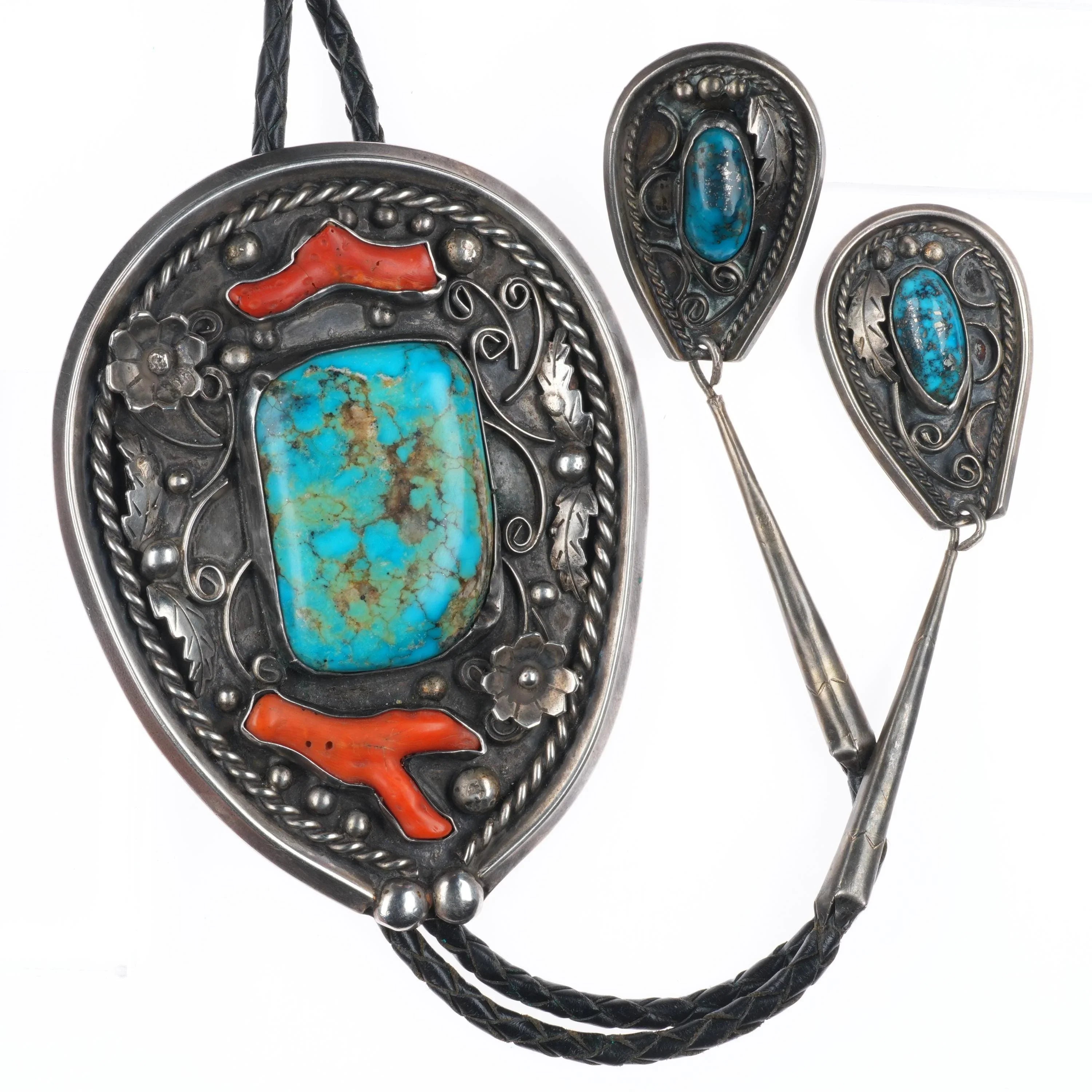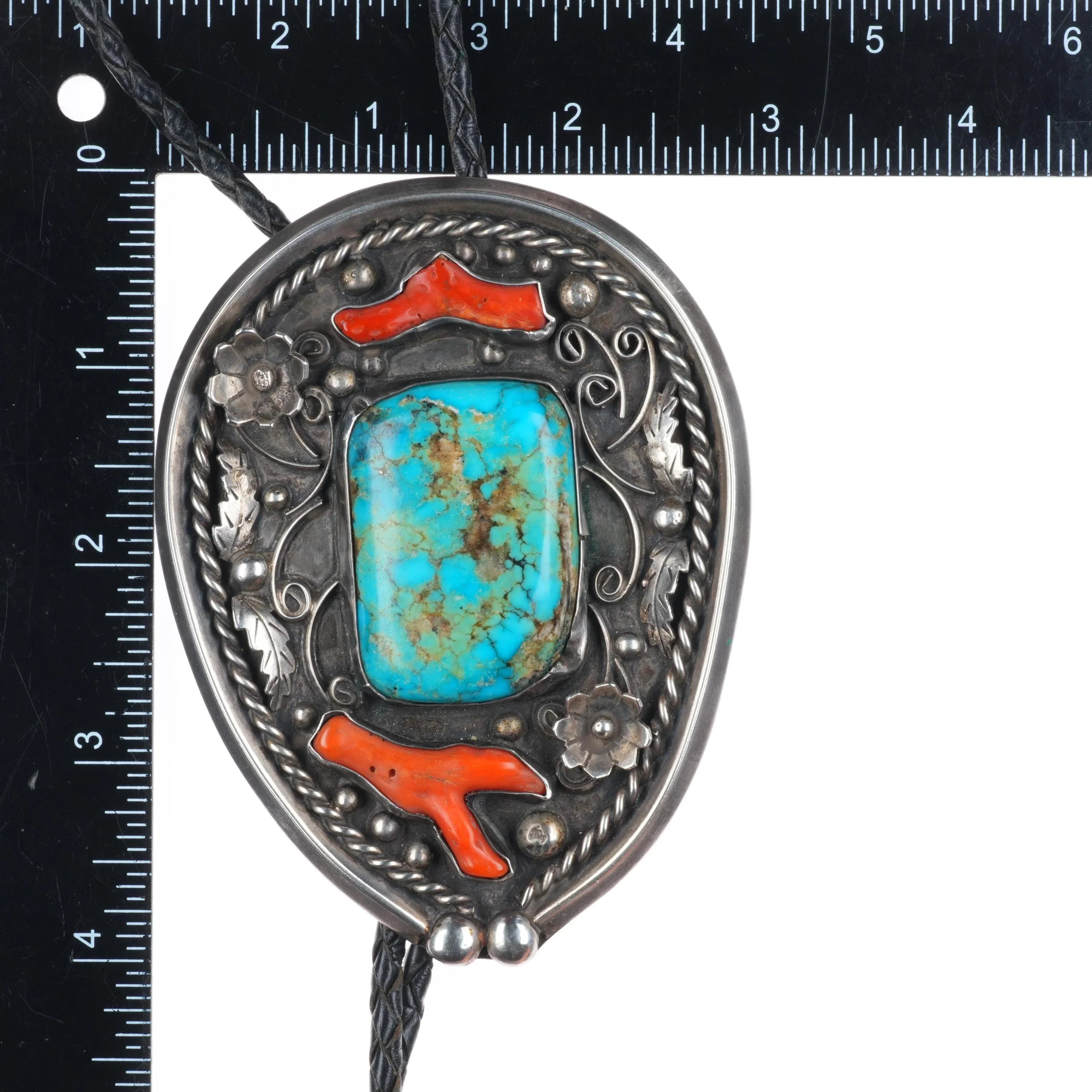 c1970 Huge Navajo Morenci turquoise tips branch coral sterling silver bolo tie. Tested and guaranteed solid sterling silver slide and tips. Weight and measurements in pictures. Great bolo, 43" long with no issues. Tray is tared out, so weight shown is just the bolo of course.
