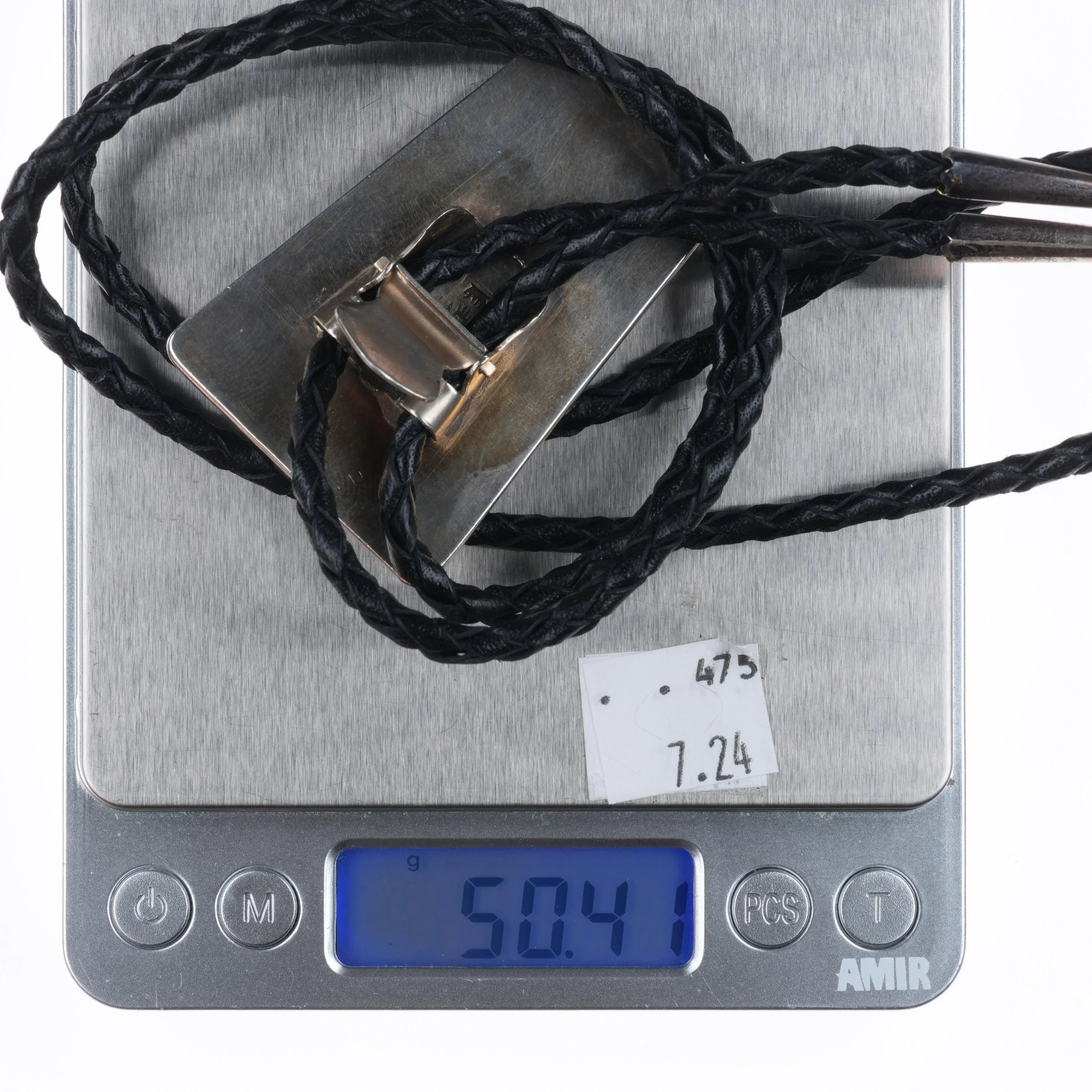 c1970 Navajo sterling silver turquoise inlay modernist bolo tie Gilbert Ortega shop. Tested and guaranteed solid sterling silver slide and tips. Weight and measurements in pictures. Great bolo, 37" long with no issues. Tray is tared out, so weight shown is just the bolo of course.