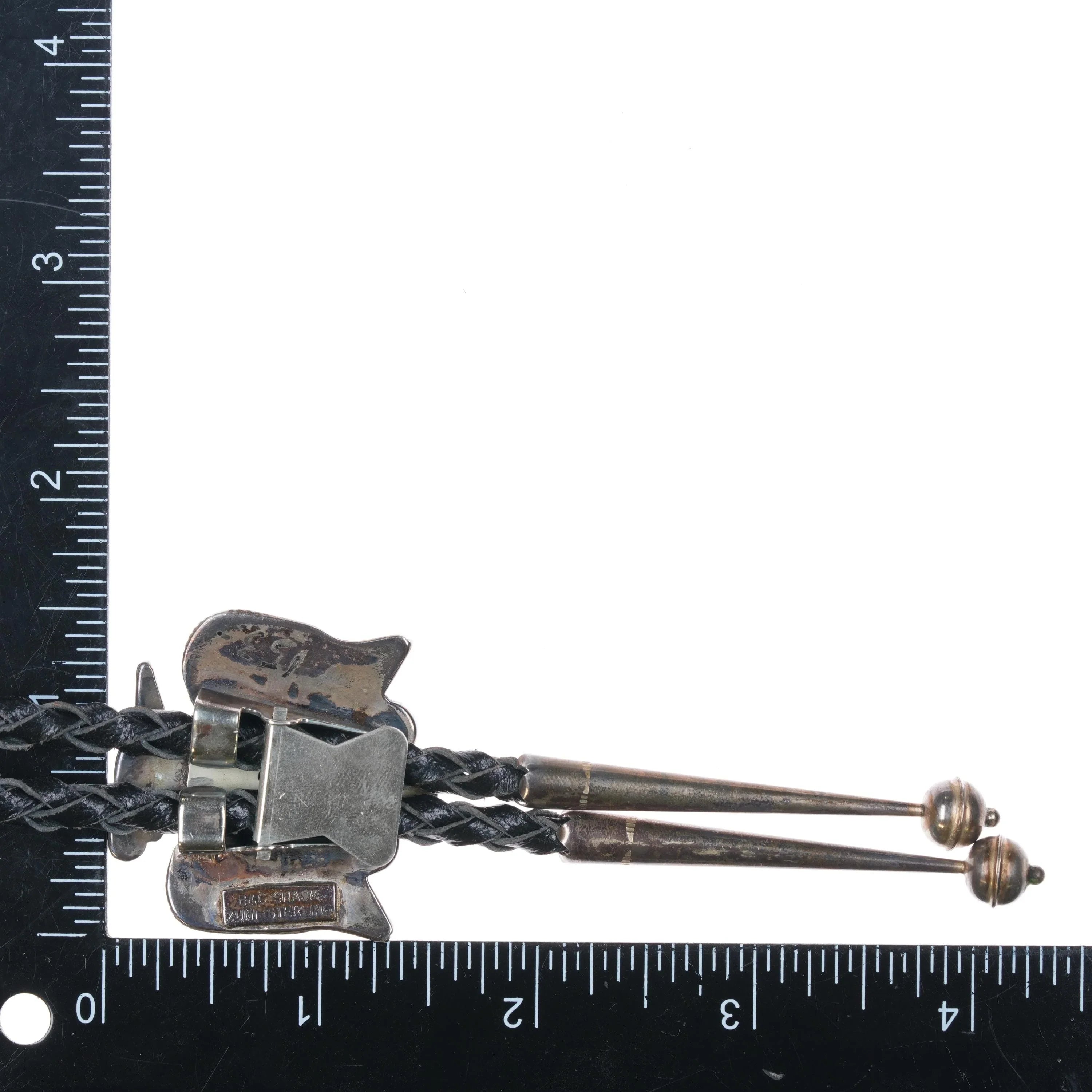 c1980 Vintage B&C Shack Zuni sterling silver thunderbird inlay bolo tie. Solid sterling silver slide and tips (tested). Weight and measurements in pictures. Great bolo with no issues. 39" long.